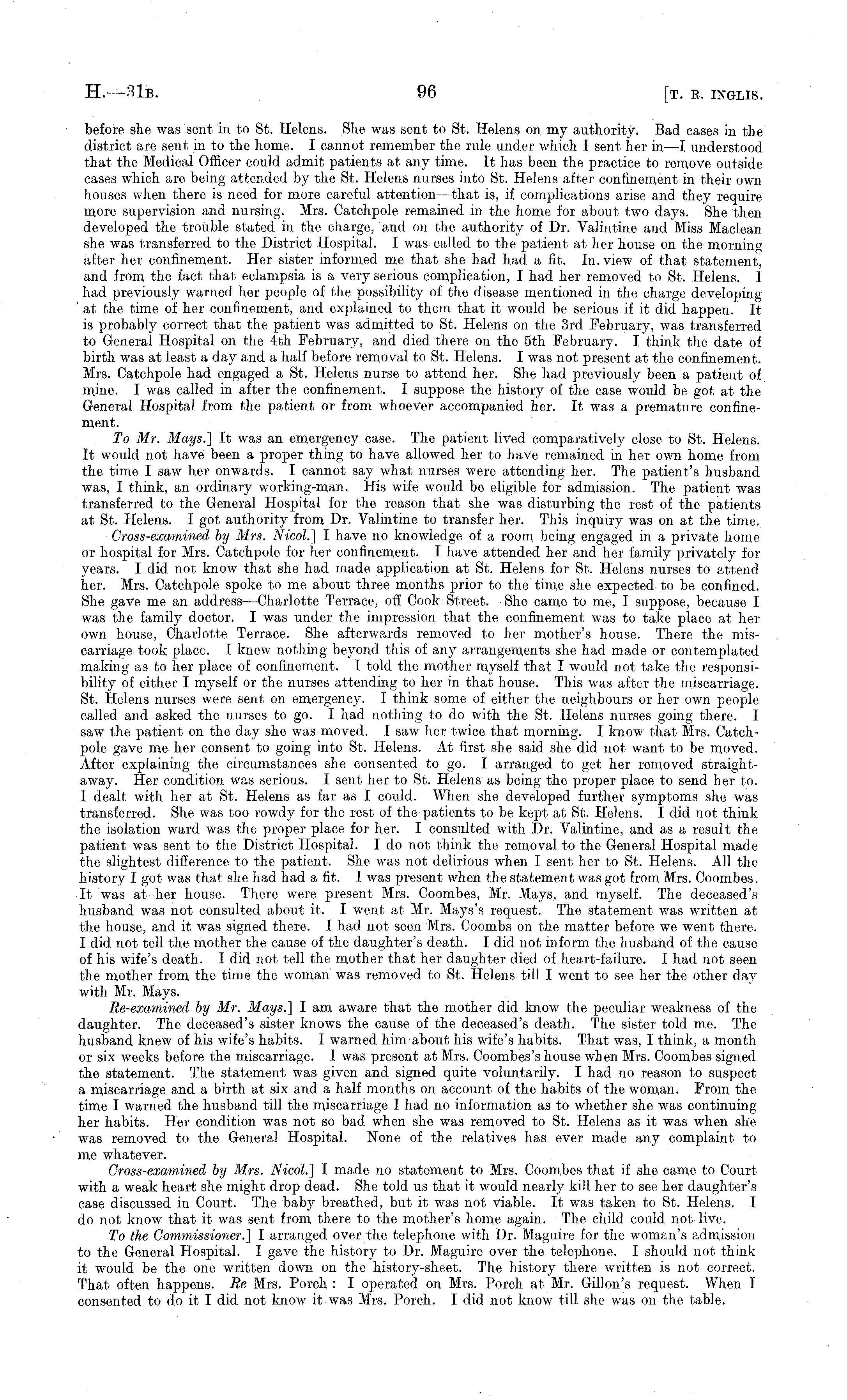 before she was sent in to St. Helens. She was sent to St. Helens on my authority. Bad cases in the district are sent in to the home. I cannot remember the rule under which I sent her in—l understood that the Medical Officer could admit patients at any time. It has been the practice to remove outside cases which are being attended by the St. Helens nurses into St. Helens after confinement in their own houses when there is need for more careful attention—that is, if complications arise and they require more supervision and nursing. Mrs. Catchpole remained in the home for about two days. She then developed the trouble stated in the charge, and on the authority of Dr. Valintine and Miss Maclean she was transferred to the District Hospital. I was called to the patient at her house on the morning after her confinement. Her sister informed me that she had had a fit. In. view of that statement, and from the fact that eclampsia is a very serious complication, I had her removed to St. Helens. I had previously warned her people of the possibility of the disease mentioned in the charge developing 'at the time of her confinement, and explained to them that it would be serious if it did happen. It is probably correct that the patient was admitted to St. Helens on the 3rd February, was transferred to General Hospital on the 4th February, and died there on the sth February. I think the date of birth was at least a day and a half before removal to St. Helens. I was not present at the confinement. Mrs. Catchpole had engaged a St. Helens nurse to attend her. She had previously been a patient of mine. I w 7 as called in after the confinement. I suppose the history of the case would be got at the General Hospital from the patient or from whoever accompanied her. It was a premature confinement. To Mr. Mays.] It was an emergency case. The patient lived comparatively close to St. Helens. It would not have been a proper thing to have allowed her to have remained in her own home from the time I saw her onwards. I cannot say what nurses were attending her. The patient's husband was, I think, an ordinary working-man. His wife would be eligible for admission. The patient was transferred to the General Hospital for the reason that she was disturbing the rest of the patients at St. Helens. I got authority from Dr. Valintine to transfer her. This inquiry was on at the time. Cross-examined by Mrs. Nicol.] I have no knowledge of a room being engaged in a private home or hospital for Mrs. Catchpole for her confinement. I have attended her and her family privately for years. I did not know that she had made application at St. Helens for St. Helens nurses to attend her. Mrs. Catchpole spoke to me about three months prior to the time she expected to be confined. She gave me an address —Charlotte Terrace, off Cook Street. She came to me, I suppose, because I was the family doctor. I was under the impression that the confinement was to take place at her own house, Charlotte Terrace. She afterwards removed to her mother's house. There the miscarriage took place. I knew 7 nothing beyond this of any arrangements she had made or contemplated making as to her place of confinement. I told the mother myself that I would not take the responsibility of either I myself or the nurses attending to her in that house. This was after the miscarriage. St. Helens nurses were sent on emergency. I think some of either the neighbours or her own people called, and asked the nurses to go. I had nothing to do with the St. Helens nurses going there. I saw the patient on the day she was moved, I saw her twice that morning. I know that Mrs. Catchpole gave me her consent to going into St. Helens. At first she said she did not want to be moved. After explaining the circumstances she consented to go. I arranged to get her removed straightaway. Her condition was serious. I sent her to St. Helens as being the proper place to send her to. I dealt with her at St. Helens as far as I could. When she developed further symptoms she was transferred. She was too rowdy for the rest of the patients to be kept at St. Helens. I did not think the isolation ward was the proper place for her. I consulted with Dr. Valintine, and as a result the patient was sent to the District Hospital, Ido not think the removal to the General Hospital made the slightest difference to the patient. She was not delirious when I sent her to St. Helens. All the history I got was that she had had a fit. I w r as present when the statement was got from Mrs. Coombes. It was at her house. There were present Mrs. Coombes, Mr. Mays, and myself. The deceased's husband was not consulted about it. I went at Mr. Mays's request. The statement was written at the house, and it was signed there. I had not seen Mrs. Coombs on the matter before we went there. I did not tell the mother the cause of the daughter's death. I did not inform the husband of the cause of his wife's death. I did not tell the mother that her daughter died of heart-failure. I had not seen the mother from the time the woman was removed to St. Helens till I went to see her the other day with Mr. Mays. Re-examined by Mr. Mays.] I am aware that the mother did know the peculiar weakness of the daughter. The deceased's sister knows the cause of the deceased's death. The sister told me. The husband knew of his wife's habits. I warned him about his wife's habits. That was, I think, a month or six weeks before the miscarriage. I was present at Mrs. Coombes's house when Mrs. Coombes signed the statement. The statement was given and signed quite voluntarily. I had no reason to suspect a miscarriage and a birth at six and a half months on account of the habits of the woman. From the time I w 7 arned the husband till the miscarriage I had no information as to whether she was continuing her habits. Her condition was not so bad when she was removed to St. Helens as it was when she was removed to the General Hospital. None of the relatives has ev