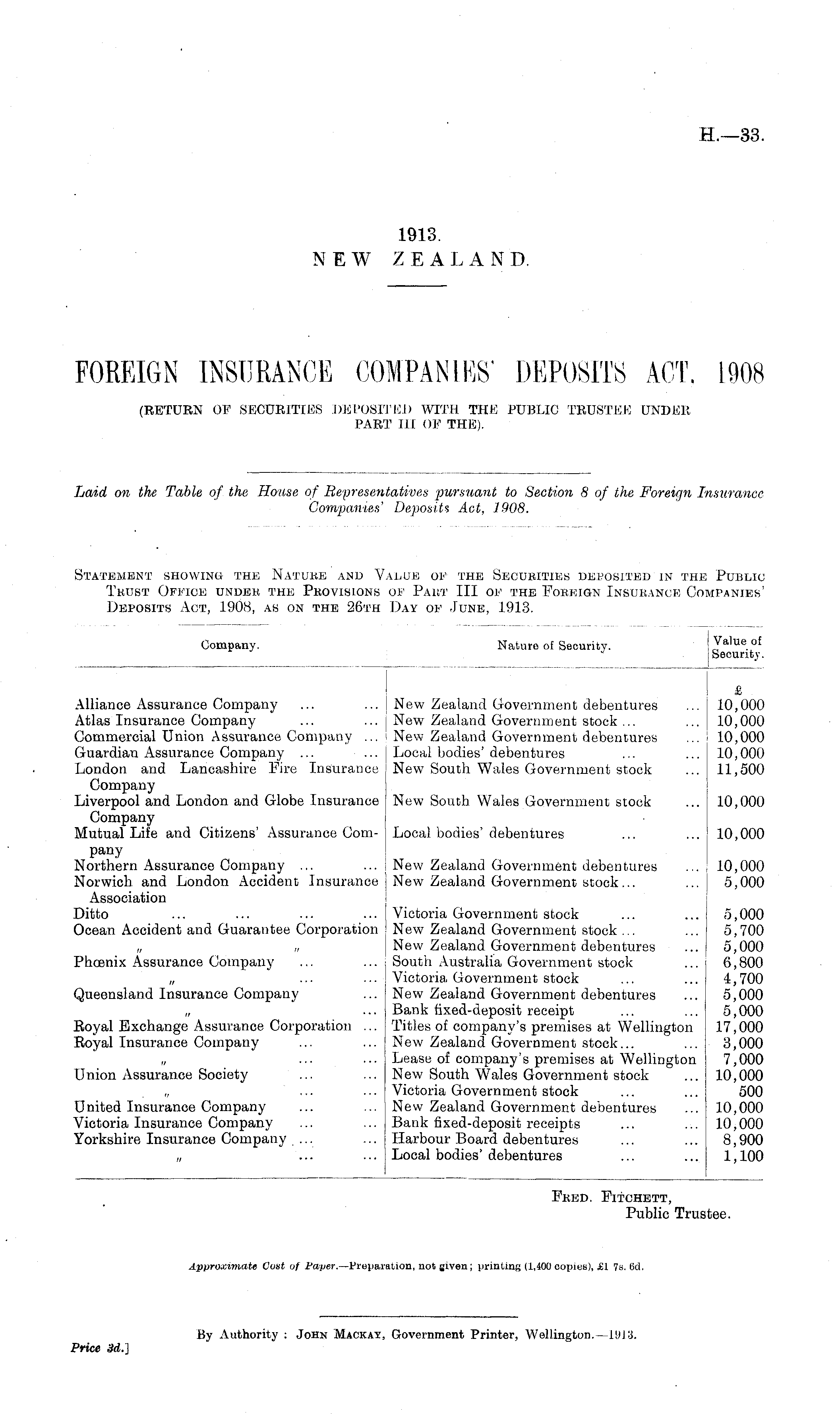 Laid on the Table of the, House of Representatives pursuant to Section 8 of the Foreign Insurance Companies' Deposits Act, 1908.