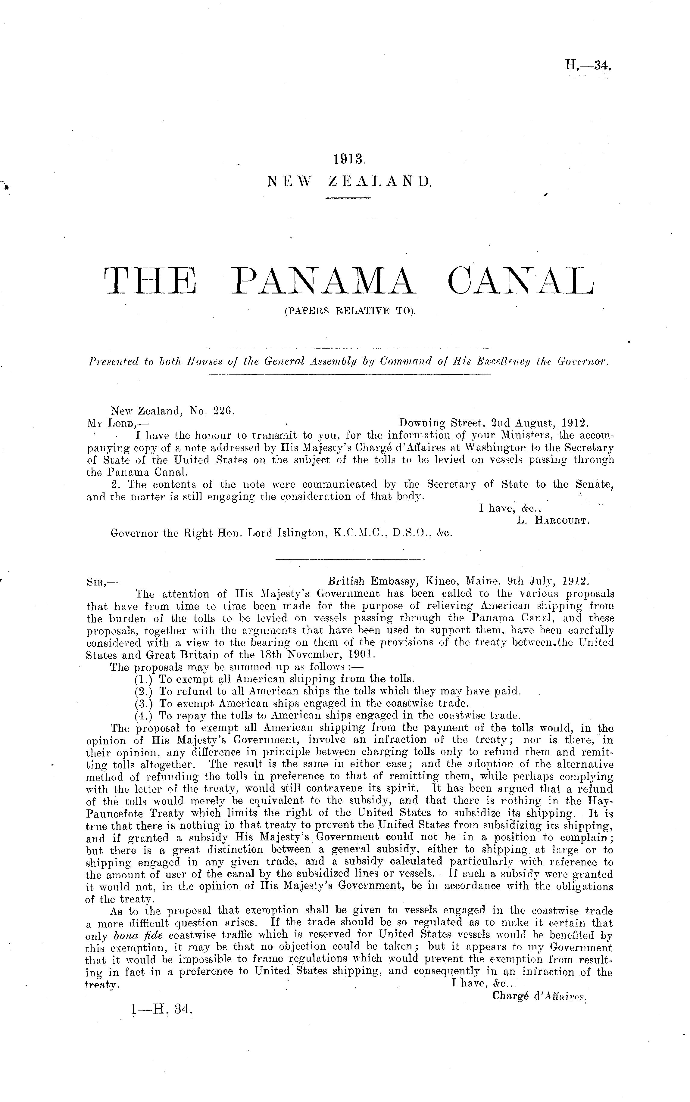 New Zealand, No. 226. Mγ Lord, — ■ Downing Street, 2nd August, 1912. I have the honour to transmit to you, for the information of your Ministers, the accompanying copy of a note addressed by His Majesty's Charge d'Affaires at Washington to the Secretary of State of the United States on the subject of the tolls to bo levied on vessels passing through the Panama Canal. 2. The contents of the note were communicated by the Secretary of State to the Senate, and the matter is still engaging the consideration of that body. I have, &c, L. Harcourt. Governor the Right Hon. Lord Islington, K.C.M.G., D.5.0., etc.