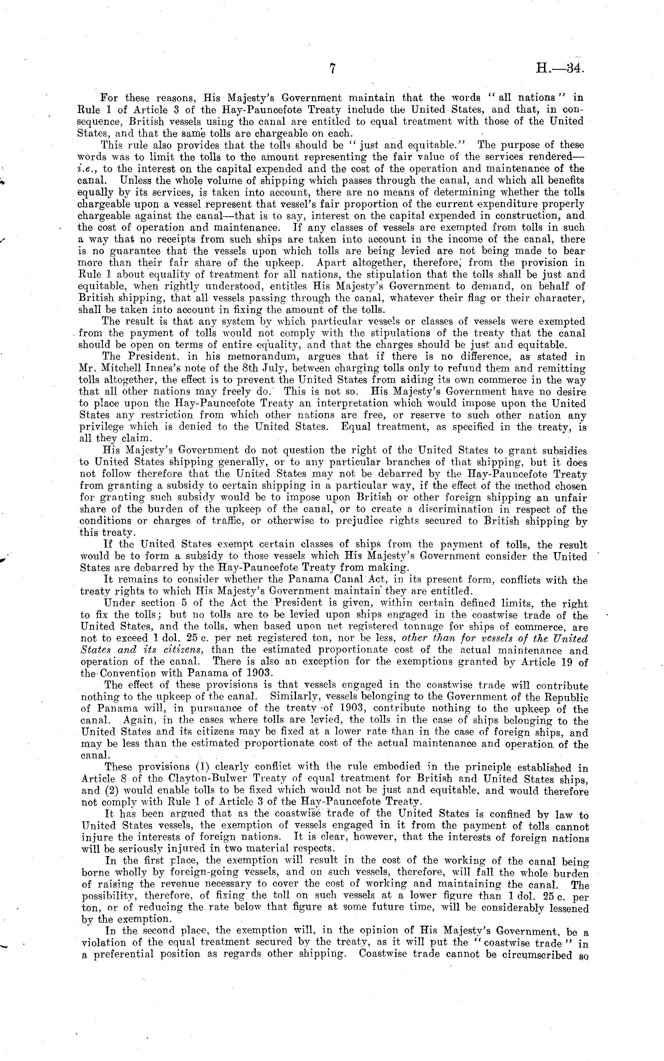For these reasons, His Majesty's Government maintain that the words " all nations " in Kule 1 of Article 3 of the Hay-Pauncefote Treaty include the United States, and that, in consequence, British vessels using the canal are entitled to equal treatment with those of the United States, and that the same tolls are chargeable on each. This rule also provides that the tolls should be " just and equitable." The purpose of these words was to limit the tolls to the amount representing the fair value of the services rendered — i.e., to the interest on the capital expended and the cost of the operation and maintenance of the canal. Unless the whole volume of shipping which passes through the canal, and which all benefits equally by its services, is taken into account, there are no means of determining whether the tolls chargeable upon a vessel represent that vessel's fair proportion of the current expenditure properly chargeable against the canal —that is to say, interest on the capital expended in construction, and the cost of operation and maintenance. If any classes of vessels are exempted from tolls in such a way that no receipts from such ships are taken into account in the income of the canal, there is no guarantee that the vessels upon which tolls are being levied are not being made to bear more than their fair share of the upkeep. Apart altogether, therefore,' from the provision in Rule 1 about equality of treatment for all nations, the stipulation that the tolls shall be just and equitable, when rightly understood, entitles His Majesty's Government to demand, on behalf of British shipping, that all vessels passing through the canal, whatever their flag or their character, shall be taken into account in fixing the amount of the tolls. The result is that any system by which particular vessels or classes of vessels were exempted from the payment of tolls would not comply with the stipulations of the treaty that the canal should be open on terms of entire equality, and that the charges should be just and equitable. The President, in his memorandum, argues that if there is no difference, as stated in Mr. Mitchell Innes's note of the Bth July, between charging tolls only to refund them and remitting tolls altogether, the effect is to prevent the United States from aiding its own commerce in the way that all other nations may freely do.' This is not so. His Majesty's Government have no desire to place upon the Hay-Pauncefote Treaty an interpretation which would impose upon the United States any restriction from which other nations are free, or reserve to such other nation any privilege which is denied to the United States. Equal treatment, as specified in the treaty, is all they claim. His Majesty's Government do not question the right of the United States to grant subsidies to United States shipping generally, or to any particular branches of that shipping, but it does not follow therefore that the United States may not be debarred by the Hay-Pauncefote Treaty from granting a subsidy to certain shipping in a particular way, if the effect of the method chosen for granting such subsidy would be to impose upon British or other foreign shipping an unfair share of the burden of the upkeep of the canal, or to create a discrimination in respect of the conditions or charges of traffic, or otherwise to prejudice rights secured to British shipping by this treaty. If the United States exempt certain classes of ships from the payment of tolls, the result would be to form a subsidy to those vessels which His Majesty's Government consider the United States are debarred by the Hay-Pauncefote Treaty from making. It remains to consider whether the Panama Canal Act, in its present form, conflicts with the treaty rights to which His Majesty's Government maintain' they are entitled. Under section 5 of the Act the President is given, within certain defined limits, the right to fix the tolls; but no tolls are to be levied upon ships engaged in the coastwise trade of the United States, and the tolls, when based upon net registered tonnage for ships of commerce, are not to exceed 1 dol. 25 c. per net registered ton, nor be less, other than for vessels of the United States and its citizens, than the estimated proportionate cost of the actual maintenance and operation of the canal. There is also an exception for the exemptions granted by Article 19 of the Convention with Panama of 1903. The effect of these provisions is that vessels engaged in the coastwise trade will contribute nothing to the upkeep of the canal. Similarly, vessels belonging to the Government of the Republic of Panama will, in pursuance of the treaty -of 1903, contribute nothing to the upkeep of the canal. Again, in the cases where tolls are levied, the tolls in the case of ships belonging to the United States and its citizens may be fixed at a lower rate than in the case of foreign ships, and may be less than the estimated proportionate cost of the actual maintenance and operation, of the canal. These provisions (1) clearly conflict with the rule embodied in the principle established in Article 8 of the Clayton-Bulwer Treaty of equal treatment for British and United States ships, and (2) would enable tolls to be fixed which would not be just and equitable, and would therefore not comply with Rule 1 of Article 3 of the Hay-Pauncefote Treaty. It has been argued that as the coastwise trade of the United States is confined by law to United 'States vessels, the exemption of vessels engaged in it from the payment of tolls cannot injure the interests of foreign nations. It is clear, however, that the interests of foreign nations will be seriously injured in two material respects. In the first place, the exemption will result in the cost of the working of the canal being borne wholly by foreign-going vessels, and on such vessels, therefore, will fall the whole burden of raising the revenue necessary to cover the cost of working and maintaining the canal.