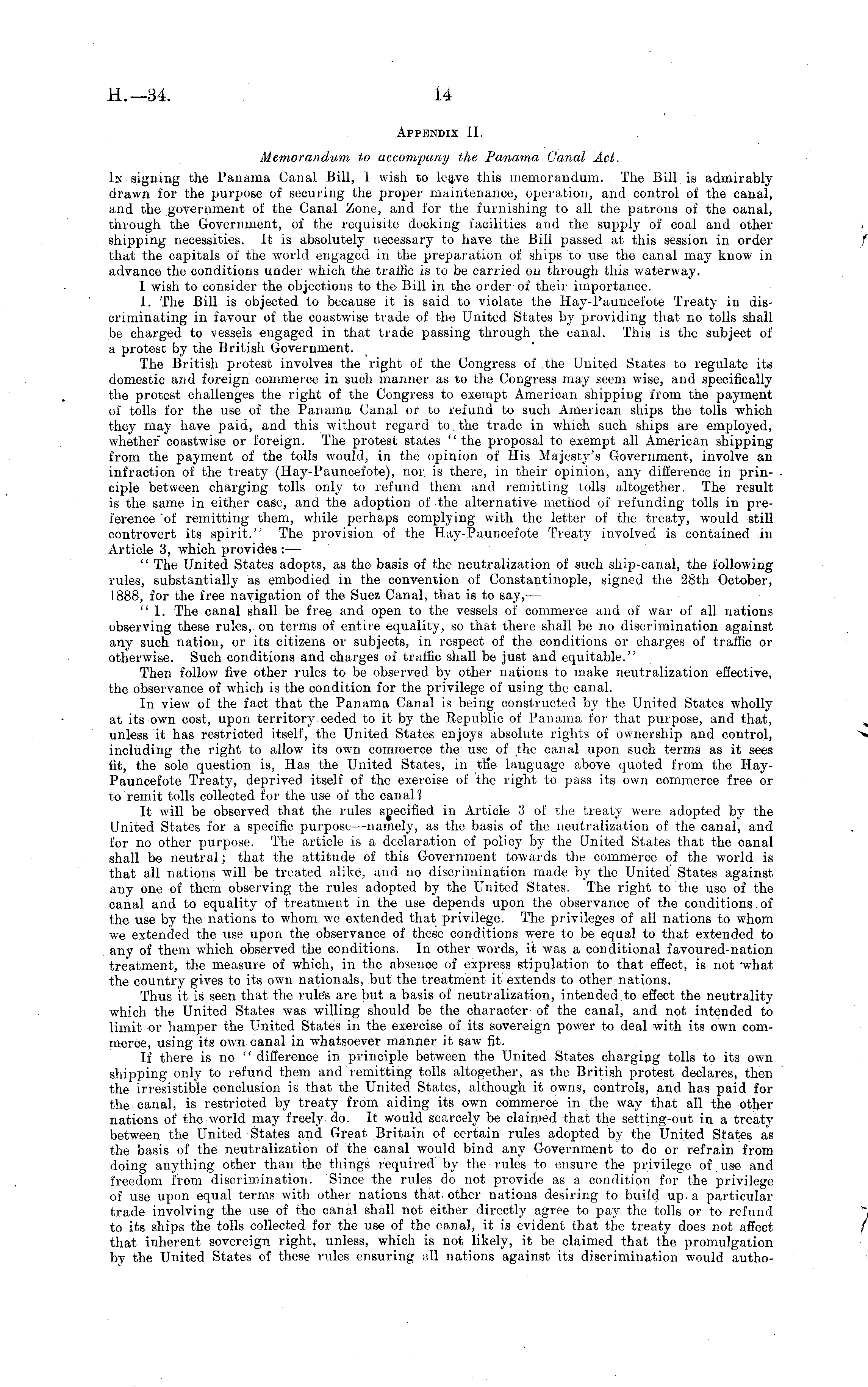 Appendix 11. Memorandum to accompany the Panama Canal Act. In signing the Panama Canal Bill, I wish to leave this memorandum. The Bill is admirably drawn for the purpose of securing the proper maintenance, operation, and control of the canal, and the government of the Canal Zone, and for the furnishing to all the patrons of the canal, through the Government, of the requisite docking facilities and the supply of coal and other shipping necessities. It is absolutely necessary to have the Bill passed at this session in order that the capitals of the world engaged in the preparation of ships to use the canal may know in advance the conditions under which the traffic is to be carried on through this waterway. I wish to consider the objections to the Bill in the order of their importance. 1. The Bill is objected to because it is said to violate the Hay-Pauncefote Treaty in discriminating in favour of the coastwise trade of the United States by providing that no tolls shall be charged to vessels engaged in that trade passing through the canal. This is the subject of a protest by the British Government. The British protest involves the right of the Congress of .the United States to regulate its domestic and foreign commerce in such manner as to the Congress may seem wise, and specifically the protest challenges the right of the Congress to exempt American shipping from the payment of tolls for the use of the Panama Canal or to refund to such American ships the tolls which they may have paid, and this without regard to. the trade in which such ships are employed, whether" coastwise or foreign. The protest states "the proposal to exempt all American shipping from the payment of the tolls would, in the opinion of His Majesty's Government, involve an infraction of the treaty (Hay-Paunoefote), nor is there, in their opinion, any difference in prin- . ciple between charging tolls only to refund them and remitting tolls altogether. The result is the same in either case, and the adoption of the alternative method of refunding tolls in preference of remitting them, while perhaps complying with the letter of the treaty, would still controvert its spirit." The provision of the Hay-Paunoefote Treaty involved is contained in Article 3, which provides : — " The United States adopts, as the basis of the neutralization of such ship-canal, the following rules, substantially as embodied in the convention of Constantinople, signed the 28th October, 1888, for the free navigation of the Suez Canal, that is to say,— "1. The canal shall be free and open to the vessels of commerce and of war of all nations observing these rules, on terms of entire equality, so that there shall be no discrimination against any such nation, or its citizens or subjects, in respect of the conditions or charges of traffic or otherwise. Such conditions and charges of traffic shall be just and equitable." Then follow five other rules to be observed by other , nations to make neutralization effective, the observance of which is the condition for the privilege of using the canal. In view of the fact that the Panama Canal is being constructed by the United States wholly at its own cost, upon territory ceded to it by the Republic of Panama for that purpose, and that, unless it has restricted itself, the United States enjoys absolute rights of ownership and control, including the right to allow its own commerce the use of the canal upon such terms as it sees fit, the sole question is, Has the United States, in tKe language above quoted from the HayPauncefote Treaty, deprived itself of the exercise of the right to pass its own commerce free or to remit tolls collected for the use of the canal? It will be observed that the rules specified in Article 3 of the treaty were adopted by the United States for a specific purpose —namely, as the basis of the neutralization of the canal, and for no other purpose. The article is a declaration of policy by the United States that the canal shall be neutral; that the attitude of this Government towards the commerce of the world is that all nations will be treated alike, and no discrimination made by the United States against any one of them observing the rules adopted by the United States. The right to the use of the canal and to equality of treatment in the use depends upon the observance of the conditions. of the use by the nations to whom we extended that privilege. The privileges of all nations to whom we extended the use upon the observance of these conditions were to be equal to that extended to any of them which observed the conditions. In other words, it was a conditional favoured-nation treatment, the measure of which, in the absence of express stipulation to that effect, is not "what the country gives to its own nationals, but the treatment it extends to other nations. Thus it is seen that the rule's are but a basis of neutralization, intended.to effect the neutrality which the United States was willing should be the character- of the canal, and not intended to limit or hamper the United States in the exercise of its sovereign power to deal with its own commerce, using its own canal in whatsoever manner it saw fit. If there is no " difference in principle between the United States charging tolls to its own shipping only to refund them and remitting tolls altogether, as the British protest declares, then the irresistible conclusion is that the United States, although it owns, controls, and has paid for the canal, is restricted by treaty from aiding its own commerce in the way that all the other nations of the world may freely do. It would scarcely be claimed that the setting-out in a treaty between the United States and Great Britain of certain rules adopted by the United States as the basis of the neutralization of the canal would bind any Government to do or refrain from doing anything other than the things required by the rules to ensure the privilege of use and freedom from discrimination. Sinc