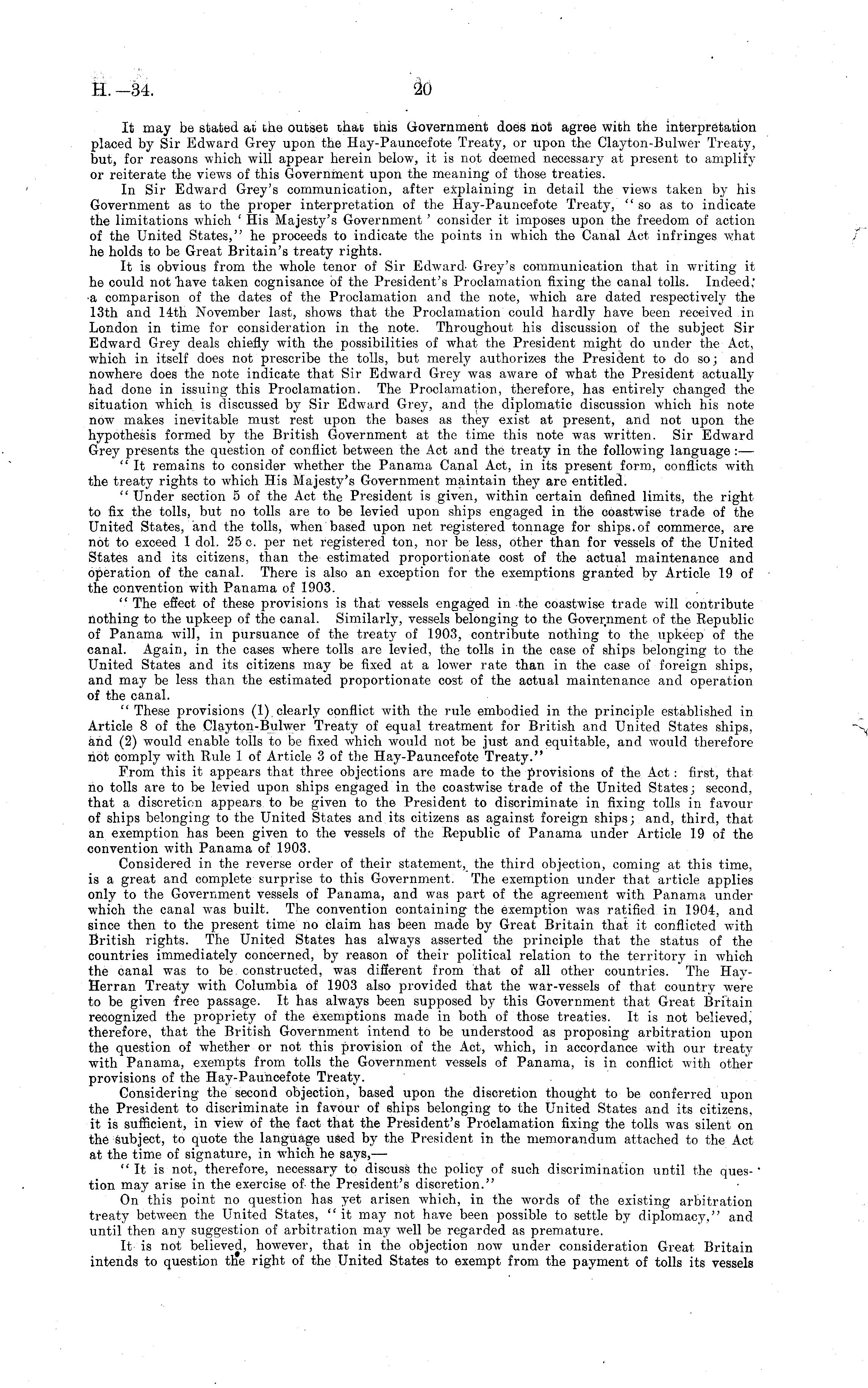 It may be stated at the outset that this Government does not agree with the interpretation placed by Sir Edward Grey upon the Hay-Pauncefote Treaty, or upon the Clayton-Burwer Treaty, but, for reasons which will appear herein below, it is not deemed necessary at present to amplify or reiterate the views of this Government upon the meaning of those treaties. In Sir Edward Grey's communication, after explaining in detail the views taken by his Government as to the proper interpretation of the Hay-Pauncefote Treaty, "so as to indicate the limitations which ' His Majesty's Government' consider it imposes upon the freedom of action of the United States," he proceeds to indicate the points in which the Canal Act infringes what he holds to be Great Britain's treaty rights. It is obvious from the whole tenor of Sir Edward Grey's communication that in writing it he could not Tiave taken cognisance of the President's Proclamation fixing the canal tolls. Indeed; ■a comparison of the dates of the Proclamation and the note, which are dated respectively the 13th and 14th November last, shows that the Proclamation could hardly have been received in London in time for consideration in the note. Throughout his discussion of the subject Sir Edward Grey deals chiefly with the possibilities of what the President might do under the Act, which in itself does not prescribe the tolls, but merely authorizes the President to do so; and nowhere does the note indicate that Sir Edward Grey was aware of what the President actually had done in issuing this Proclamation. The Proclamation, therefore, has entirely changed the situation which is discussed by Sir Edward Grey, and the diplomatic discussion which his note now makes inevitable must rest upon the bases as they exist at present, and not upon the hypothesis formed by the British Government at the time this note was written. Sir Edward Grey presents the question of conflict between the Act and the treaty in the following language : — " It remains to consider whether the Panama Canal Act, in its present form, conflicts with the treaty rights to which His Majesty's Government maintain they are entitled. " Under section 5 of the Act the President is given, within certain defined limits, the right to fix the tolls, but no tolls are to be levied upon ships engaged in the coastwise trade of the United States, and the tolls, when based upon net registered tonnage for ships.of commerce, are not to exceed 1 dol. 25 c. per net registered ton, nor be less, other than for vessels of the United States and its citizens, than the estimated proportionate cost of the actual maintenance and operation of the canal. There is also an exception for the exemptions granted by Article 19 of the convention with Panama of 1903. " The effect of these provisions is that vessels engaged in the coastwise trade will contribute nothing to the upkeep of the canal. Similarly, vessels belonging to the Government of the Republic of Panama will, in pursuance of the treaty of 1903, contribute nothing to the upkeep of the canal. Again, in the cases where tolls are levied, the tolls in the case of ships belonging to the United States and its citizens may be fixed at a lower rate than in the case of foreign ships, and may be less than the estimated proportionate cost of the actual maintenance and operation of the canal. " These provisions (1) clearly conflict with the rule embodied in the principle established in Article 8 of the Clayton-Bulwer Treaty of equal treatment for British and United States ships, and (2) would enable tolls to be fixed which would not be just and equitable, and would therefore riot comply with Rule 1 of Article 3 of the Hay-Pauncefote Treaty." From this it appears that three objections are made to the provisions of the Act : first, that no tolls are to be levied upon ships engaged in the coastwise trade of the United States; second, that a discretion appears to be given to the President to discriminate in fixing tolls in favour of ships belonging to the United States and its citizens as against foreign ships; and, third, that an exemption has been given to the vessels of the Republic of Panama under Article 19 of the convention with Panama of 1903. Considered in the reverse order of their statement, the third objection, coming at this time, is a great and complete surprise to this Government. The exemption under that article applies only to the Government vessels of Panama, and was part of the agreement with Panama under which the canal was built. The convention containing the exemption was ratified in 1904, and since then to the present time no claim has been made by Great Britain that it conflicted with British rights. The United States has always asserted the principle that the status of the countries immediately concerned, by reason of their political relation to the territory in which the canal was to be constructed, was different from that of all other countries. The HayHerran Treaty with Columbia of 1903 also provided that the war-vessels of that country were to be given free passage. It has always been supposed by this Government that Great Britain recognized the propriety of the exemptions made in both of those treaties. It is not believedj therefore, that the British Government intend to be understood as proposing arbitration upon the question of whether or not this provision of the Act, which, in accordance with our treaty with Panama, exempts from tolls the Government vessels of Panama, is in conflict with other provisions of the Hay-Pauncefote Treaty. Considering the second objection, based upon the discretion thought to be conferred upon the President to discriminate in favour of ships belonging to the United States and its citizens, it is sufficient, in view of the fact that the President's Proclamation fixing the tolls was silent on the subject, to quote the language used by the President in the memorandum attached to the Act at the time of signature, in whic