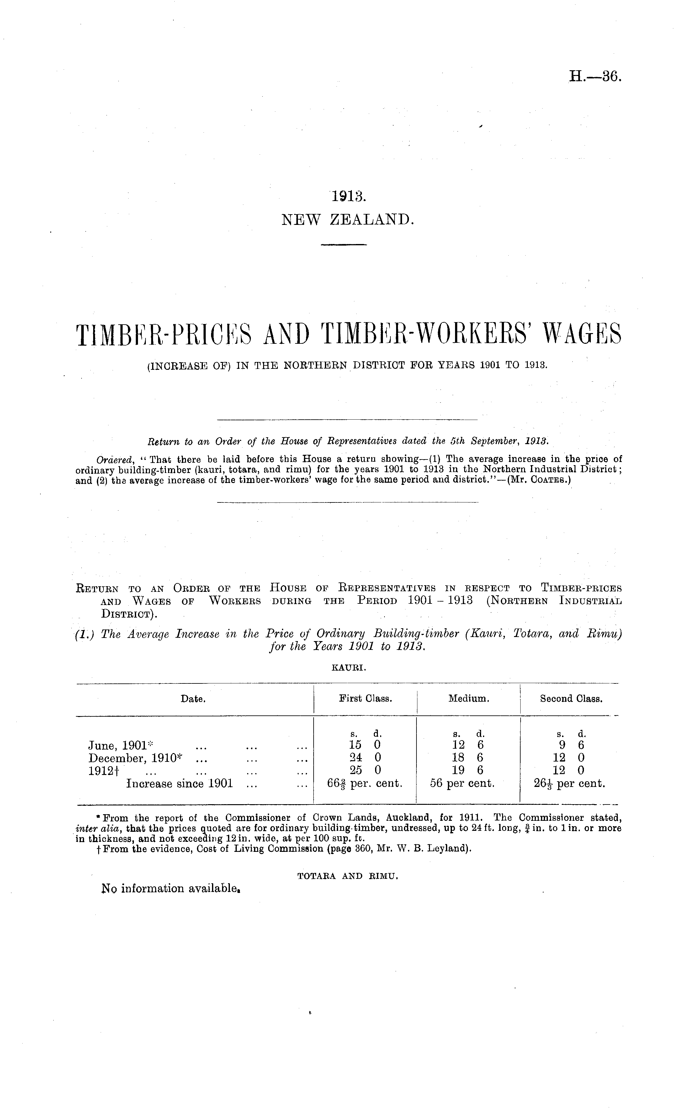 Return to an Order of the Souse of Representatives dated the sth September, 1913. Oraered, " That there be laid before this House a return showing—(l) The average increase in the prioe of ordinary building-timber (kauri, totara, and rimu) for the years 1901 to 1913 in the Northern Industrial District; and (2) tha average increase of the timber-workers' wage for the same period and district."—(Mr. Ooatbs.)