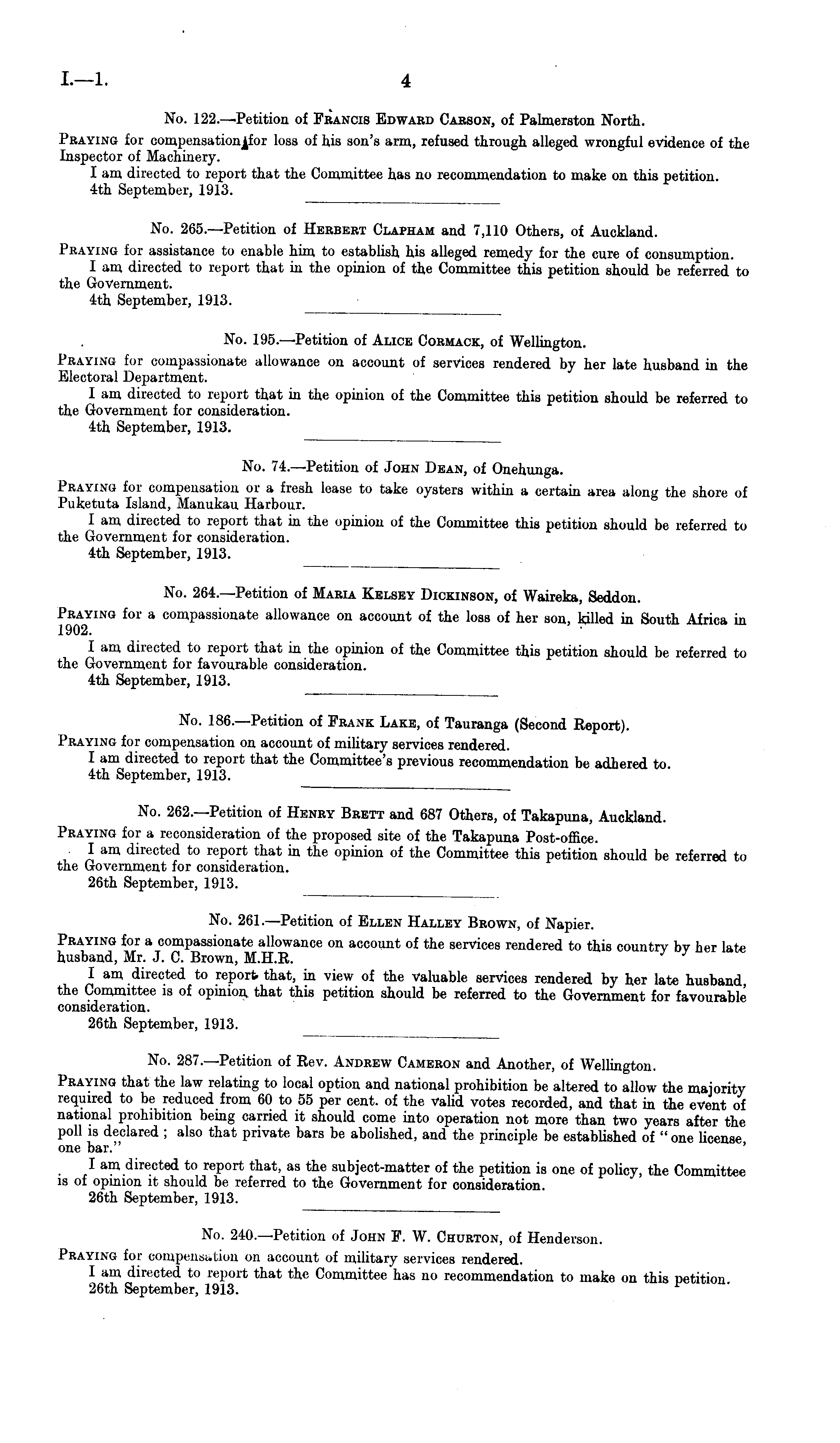 No. 261.—Petition of Ellen Halley Brown, of Napier. Praying for a compassionate allowance on account of the services rendered to this country by her late husband, Mr. J. C. Brown, M.H.E. I am directed to report that, in view of the valuable services rendered by her late husband the Committee is of opinion, that this petition should be referred to the Government for favourable consideration. 26th September, 1913.