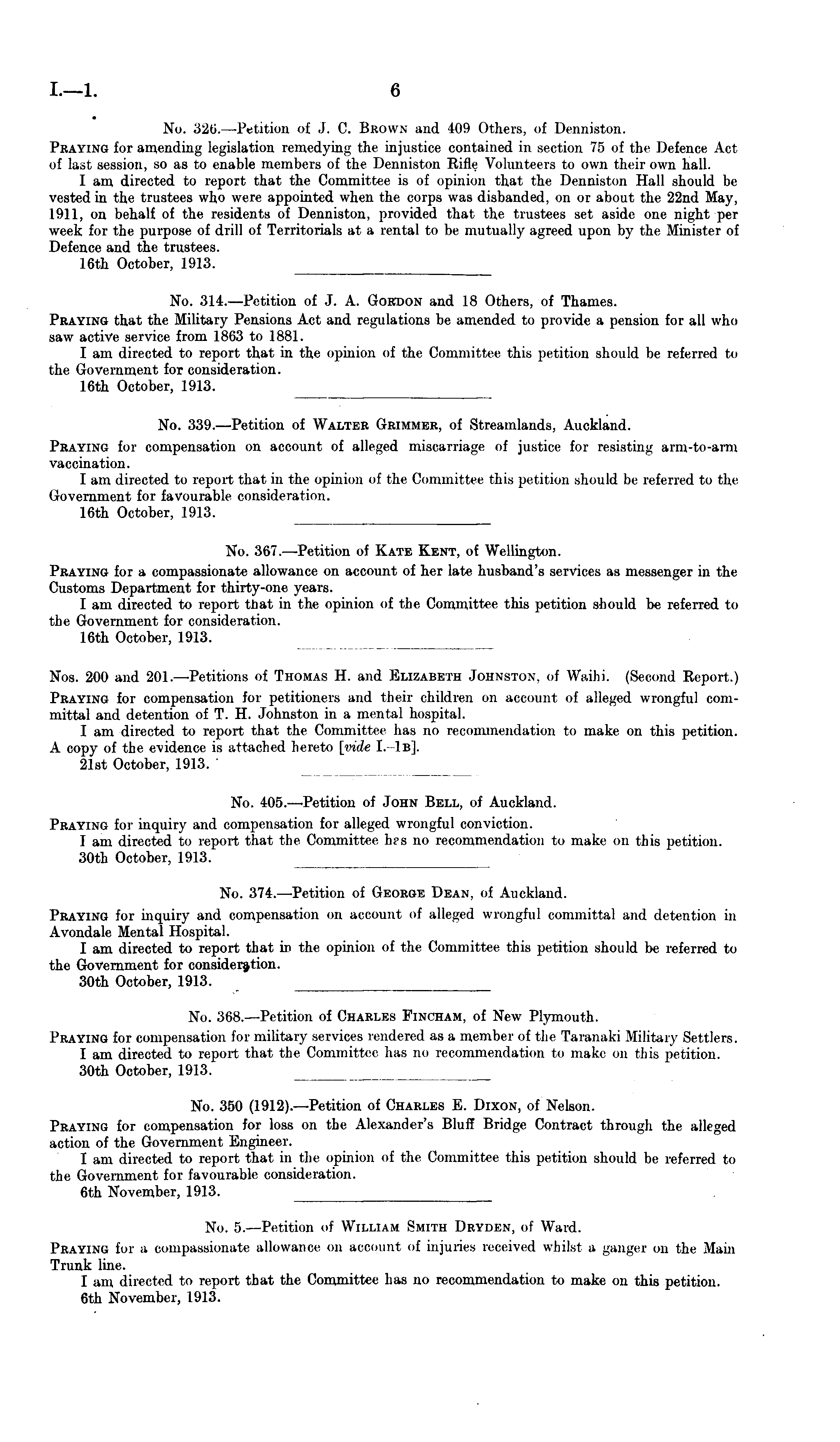 No. 368.—Petition of Charles Fincham, of New Plymouth. Praying for compensation for military services rendered as a member of the Taranaki Military Settlers. I am directed to report that the Committee has no recommendation to make on this petition. 30th October, 1913.