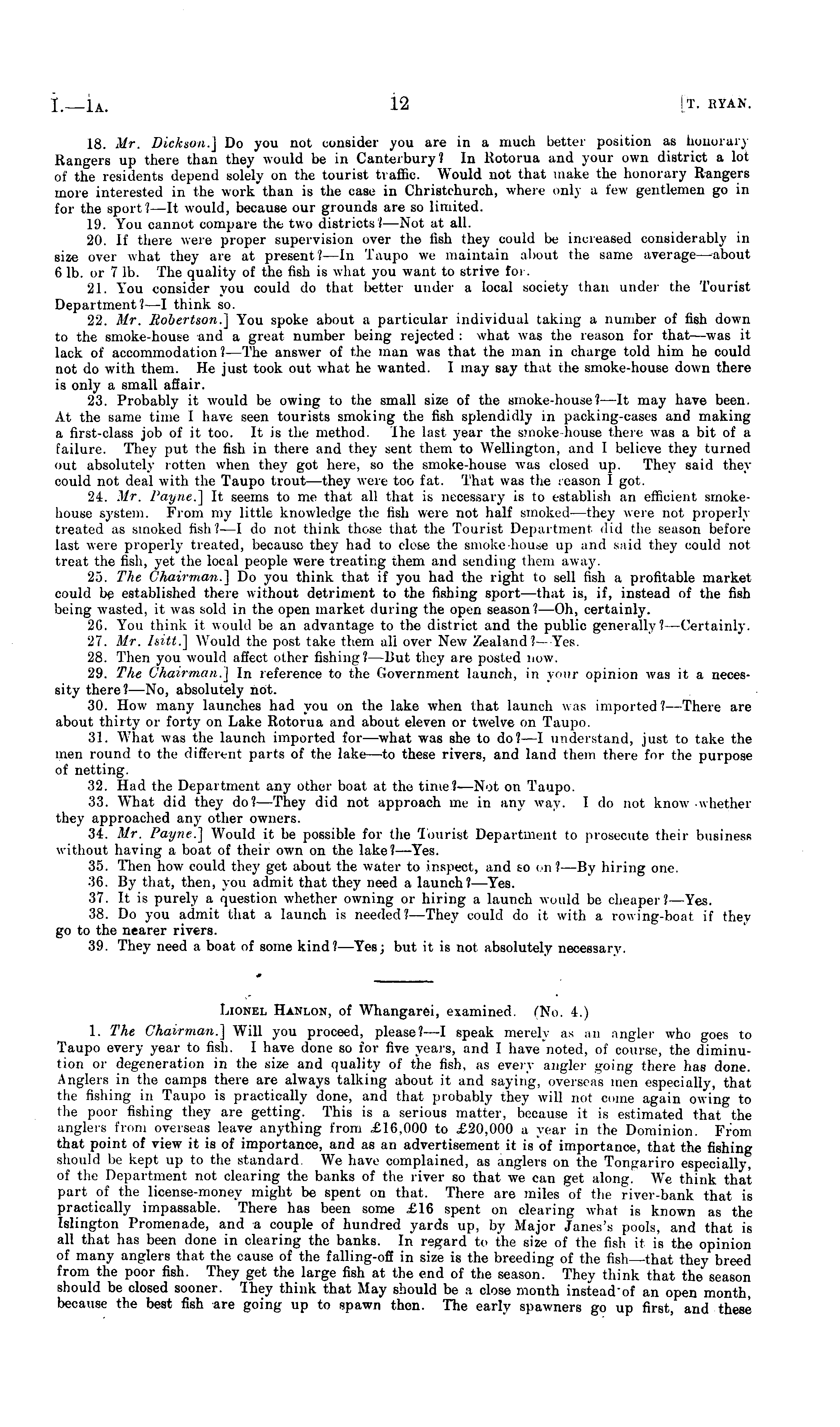 Lionel Hanlon, of Whangarei, examined. (No. 4.) 1. The Chairman.] Will you proceed, please?—l speak merely as an angler who goes to Taupo every year to fish. I have done so for five years, and I have noted, of course, the diminution or degeneration in the size and quality of the fish, as every angler going there has done. Anglers in the camps there are always talking about it and saying, overseas men especially, that iln fishing in Taupo is practically done, and that probably they will not come again owing to the poor fishing they are getting. This is a serious matter, because it is estimated that the anglers from overseas leave anything from £16.000 to £20,000 a year in the Dominion. From that point of view it is of importance, and as an advertisement it is of importance, that the fishing should lie kept up to the standard We have complained, as anglers on the Tongariro especially. of the Department not clearing the banks of the river so that we can get along. We think that part of the license-money might be spent on that. There are miles of the river-bank that is practically impassable. There has been some £16 spent on clearing what is known as the Islington Promenade, and a couple of hundred yards up, by Major Janes's pools, and that is all that has been done in clearing the banks. In regard to the size of the fish it is the opinion of many anglers that the cause of the falling-off in size is the breeding of the fish—that they breed from the poor fish. They get the large fish at the end of the season. They think that the season should be closed sooner. Ihey think that May should be a close month insteadof an open month, because the best fish are going up to spawn then. The early spawners go up first, and these