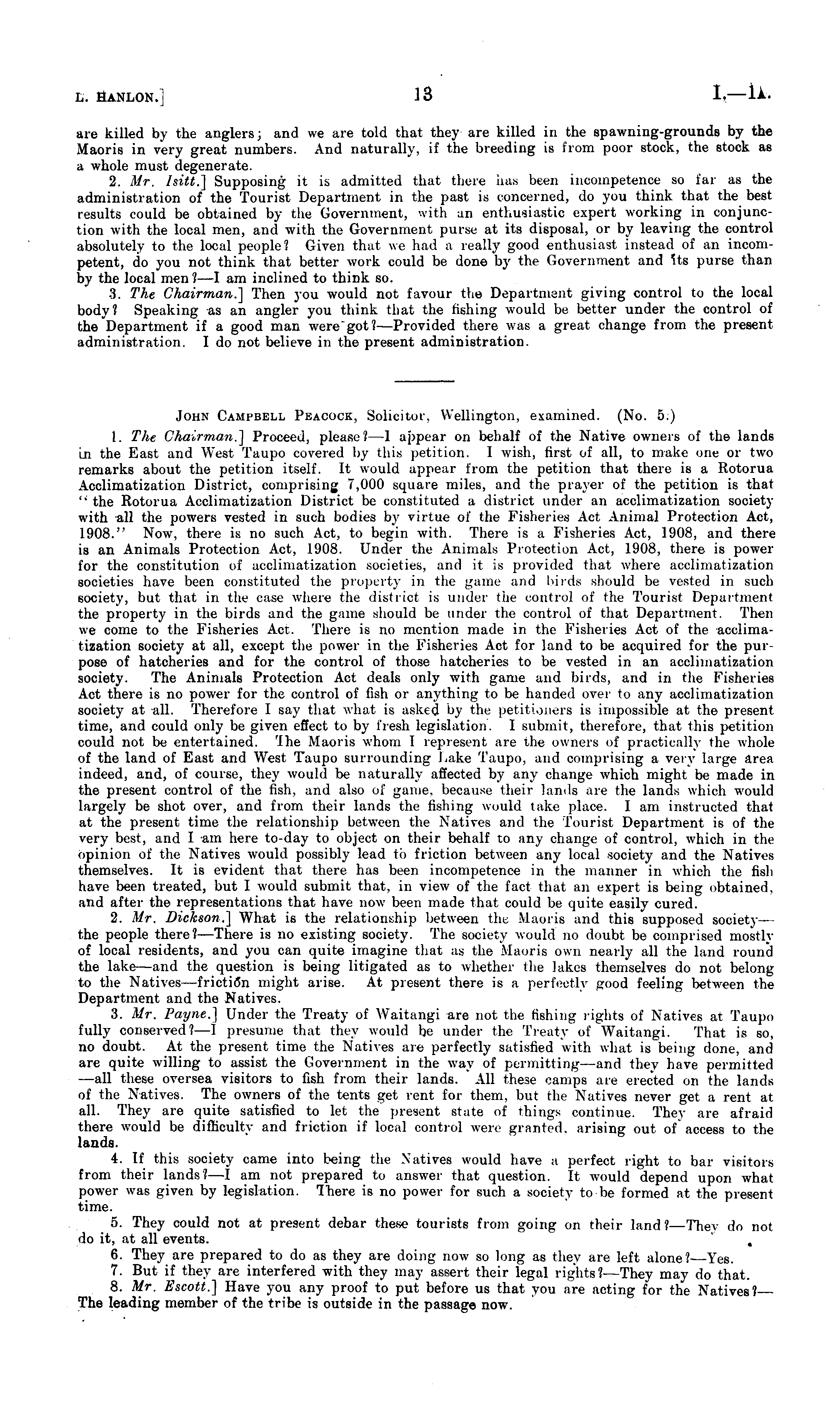 John Campbell Peacock, Solicitor. Wellington, examined. (No. 5.) 1. The Chairman.] Proceed, please?—l appear on behalf of the Native owners of the lands in the East and West Taupo covered by this petition. I wish, first of all, to make one or two remarks about the petition itself. It would appear from the petition that there is a Rotorua Acclimatization District, comprising 7,000 square miles, and the prayer of the petition is that " the Rotorua Acclimatization District be constituted a district under an acclimatization society with all the powers vested in such bodies by virtue of the Fisheries Act Animal Protection Act, 1908." Now, there is no such Act, to begin with. There is a Fisheries Act, 1908, and there is an Animals Protection Act, 1908. Under the Animals Protection Act, 1908, there is power for the constitution of acclimatization societies, and it is provided that where acclimatization societies have been constituted the property in the game and birds should be vested in such society, but that in the case where the district is under the control of the Tourist Department the property in the birds and the game should be under the control of that Department. Then we come to the Fisheries Act. There is no mention made in the Fisheries Act of the acclimatization society at all, except the power in the Fisheries Act for land to be acquired for the purpose of hatcheries and for the control of those hatcheries to be vested in an acclimatization society. The Animals Protection Act deals only with game and birds, and in the Fisheries Act there is no power for the control of fish or anything to be handed over to tiny acclimatization society at all. Therefore I say that what is asked by the petitioners is impossible at the present time, and could only be given effect to by fresh legislation. I submit, therefore, that this petition could not be entertained. 'Ihe Maoris whom I represent are the owners of practically the whole of the land of East and West Taupo surrounding Lake Taupo. and comprising a very large area indeed, and, of course, they would be naturally affected by any change which might be made in the present control of the fish, and also of game, because their lands are the lands which would largely be shot over, and from their lands the fishing would take place. I am instructed that at the present time the relationship between the Natives and the Tourist Department is of the very best, and I am here to-day to object on their behalf to any change of control, which in the opinion of the Natives would possibly lead to friction between any local society and the Natives themselves. It is evident that there has been incompetence in the manner in which the fish have been treated, but I would submit that, in view of the fact that an expert is being obtained, and after the representations that have now been made that could be quite easily cured. 2. Mr. Dickson.] What is the relationship between the Maoris and this supposed society— the people there?-—There is no existing society. The society would no doubt be comprised mostly of local residents, and you can quite imagine that as the Maoris own nearly all the land round the lake —and the question is being litigated as to whether the lakes themselves do not belong to the Natives —frictiSn might arise. At present there is a perfectly good feeling between the Department and the Natives. 3. Mr. Payne.] Under the Treaty of Waitangi are not the fishing rights of Natives at Taupo fully conserved?—l presume that they would be under the Treaty of Waitangi. That is so, no doubt. At the present time the Natives are perfectly satisfied with what is being done, and are quite willing to assist the Government in the way of permitting —and they have permitted —all these oversea visitors to fish from their lands. All these camps are erected on the lands of the Natives. The owners of the tents get rent for them, but the Natives never get a rent at all. They are quite satisfied to let the present state of things continue. They tire afraid there would be difficulty and friction if local control were granted, arising out of'access to the lands. 4. If this society came into being the Natives would have a perfect right to bar visitors from their lands? —I am not prepared to answer that question. It would depend upon what power was given by legislation. There is no power for such a society to be formed at the present time. 5. They could not at present debar these tourists from going on their land?-—They do not do it, at all events. , 6. They are prepared to do as they are doing now so long as they are left alone?— Yes. 7. But if they are interfered with they may assert their legal rights?— They may do that. 8. Mr. Escott.] Have you any proof to put before us that you are acting for the Natives? The leading member of the tribe is outside in the passage now.