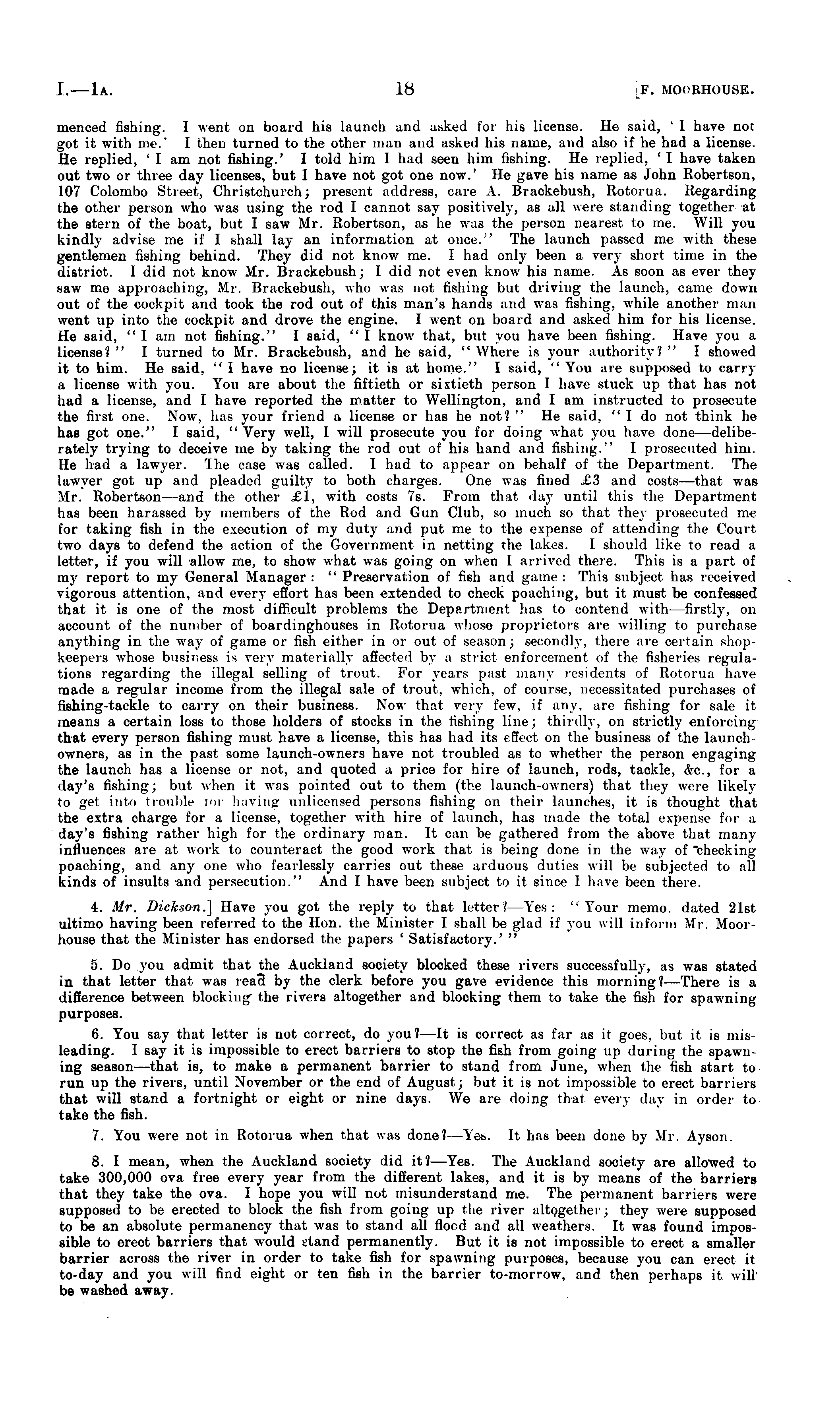 menced fishing. I went on board his launch and asked for his license. He said, ' I have not got it with me.' I then turned to the other man and asked his name, and also if he had a license. He replied, ' I am not fishing.' I told him I had seen him fishing. He replied, ' I have taken out two or three day licenses, but I have not got one now.' He gave his name as John Robertson, 107 Colombo Street, Christchurch; present address, care A. Brackebush, Rotorua. Regarding the other person who was using the rod I cannot say positively, as all were standing together at the stern of the boat, but I saw Mr. Robertson, as he was the person nearest to me. Will you kindly advise me if I shall lay an information at once." The launch passed me with these gentlemen fishing behind. They did not know me. I had only been a very short time in the district. I did not know Mr. Brackebush; I did not even know his name. As soon as ever they saw me approaching, Mr. Brackebush, who was not fishing but driving the launch, came down out of the cockpit and took the rod out of this man's hands and was fishing, while another man went up into the cockpit and drove the engine. I went on board and asked him for his license. He said, " I am not fishing." I said, " I know that, but you have been fishing. Have you a license? " I turned to Mr. Brackebush, and he said, "Where is your authority?" I showed it to him. He said, " I have no license; it is at home." I said, " You are supposed to carry a license with you. You are about the fiftieth or sixtieth person I have stuck up that has not had a license, and I have reported the matter to Wellington, and I am instructed to prosecute the first one. Now, has your friend a license or has he not? " He said, "I do not think he has got one." I said, " Very well, I will prosecute you for doing what you have done —deliberately trying to deceive me by taking the rod out of his hand and fishing." I prosecuted him. He had a lawyer. The case was called. I had to appear on behalf of the Department. The lawyer got up and pleaded guilty to both charges. One was fined £3 and costs —that was Mr. Robertson —and the other £1, with costs 7s. From that day until this the Department has been harassed by members of the Rod and Gun Club, so much so that they prosecuted me for taking fish in the execution of my duty and put me to the expense of attending the Court two days to defend the action of the Government in netting the lakes. I should like to read a letter, if you will allow me, to show what was going on when I arrived there. This is a part of my report to my General Manager : " Preservation of fish and game ; This subject has received vigorous attention, and every effort has been extended to check poaching, but it must be confessed that it is one of the most difficult problems the Department has to contend with—firstly, on account of the number of boardinghouses in Rotorua whose proprietors are willing to purchase anything in the way of game or fish either in or out of season; secondly, there are certain shopkeepers whose business is very materially affected by a strict enforcement of the fisheries regulations regarding the illegal selling of trout. For years past many residents of Rotorua have made a regular income from the illegal sale of trout, which, of course, necessitated purchases of fishing-tackle to carry on their business. Now that very few, if any, are fishing for sale it means a certain loss to those holders of stocks in the fishing line; thirdly, on strictly enforcing that every person fishing must have a license, this has had its effect on the business of the launchowners, as in the past some launch-owners have not troubled as to whether the person engaging the launch has a license or not, and quoted a price for hire of launch, rods, tackle, &c, for a day's fishing; but when it was pointed out to them (the launch-owners) that they were likely to get into trouble tor having unlicensed persons fishing on their launches, it is thought that the extra charge for a license, together with hire of launch, has made the total expense for a day's fishing rather high for the ordinary man. It can be gathered from the above that many influences are at work to counteract the good work that is being done in the way of "checking poaching, and any one who fearlessly carries out these arduous duties will be subjected to all kinds of insults and persecution." And I have been subject to it since I have been there. 4. Mr. Dickson.] Have you got the reply to that letter/ —Yes: "Your memo, dated 21st ultimo having been referred to the Hon. the Minister I shall be glad if you will inform Mr. Moorhouse that the Minister has endorsed the papers ' Satisfactory.' " 5. Do you admit that the Aucklarrd society blocked these rivers successfully, as was stated in that letter that was read by the clerk before you gave evidence this morning? —There is a difference between blocking the rivers altogether and blocking them to take the fish for spawning purposes. 6. You say that letter is not correct, do you? —It is correct as far as it goes, but it is misleading. I say it is impossible to erect barriers to stop the fish from going up during the spawning season —that is, to make a permanent barrier to stand from June, when the fish start to run up the rivers, until November or the end of August; but it is not impossible to erect barriers that will stand a fortnight or eight or nine days. We are doing that every day in order to take the fish. 7. You were not in Rotorua when that was done? —Yes. It has been done by Mr. Ayson. 8. I mean, when the Auckland society did it? —Yes. The Auckland society are allowed to take 300,000 ova free every year from the different lakes, and it is by means of the barriers that they take the ova. I hope you will not misunderstand me. The permanent barriers were supposed to be erected to block the fish from going up the river altogether; they were supposed to be an absol