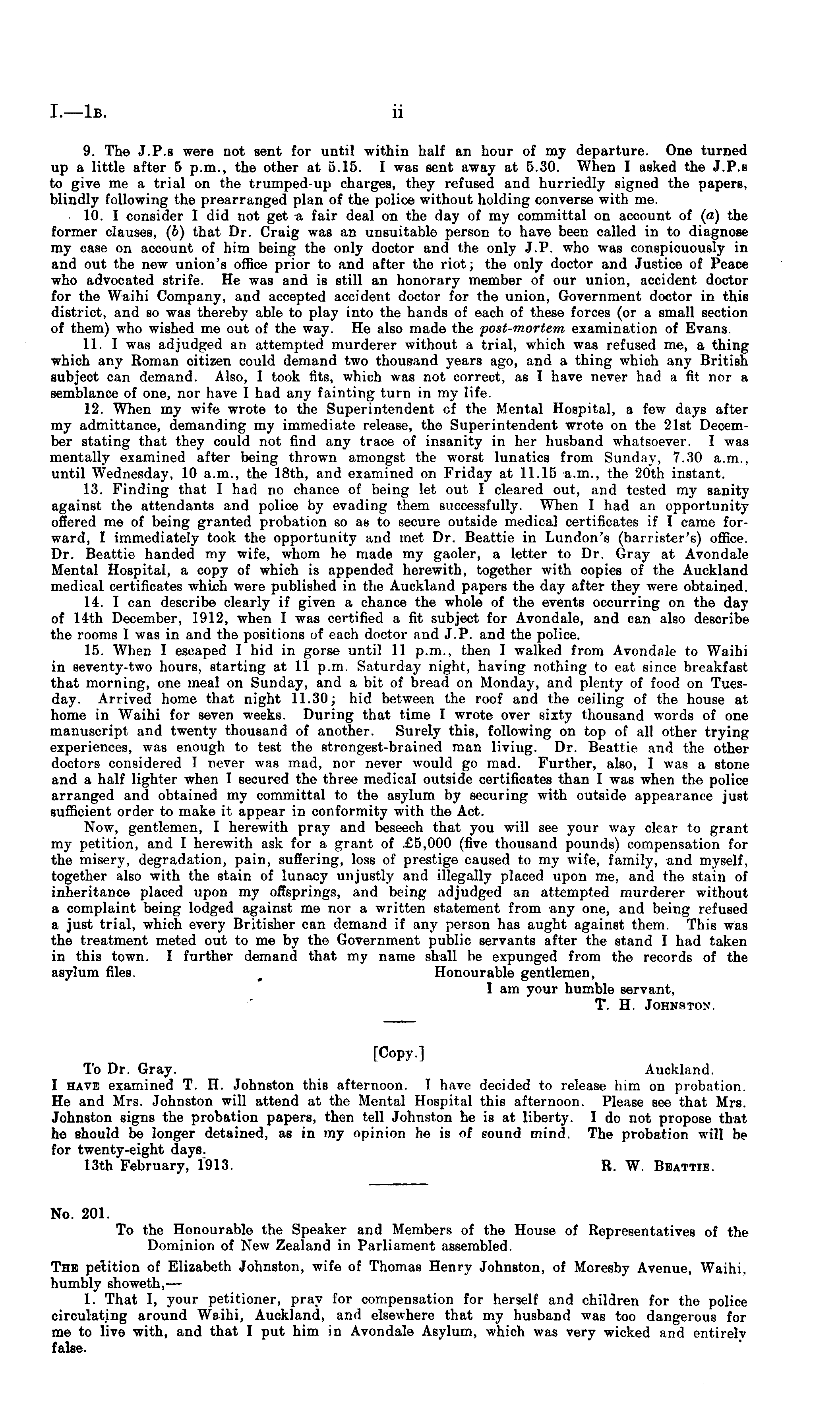 9. The J.P.s were not sent for until within half an hour of my departure. One turned up a little after 5 p.m., the other at 5.15. I was sent away at 5.30. When I asked the J.P.s to give me a trial on the trumped-up charges, they refused and hurriedly signed the papers, blindly following the prearranged plan of the police without holding converse with me. 10. I consider I did not get a fair deal on the day of my committal on account of (a) the former clauses, (b) that Dr. Craig was an unsuitable person to have been called in to diagnose my case on account of him being the only doctor and the only J.P. who was conspicuously in and out the new union's office prior to and after the riot; the only doctor and Justice of Peace who advocated strife. He was and is still an honorary member of our union, accident doctor for the Waihi Company, and accepted accident doctor for the union, Government doctor in this district, and so was thereby able to play into the hands of each of these forces (or a small section of them) who wished me out of the way. He also made the post-mortem examination of Evans. 11. I was adjudged an attempted murderer without a trial, which was refused me, a thing which any Roman citizen could demand two thousand years ago, and a thing which any British subject can demand. Also, I took fits, which was not correct, as I have never had a fit nor a semblance of one, nor have I had any fainting turn in my life. 12. When my wife wrote to the Superintendent of the Mental Hospital, a few days after my admittance, demanding my immediate release, the Superintendent wrote on the 21st December stating that they could not find any trace of insanity in her husband whatsoever. I was mentally examined after being thrown amongst the worst lunatics from Sunday, 7.30 a.m., until Wednesday, 10 a.m., the 18th, and examined on Friday at 11.15 a.m., the 20th instant. 13. Finding that I had no chance of being let out I cleared out, and tested my sanity against the attendants and police by evading them successfully. When I had an opportunity offered me of being granted probation so as to secure outside medical certificates if I came forward, I immediately took the opportunity and met Dr. Beattie in Lundon's (barrister's) office. Dr. Beattie handed my wife, whom he made my gaoler, a letter to Dr. Gray at Avondale Mental Hospital, a copy of which is appended herewith, together with copies of the Auckland medical certificates which were published in the Auckland papers the day after they were obtained. 14. I can describe clearly if given a chance the whole of the events occurring on the day of 14th December, 1912, when I was certified a fit subject for Avondale, and can also describe the rooms I was in and the positions of each doctor and J.P. and the police. 15. When I escaped I hid in gorse until 11 p.m., then I walked from Avondale to Waihi in seventy-two hours, starting at 11 p.m. Saturday night, having nothing to eat since breakfast that morning, one meal on Sunday, and a bit of bread on Monday, and plenty of food on Tuesday. Arrived home that night 11.30; hid between the roof and the ceiling of the house at home in Waihi for seven weeks. During that time I wrote over sixty thousand words of one manuscript and twenty thousand of another. Surely this, following on top of all other trying experiences, was enough to test the strongest-brained man living. Dr. Beattie and the other doctors considered I never was mad, nor never would go mad. Further, also, I was a stone and a half lighter when I secured the three medical outside certificates than I was when the police arranged and obtained my committal to the asylum by securing with outside appearance just sufficient order to make it appear in conformity with the Act. Now, gentlemen, I herewith pray and beseech that you will see your way clear to grant my petition, and I herewith ask for a grant of £5,000 (five thousand pounds) compensation for the misery, degradation, pain, suffering, loss of prestige caused to my wife, family, and myself, together also with the stain of lunacy unjustly and illegally placed upon me, and the stain of inheritance placed upon my offsprings, and being adjudged an attempted murderer without a complaint being lodged against me nor a written statement from any one, and being refused a just trial, which every Britisher can demand if any person has aught against them. This was the treatment meted out to me by the Government public servants after the stand I had taken in this town. I further demand that my name shall be expunged from the records of the asylum files. # Honourable gentlemen, I am your humble servant, T. H. Johnston.