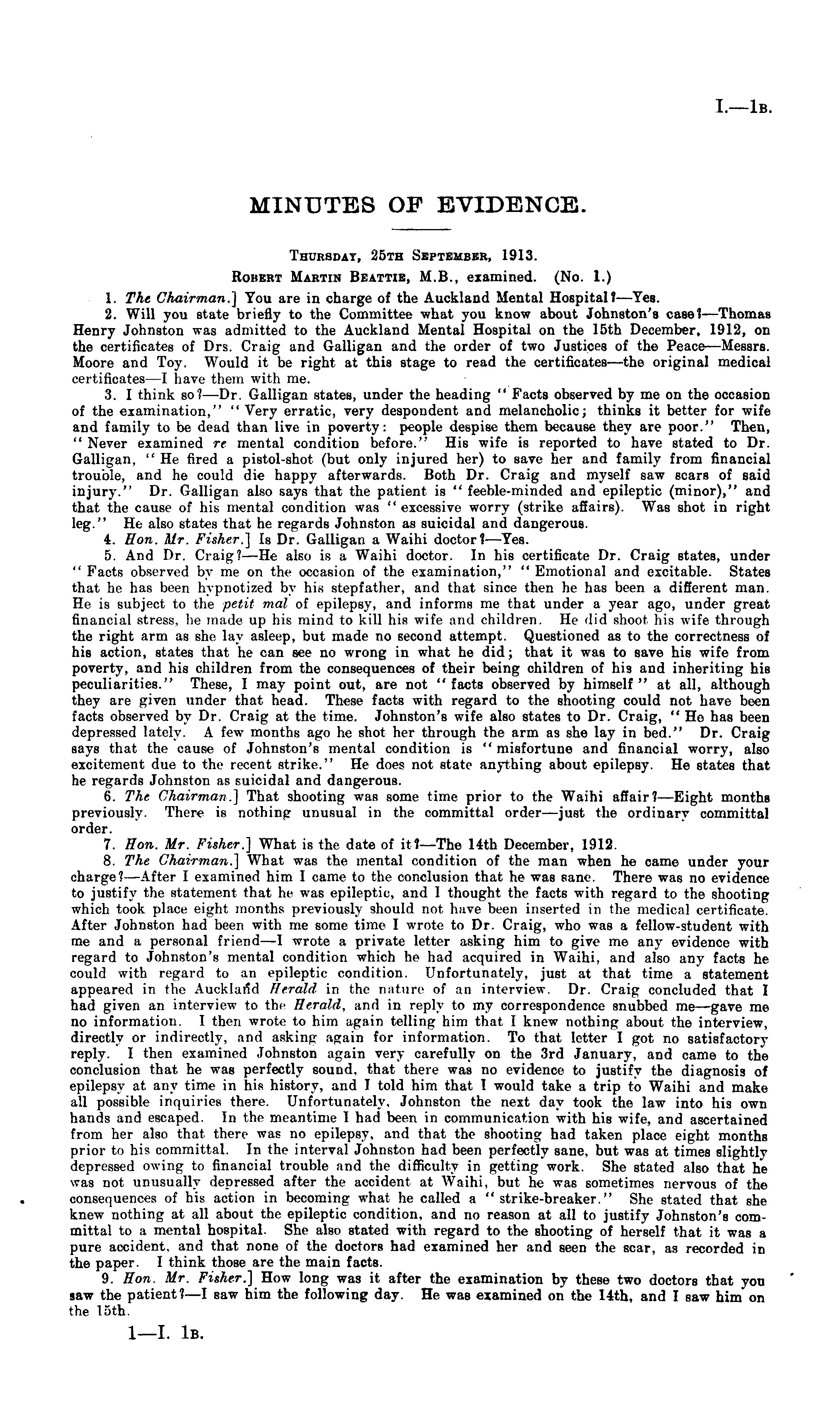 MINUTES OF EVIDENCE. Thursday, 25th September, 1913. Robert Martin Beattie, M.8., examined. (No. 1.) 1. The Chairman.] You are in charge of the Auckland Mental Hospital!— Yes. 2. Will you state briefly to the Committee what you know about Johnston's easel—Thomas Henry Johnston was admitted to the Auckland Mental Hospital on the 15th December, 1912, on the certificates of Drs. Craig and Galligan and the order of two Justices of the Peace —Messrs. Moore and Toy. Would it be right at this stage to read the certificates—the original medical certificates —I have them with me. 3. I think so?— Dr. Galligan states, under the heading " Facts observed by me on the occasion of the examination," "Very erratic, very despondent and melancholic; thinks it better for wife and family to be dead than live in poverty: people despise them because they are poor." Then, " Never examined re mental condition before." His wife is reported to have stated to Dr. Galligan, " He fired a pistol-shot (but only injured her) to save her and family from financial trouble, and he could die happy afterwards. Both Dr. Craig and myself saw scars of said injury." Dr. Galligan also says that the patient is " feeble-minded and epileptic (minor)," and that the cause of his mental condition was "excessive worry (strike affairs). Was shot in right leg." He also states that he regards Johnston as suicidal and dangerous. 4. Hon. Mr. Fisher.] Is Dr. Galligan a Waihi doctor? —Yes. 5. And Dr. Craig?—He also is a Waihi doctor. In his certificate Dr. Craig states, under " Facts observed by me on the occasion of the examination," " Emotional and excitable. States that he has been hypnotized by his stepfather, and that since then he has been a different man. He is subject to the petit mal of epilepsy, and informs me that under a year ago, under great financial stress, he made up his mind to kill his wife and children. He did shoot his wife through the right arm as she lay asleep, but made no second attempt. Questioned as to the correctness of his action, states that he can see no wrong in what he did; that it was to save his wife from poverty, and his children from the consequences of their being children of his and inheriting his peculiarities." These, I may point out, are not "facts observed by himself" at all, although they are given under that head. These facts with regard to the shooting could not have been facts observed by Dr. Craig at the time. Johnston's wife also states to Dr. Craig, "Ho has been depressed lately. A few months ago he shot her through the arm as she lay in bed." Dr. Craig says that the cause of Johnston's mental condition is "misfortune and financial worry, also excitement due to the recent strike." He does not state anything about epilepsy. He states that he regards Johnston as suicidal and dangerous. 6. The Chairman.] That shooting was some time prior to the Waihi affair?— Eight months previously. There is nothing unusual in the committal order —just the ordinary committal order. 7. Hon. Mr. Fisher.] What is the date of it?— The 14th December, 1912. 8. The Chairman.] What was the mental condition of the man when he came under your charge?— After I examined him I came to the conclusion that he was sane. There was no evidence to justify the statement that he was epileptic, and I thought the facts with regard to the shooting which took place eight months previously should not have been inserted in the medical certificate. After Johnston had been with me some time I wrote to Dr. Craig, who was a fellow-student with me and a personal friend —I wrote a private letter asking him to give me any evidence with regard to Johnston's mental condition which he had acquired in Waihi, and also any facts he could with regard to an epileptic condition. Unfortunately, just at that time a statement appeared in the Auckland Herald in the nature of an interview. Dr. Craig concluded that I had given an interview to the Herald, and in reply to my correspondence snubbed me—gave me no information. I then wrote to him again telling him that I knew nothing about the interview, directly or indirectly, and asking again for information. To that letter I got no satisfactory reply. I then examined Johnston again very carefully on the 3rd January, and came to the conclusion that he was perfectly sound, that there was no evidence to justify the diagnosis of epilepsy at any time in his history, and I told him that I would take a trip to Waihi and make all possible inquiries there. Unfortunately, Johnston the next day took the law into his own hands and escaped. In the meantime I had been in communication with his wife, and ascertained from her also that there was no epilepsy, and that the shooting had taken place eight months prior to his committal. In the interval Johnston had been perfectly sane, but was at times slightly depressed owing to financial trouble and the difficulty in getting work. She stated also that he was not unusually depressed after the accident at Waihi, but he was sometimes nervous of the consequences of his action in becoming what he called a "strike-breaker." She stated that she knew nothing at all about the epileptic condition, and no reason at all to justify Johnston's committal to a mental hospital. She also stated with regard to the shooting of herself that it was a pure accident, and that none of the doctors had examined her and seen the scar, as recorded in the paper. I think those are the main facts. 9. Hon. Mr. Fisher.] How long was it after the examination by these two doctors that you saw the patient?—l saw him the following day. He was examined on the 14th, and I saw him on the 15th.