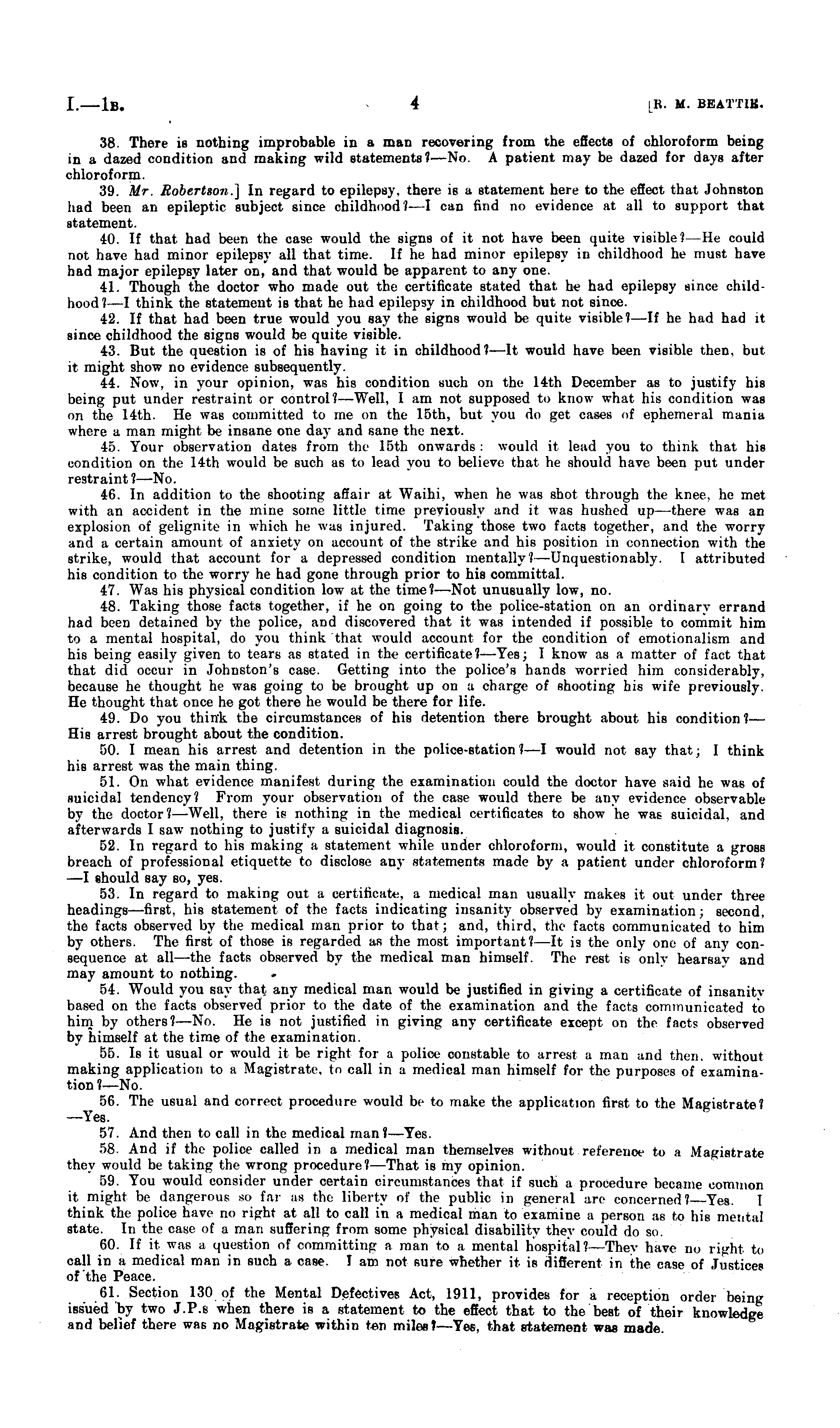 38. There is nothing improbable in a man recovering from the effects of chloroform being in a dazed condition and making wild statements? —No. A patient may be dazed for days after chloroform. 39. Mr. Robertson.] In regard to epilepsy, there is a statement here to the effect that Johnston had been an epileptic subject since childhood?- —I can find no evidence at all to support that statement. 40. If that had been the case would the signs of it not have been quite visible? —He could not have had minor epilepsy all that time. If he had minor epilepsy in childhood he must have had major epilepsy later on, and that would be apparent to any one. 41. Though the doctor who made out the certificate stated that he had epilepsy since childhood ? —I think the statement is that he had epilepsy in childhood but not since. 42. If that had been true would you say the signs would be quite visible?—lf he had had it since childhood the signß would be quite visible. 43. But the question is of his having it in childhood? —It would have been visible then, but it might show no evidence subsequently. 44. Now, in your opinion, was his condition such on the 14th December as to justify his being put under restraint or control? —Well, 1 am not supposed to know what his condition was on the 14th. He was committed to me on the 15th, but you do get cases of ephemeral mania where a man might be insane one day and sane the next. 45. Your observation dates from the 15th onwards : would it lead you to think that his condition on the 14th would be such as to lead you to believe that he should have been put under restraint? —No. 46. In addition to the shooting affair at Waihi, when he was shot through the knee, he met with an accident in the mine some little time previously and it was hushed vp —there was an explosion of gelignite in which he was injured. Taking those two facts together, and the worry and a certain amount of anxiety on account of the strike and his position in connection with the strike, would that account for a depressed condition mentally ?•—Unquestionably. I attributed his condition to the worry he had gone through prior to his committal. 47. Was his physical condition low at the time?— Not unusually low, no. 48. Taking those facts together, if he on going to the police-station on an ordinary errand had been detained by the police, and discovered that it was intended if possible to commit him to a mental hospital, do you think that would account for the condition of emotionalism and his being easily given to tears as stated in the certificate?— Yes; I know as a matter of fact that that did occur in Johnston's case. Getting into the police's hands worried him considerably, because he thought he was going to be brought up on a charge of shooting his wife previously. He thought that once he got there he would be there for life. 49. Do you think the circumstances of his detention there brought about his condition?— His arrest brought about the condition. 50. I mean his arrest and detention in the police-station?—l would not say that; 1 think his arrest was the main thing. 51. On what evidence manifest during the examination could the doctor have said he was of suicidal tendency? From your observation of the case would there be any evidence observable by the doctor? —Well, there is nothing in the medical certificates to show he was suicidal, and afterwards I saw nothing to justify a suicidal diagnosis. 52. In regard to his making a statement while under chloroform, would it constitute a gross breach of professional etiquette to disclose any statements made by a patient under chloroform? —I should say so, yes. 53. In regard to making out a certificate, a medical man usually makes it out under three headings—first, his statement of the facts indicating insanity observed by examination; second, the facts observed by the medical man prior to that; and, third, the facts communicated to him by others. The first of those is regarded as the most important?—lt is the only one of any consequence at all—the facts observed by the medical man himself. The rest is only hearsay and may amount to nothing. 54. Would you say that any medical man would be justified in giving a certificate of insanity based on the facts observed prior to the date of the examination and the facts communicated to him by others? —No. He is not justified in giving any certificate except on the facts observed by himself at the time of the examination. 55. Is it usual or would it be right for a police constable to arrest a man and then, without making application to a Magistrate, to call in a medical man himself for the purposes of examination?— No. 56. The usual and correct procedure would be to make the application first to the Magistrate? —Yes. 57. And then to call in the medical man?— Yes. 58. And if the police called in a medical man themselves without reference to a Magistrate they would be taking the wrong procedure?— That is my opinion. 59. You would consider under certain circumstances that if such a procedure became common it might be dangerous so far as the liberty of the public in general are concerned?— Yes. I think the police have no right at all to call in a medical man to examine a person as to his mental state. In the case of a man suffering from some physical disability they could do so. 60. If it was a question of committing a man to a mental hospital?— They have no right to call in a medical man in such a case. lam not sure whether it is different in the case of Justices of the Peace. 61. Section 130 of the Mental Defectives Act, 1911, provides for a reception order being issued by two J.P.s when there is a statement to the effect that to the best of their knowledge and belief there was no Magistrate within ten miles?— Yes, that statement was made.