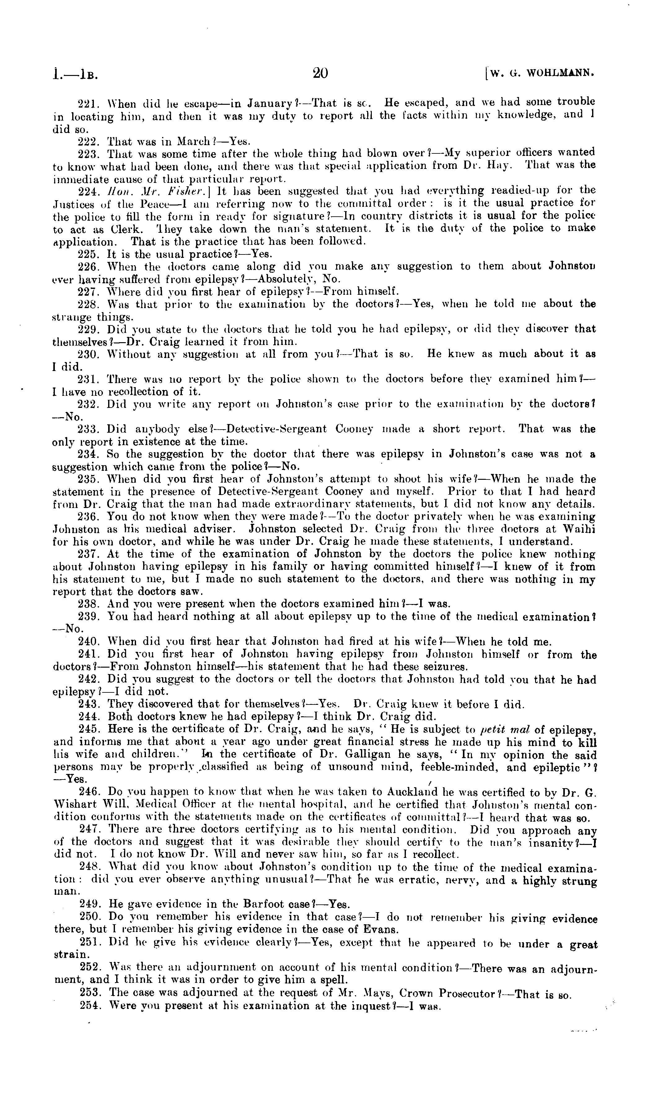 221. When did he escape —in January ?—- That is BC. He escaped, and we had some trouble in locating him, and then it was my duty to report all the facts within my knowledge, and 1 did so. 222. That was in March? —Yes. 22.'!. That was some time after the whole thing had blown over? —My superior officers wanted to know what had been done, and there was that special application from Dr. May. That was the immediate cause of that particular report. 224. Hon. Mr. Fisher.] It has been suggested that you had everything readied-up for the Justices of the Peace —1 am referring now to the committal order: is it the usual practice for the police to fill the form in ready for signature? —In country districts it is usual for the police to act as Clerk. Ihey take down the man's statement. It is the duty of the police to make application. That is the practice that has been followed. 225. It is the usual practice? —Yes. 226. When the doctors came along did you make any suggestion to them about Johnston ever having suffered from epilepsy ? —Absolutely, No. 227. Where did you first hear of epilepsy? -From himself. 228. Was that prior to the examination by the doctors?— Yes, when lie told me about the strange things. 229. Did you state to the doctors that be told you he had epilepsy, or did they discover that themselves?— Dr. Craig learned it from him. 230. Without any suggestion at all from you I- —That is so. He knew as much about it as I did. 231. There was no report by the police shown to the doctors before they examined him?— I have no recollection of it. 232. Did you write any report on Johnston's case prior to the examination by the doctors? - -No. 233. Did anybody else?—Detective-Sergeant Cooney made a short report. That was the only report in existence at the time. 234. So the suggestion by the doctor that there was epilepsy in Johnston's ease was not a suggestion which came from the police? —No. 235. When did you first hear of Johnston's attempt to shoot his wife?— When he made the statement in the presence of Detective-Sergeant Cooney and myself. Prior to that I had heard from Dr. Craig that the man hail made extraordinary statements, but I did not know any details. •_'■'!(). You do not know when they were made? —To the doctor privately when he was examining Johnston as his medical adviser. Johnston selected Dr. Craig from the three doctors at Waihi for his own doctor, and while he was under Dr. Craig he made these statements. I understand. 237. At the time of the examination of Johnston by the doctors the police knew nothing about Johnston having epilepsy in his family or having committed himself?—l knew of it from his statement to me, but I made no such statement to the doctors, and there was nothing in my report that the doctors saw. 238. And you were present when the doctors examined him?—l was. 2.'!!). You had heard nothing at all about epilepsy up to the time of the medical examination? —No. 240. When did you first hear that Johnston had fired at his wife? —When he told me. 241. Did you first hear of Johnston having epilepsy from Johnston himself or from the doctors? —From Johnston himself —his statement that he had these seizures. 242. Did you suggest to the doctors or tell the doctors that Johnston had told you that he had epilepsy.'—l did not. 243. They discovered that for themselves?— Yes. Dr. Craig knew it before I did. 244. Both doctors knew he had epilepsy?—l think Dr. Craig did. 245. Here is the certificate of Dr. Craig, and he says, " He is subject to petit mal of epilepsy, and informs me that about a year ago under great financial stress he made up his mind to kill his wife and children." ki the certificate of Dr. Galligan he says. "In my opinion the said persons may be properly classified as being of unsound mind, feeble-minded, and epileptic"? —Yes. , 246. Do you happen to know thai when he was taken to Auckland he was certified to by Dr. G. Wishart Will. Medical Officer at the mental hospital, and he certified that Johnston's mental condition conforms with the statements made on the certificates of committal.' I heard that was so. 247. There are three doctors certifying as to his mental condition. Did you approach any of the doctors and suggest that it was desirable they should certify to the man's insanity?—l did not. Ido not know Dr. Will and never saw him, so far as I recollect. 248. What did you know about Johnston's condition up to the time of the medical examination : did you ever observe .anything unusual?— That he was erratic, nervy, and a highly strung man. 249. He gave evidence in the Barfoot case?— Yes. 250. Do you remember his evidence in that ease.' I do not remember his giving evidence there, but I remember his giving evidence in the case of Evans. 251. Did he give his evidence clearly? Yes. except that he appeared to be under a great strain. 252. Was there an adjournment on account of his mental condition? —There was an adjournment, and 1 think it was in order to give him a spell. 253. The ease was adjourned at the request of Mr. Mays. Crown Prosecutor? -That is so. 254. Were you present at his examination at the inquest?—l was.