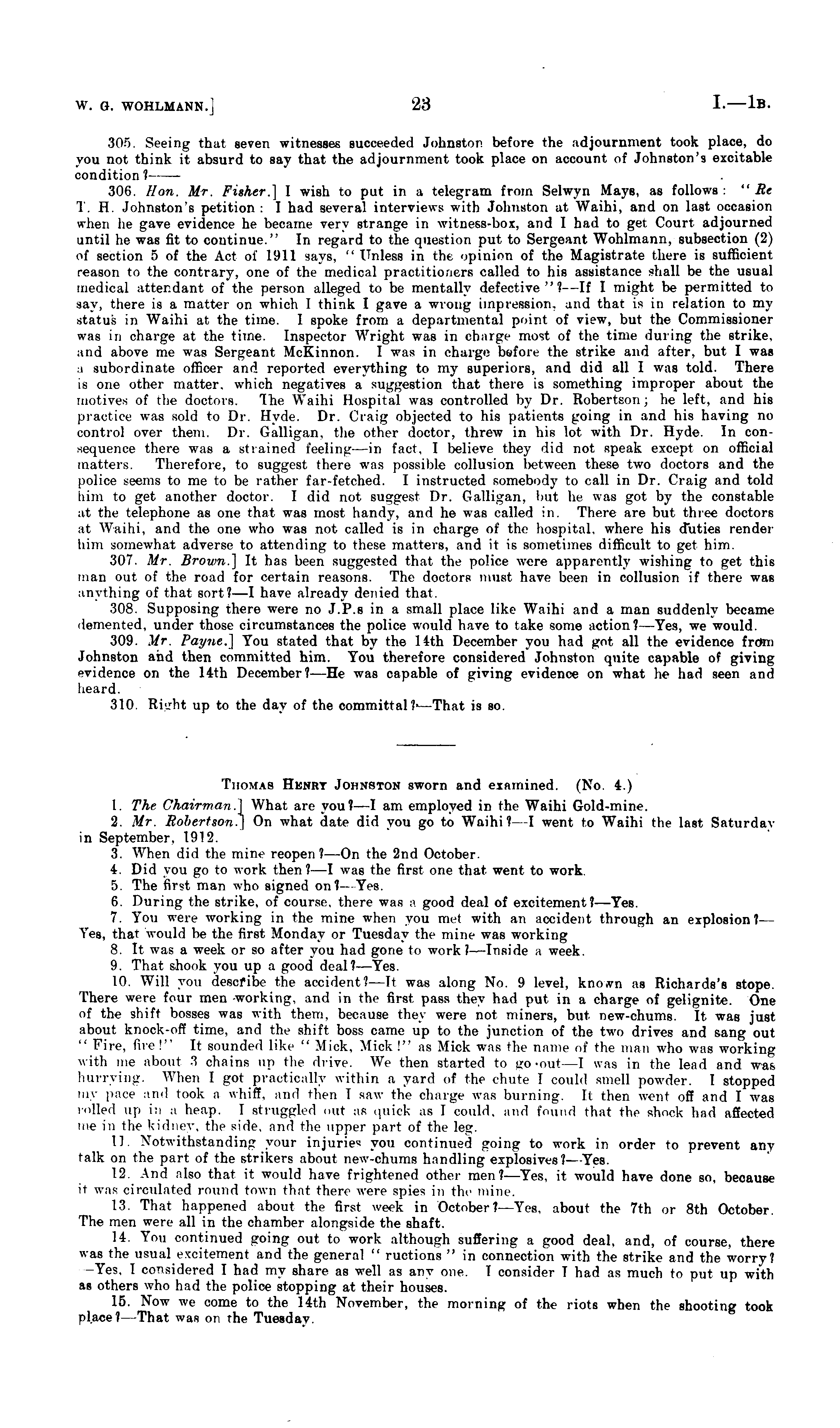 305. Seeing that seven witnesses succeeded Johnston before the adjournment took place, do you not think it absurd to say that the adjournment took place on account of Johnston's excitable condition ? 306. Hon. Mr. Fisher.] I wish to put in a telegram from Selwyn Mays, as follows : " Re T. H. Johnston's petition : I had several interviews with Johnston at Waihi, and on last occasion when he gave evidence he became very strange in witness-box, and I had to get Court adjourned until he was fit to continue." In regard to the question put to Sergeant Wohlmann, subsection (2) of section 5 of the Act of 1911 says, " Unless in the opinion of the Magistrate there is sufficient reason to the contrary, one of the medical practitioners called to his assistance shall be the usual medical attendant of the person alleged to be mentally defective"? —If I might be permitted to say, there is a matter on which I think I gave a wrong impression, and that is in relation to my status in Waihi at the time. I spoke from a departmental point of view, but the Commissioner was in charge at the time. Inspector Wright was in charge most of the time during the strike, and above me was Sergeant McKinnon. I was in charge before the strike and after, but I was a subordinate officer and reported everything to my superiors, and did all I was told. There is one other matter, which negatives a suggestion that there is something improper about the motives of the doctors. The Waihi Hospital was controlled by Dr. Robertson; he left, and his practice was sold to Dr. Hyde. Dr. Craig objected to his patients going in and his having no control over them. Dr. Galligan. the other doctor, threw in his lot with Dr. Hyde. In consequence there was a strained feeling —in fact, I believe they did not speak except on official matters. Therefore, to suggest there was possible collusion l>etween these two doctors and the police seems to me to be rather far-fetched. I instructed somebody to call in Dr. Craig and told him to get another doctor. I did not suggest Dr. Galligan, but he was got by the constable at the telephone as one that was most handy, and he was called in. There are but three doctors at Waihi, and the one who was not called is in charge of the hospital, where his duties render him somewhat adverse to attending to these matters, and it is sometimes difficult to get him. 307. Mr. Brown.] It has been suggested that the police were apparently wishing to get this man out of the road for certain reasons. The doctors must have been in collusion if there was anything of that sort?—l have already denied that. 308. Supposing there were no J.P.s in a small place like Waihi and a man suddenly became demented, under those circumstances the police would have to take some action?— Yes, we would. 309. Mr. Payne.] You stated that by the 14th December you had got all the evidence from Johnston and then committed him. You therefore considered Johnston quite capable of giving evidence on the 14th December?—He was capable of giving evidence on what he had seen and heard. 310. Ri'j-ht up to the day of the committal?-—That is so.
