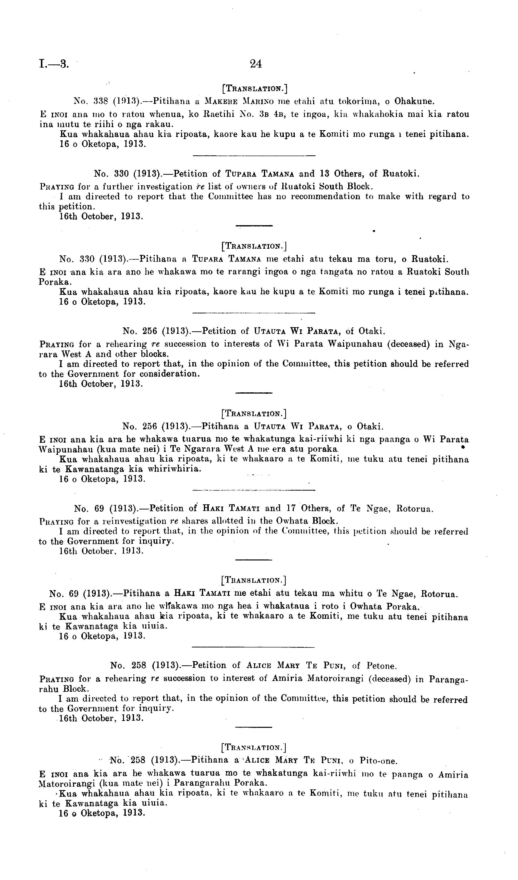 [Translation.] No. 256 (1913).— Pitihana a Utauta Wi Parata, o Otaki. E INOI ana kia ara he whakawa tuarua mo te whakatunga kai-riiwhi ki nga paanga o Wi Parata Waipunahau (kua mate nei) i Te Ngarara West A me era atu poraka • Kua whakahaua ahau kia ripoata, kite whakaaro a te Komiti, me tuku atu tenei pitihana kite Kawanatanga kia whiriwhiria. 16 o Oketopa, 1913.
