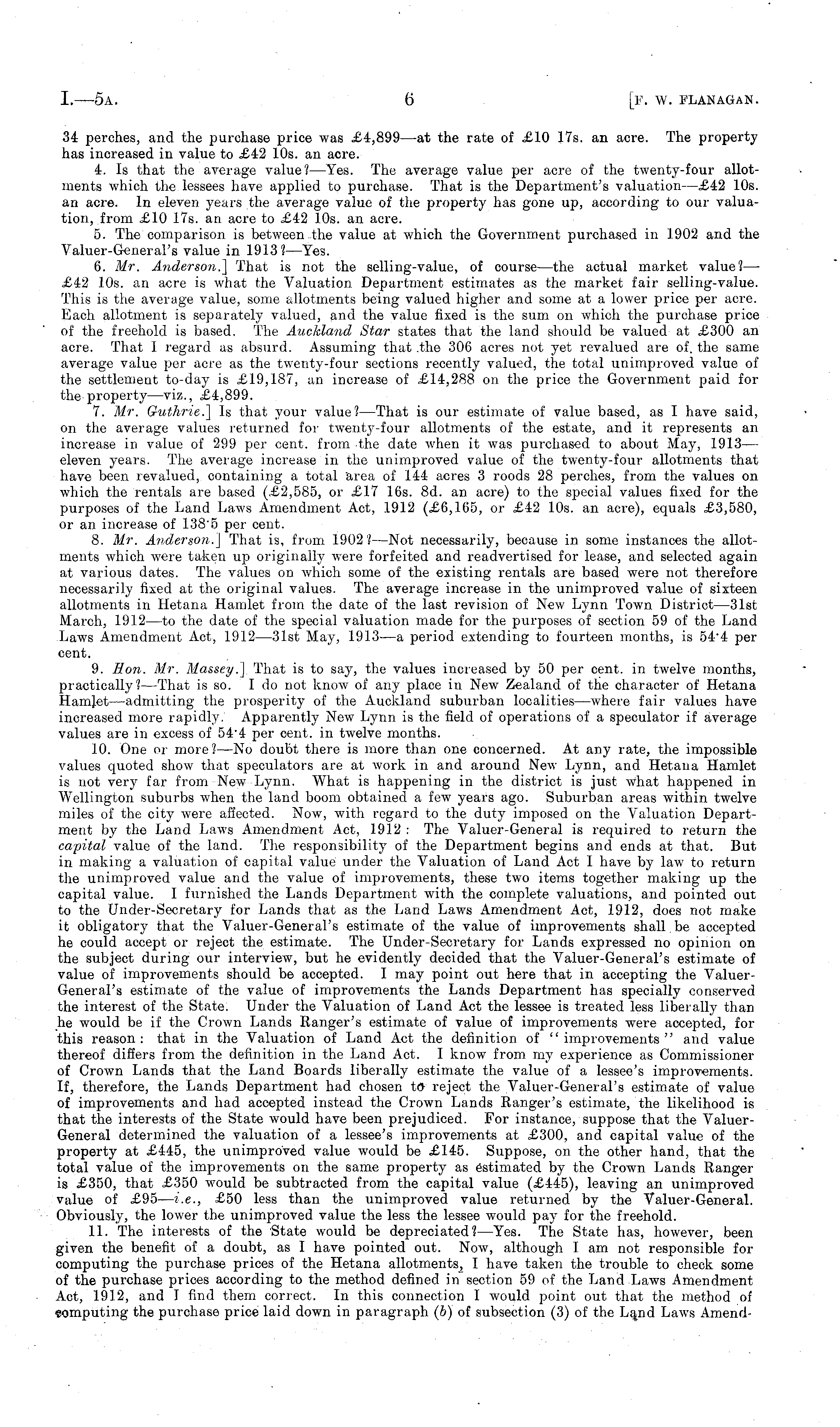 34 perches, and the purchase price was £4,899 —at the rate of £10 17s. an acre. The property has increased in value to £42 10s. an acre. 4. Is that the average value? —Yes. The average value per acre of the twenty-four allotments which the lessees have applied to purchase. That is the Department's valuation —£42 10s. an acre. In eleven years the average value of the property has gone up, according to our valuation, from £10 17s. an acre to £42 10s. an acre. 5. The comparison is between the value at which the Government purchased in 1902 and the Valuer-General's value in 1913? —Yes. 6. Mr. Anderson] That is not the selling-value, of course —the actual market value? — £42 10s. an acre is what the Valuation Department estimates as the market fair selling-value. This is the average value, some allotments being valued higher and some at a lower price per acre. Each allotment is separately valued, and the value fixed is the sum on which the purchase price of the freehold is based. The Auckland Star states that the land should be valued at £300 an acre. That I regard as absurd. Assuming that .the 306 acres not yet revalued are of. the same average value per acre as the twenty-four sections recently valued, the total unimproved value of the settlement to-day is £19,187, an increase of £14,288 on the price the Government paid for the property —viz., £4,899. 7. Mr. Guthrie.] Is that your value?— That is our estimate of value based, as I have said, on the average values returned for twenty-four allotments of the estate, and it represents an increase in value of 299 per cent, from the date when it was purchased to about May, 1913 — eleven years. The average increase in the unimproved value of the twenty-four allotments that have been revalued, containing a total area of 144 acres 3 roods 28 perches, from the values on which the rentals are based (£2,585, or £17 16s. Bd. an acre) to the special values fixed for the purposes of the Land Laws Amendment Act, 1912 (£6,165, or £42 10s. an acre), equals £3,580, or an increase of 1385 per cent. 8. Mr. Anderson.] That is, from 1902? —Not necessarily, because in some instances the allotments which were taken up originally were forfeited and readvertised for lease, and selected again at various dates. The values on which some of the existing rentals are based were not therefore necessarily fixed at the original values. The average increase in the unimproved value of sixteen allotments in Hetana Hamlet from the date of the last revision of New Lynn Town District —31st March, 1912—t0 the date of the special valuation made for the purposes of section 59 of the Land Laws Amendment Act, 1912—315t May, 1913 —a period extending to fourteen months, is 544 per cent. 9. Hon. Mr. Massey.] That is to say, the values increased by 50 per cent, in twelve months, practically? —That is so. Ido not know of any place in New Zealand of the character of Hetana Hamjet—admitting the prosperity of the Auckland suburban localities —where fair values have increased more rapidly. Apparently New Lynn is the field of operations of a speculator if average values are in excess of 544 per cent, in twelve months. 10. One or more? —No doubt there is more than one concerned. At any rate, the impossible values quoted show that speculators are at work in and around New Lynn, and Hetana Hamlet is not very far from New Lynn. What is happening in the district is just what happened in Wellington suburbs when the land boom obtained a few years ago. Suburban areas within twelve miles of the city were affected. Now, with regard to the duty imposed on the Valuation Department by the Land Laws Amendment Act, 1912 : The Valuer-General is required to return the capital value of the land. The responsibility of the Department begins and ends at that. But in making a valuation of capital value under the Valuation of Land Act I have by law to return the unimproved value and the value of improvements, these two items together making up the capital value. I furnished the Lands Department with the complete valuations, and pointed out to the Under-Secretary for Lands that as the Land Laws Amendment Act, 1912, does not make it obligatory that the Valuer-General's estimate of the value of improvements shall be accepted he could accept or reject the estimate. The Under-Secretary for Lands expressed no opinion on the subject during our interview, but he evidently decided that the Valuer-General's estimate of value of improvements should be accepted. I may point out here that in accepting the ValuerGeneral's estimate of the value of improvements the Lands Department has specially conserved the interest of the State. Under the Valuation of Land Act the lessee is treated less liberally than he would be if the Crown Lands Ranger's estimate of value of improvements were accepted, for this reason : that in the Valuation of Land Act the definition of " improvements " and value thereof differs from the definition in the Land Act. I know from my experience as Commissioner of Crown Lands that the Land Boards liberally estimate the value of a lessee's improvements. If, therefore, the Lands Department had chosen to- reject the Valuer-General's estimate of value of improvements and had accepted instead the Crown Lands Ranger's estimate, the likelihood is that the interests of the State would have been prejudiced. For instance, suppose that the ValuerGeneral determined the valuation of a lessee's improvements at £300, and capital value of the property at £445, the unimproved value would be £145. Suppose, on the other hand, that the total value of the improvements on the same property as Estimated by the Crown Lands Ranger is £350, that £350 would be subtracted from the capital value (£445), leaving an unimproved value of £95 — i.e., £50 less than the unimproved value returned by the Valuer-General. Obviously, the lower the unimproved value the less the lessee would pay fo