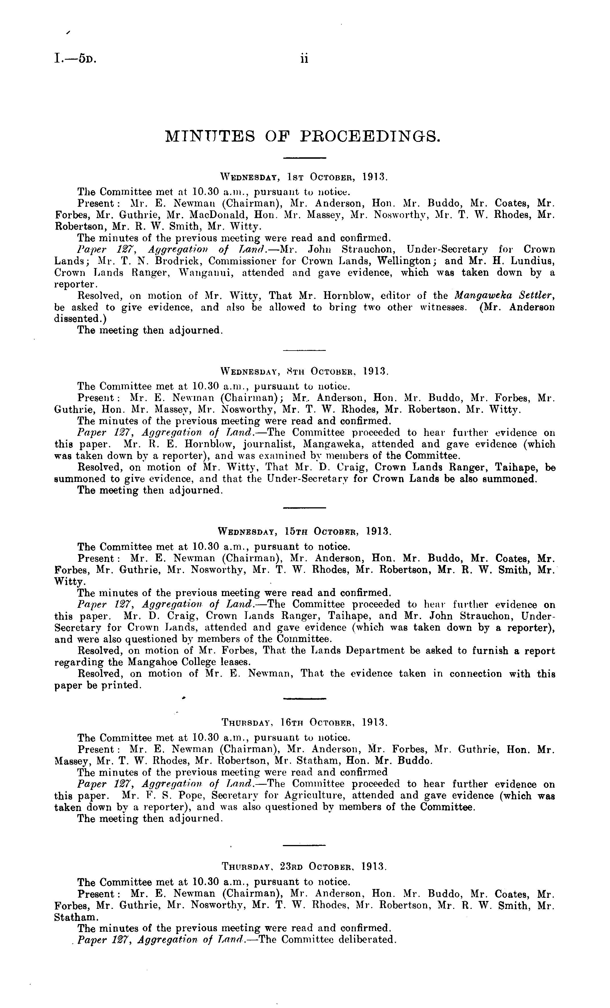 MTNTTTES OF PBOCEEDTNGS. Wednesday, Ist October, 1913. The Committee met at 10.30 a.m., pursuant to notice-. Present: Mr. E. Newman (Chairman), Mr. Anderson, Hon. Mr. Buddo, Mr. Coates, Mr. Forbes, Mr. Guthrie, Mr. Mac Donald, Hon. Mr. Massey, Mr. Nosworthy, Mr. T. W. Rhodes, Mr. Robertson, Mr. R. W. Smith, Mr. Witty. The minutes of the previous meeting were read and confirmed. Paper 127, Aggregation of Land. —Mr. John Strauchon, Under-Secretary for Crown Lands; Mr. T. N. Brodrick, Commissioner for Crown Lands, Wellington; and Mr. H. Lundius, Crown Lands Ranger, Wanganui, attended and gave evidence, which was taken down by a reporter. Resolved, on motion of Mr. Witty, That Mr. Hornblow, editor of the Mangaweka Settler, be asked to give evidence, and also be allowed to bring two other witnesses. (Mr. Anderson dissented.) The meeting then adjourned. Wednesday, Bth October. 191.3. The Committee met at 10.30 a.m., pursuant to notice. Present: Mr. E. Newman (Chairman); Mr. Anderson, Hon. Mr. Buddo, Mr. Forbes, Mr. Guthrie, Hon. Mr. Massey, Mr. Nosworthy, Mr. T. W. Rhodes, Mr. Robertson, Mr. Witty. The minutes of the previous meeting were read and confirmed. Paper 127, Aggregation of Land. —The Committee proceeded to hear further evidence on this paper. Mr. R. E. Hornblow, journalist, Mangaweka, attended and gave evidence (which was taken down by a reporter), and was examined by members of the Committee. Resolved, on motion of Mr. Witty, That Mr. D. Craig, Crown Lands Ranger, Taihape, be summoned to give evidence, and that the Under-Secretary for Crown Lands be also summoned. The meeting then adjourned.