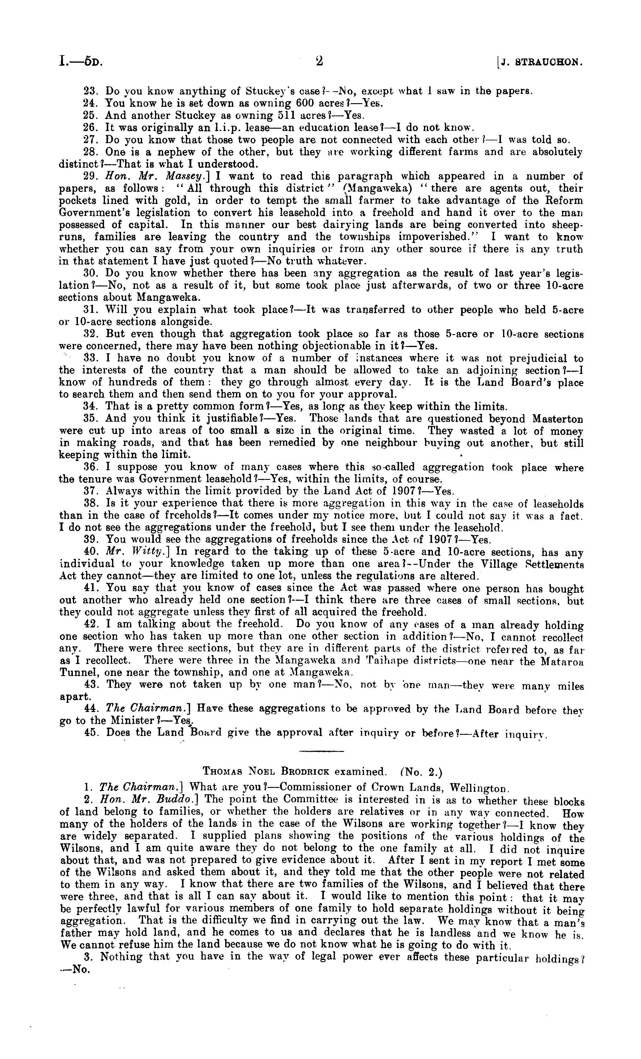 Thomas Noel Beodrick examined. (No. 2.) 1. The Chairman.] What are you?— Commissioner of Crown Lands, Wellington. 2. Hon. Mr. Buddo.] The point the Committee is interested in is as to whether these blocks of land belong to families, or whether the holders are relatives or in any way connected. How many of the holders of the lands in the case of the Wilsons are working together?—l know they are widely separated. I supplied plans showing the positions of the various holdings of the Wilsons, and I am quite aware they do not belong to the one family at all. I did not inquire about that, and was not prepared to give evidence about it. After I sent in my report I met some of the Wilsons and asked them about it, and they told me that the other people were not related to them in any way. I know that there are two families of the Wilsons, and I believed that there were three, and that is all I can say about it. I would like to mention this point : that it may be perfectly lawful for various members of one family to hold separate holdings without it being aggregation. That is the difficulty we find in carrying out the law. We may know that a man's father may hold land, and he comes to us and declares that he is landless and we know he is. We cannot refuse him the land because we do not know what he is going to do with it. 3. Nothing that you have in the way of legal power ever affects these particular holdings? —No.