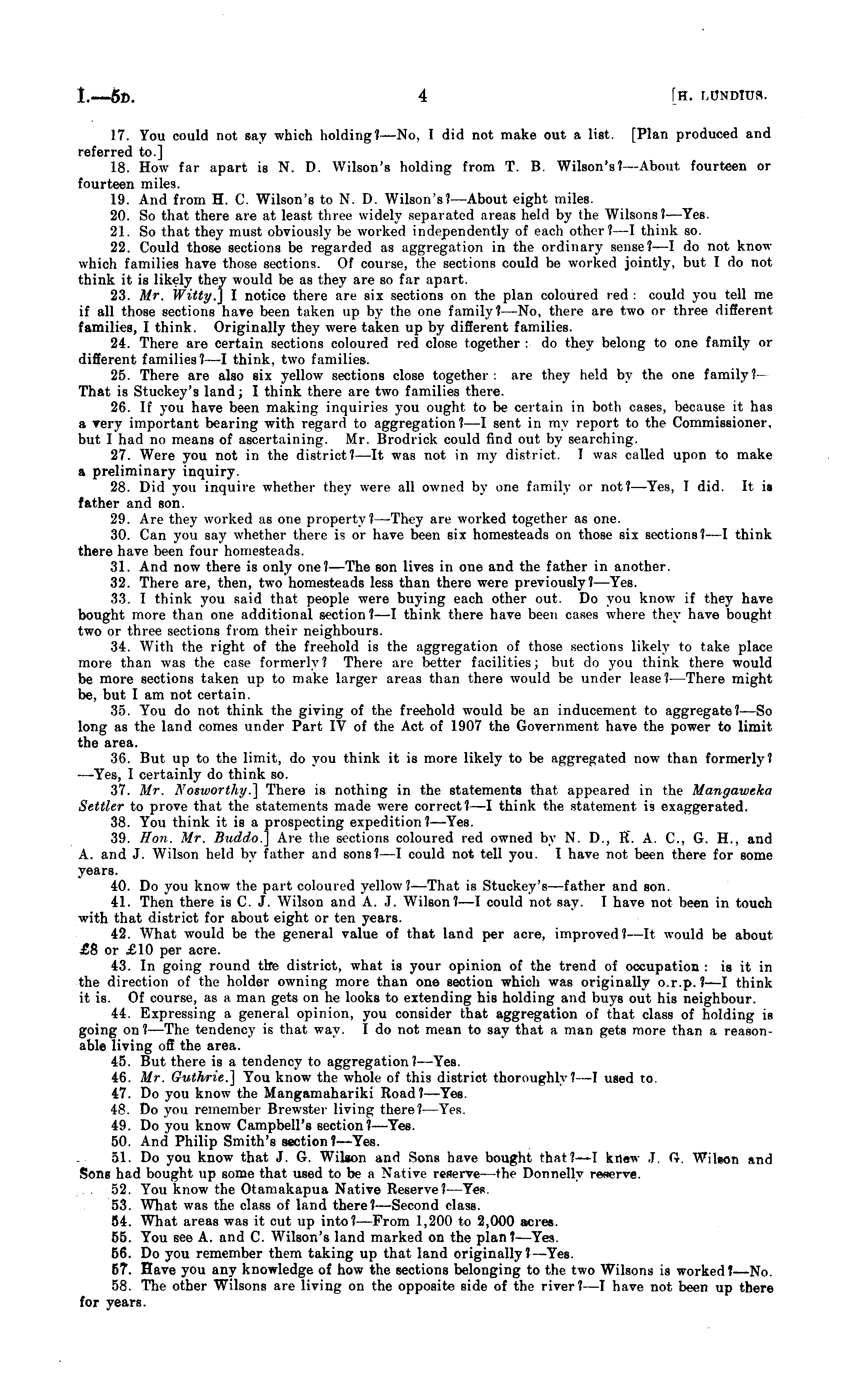 17. You could not say which holding?—No, I did not make out a list. [Plan produced and referred to.] 18. How far apart is N. D. Wilson's holding from T. B. Wilson's? —About fourteen or fourteen miles. 19. And from H. C. Wilson's to N. D. Wilson's? —About eight miles. 20. So that there are at least three widely separated areas held by the Wilsons? —Yes. 21. So that they must obviously be worked independently of each other? —I think so. 22. Could those sections be regarded as aggregation in the ordinary sense? —I do not know which families have those sections. Of course, the sections could be worked jointly, but I do not think it is likely they would be as they are so far apart. 23. Mr. Witty.] I notice there are six sections on the plan coloured red : could you tell me if all those sections have been taken up by the one family?—No, there are two or three different families, I think. Originally they were taken up by different families. 24. There are certain sections coloured red close together : do they belong to one family or different families? —I think, two families. 25. There are also six yellow sections close together: are they held by the one family?--That is Stuckey's land; I think there are two families there. 26. If you have been making inquiries you ought to be certain in both cases, because it has a very important bearing with regard to aggregation? —I sent in my report to the Commissioner, but I had no means of ascertaining. Mr. Brodrick could find out by searching. 27. Were you not in the district? —It was not in my district. I was called upon to make a preliminary inquiry. 28. Did you inquire whether they were all owned by one family or not?— Yes, I did. It is father and son. 29. Are they worked as one property?— They are worked together as one. 30. Can you say whether there is or have been six homesteads on those six sections?—l think there have been four homesteads. 31. And now there is only one? —The son lives in one and the father in another. 32. There are, then, two homesteads less than there were previously?— Yes. 33. I think you said that people were buying each other out. Do you know if they have bought more than one additional section ?—I think there have been cases where they have bought two or three sections from their neighbours. 34. With the right of the freehold is the aggregation of those sections likely to take place more than was the case formerly 1 There are better facilities; but do you think there would be more sections taken up to make larger areas than there would be under lease?— There might be, but I am not certain. 85. You do not think the giving of the freehold would be an inducement to aggregate?—So long as the land comes under Part IV of the Act of 1907 the Government have the power to limit the area. 36. But up to the limit, do you think it is more likely to be aggregated now than formerly? —Yes, I certainly do think so. 37. Mr. Nosworthy.~\ There is nothing in the statements that appeared in the Mangaweka Settler to prove that the statements made were correct?—l think the statement is exaggerated. 38. You think it is a prospecting expedition ?—Yes. 39. Hon. Mr. Buddo.] Are the sections coloured red owned by N. D., R. A. C, G. H., and A. and J. Wilson held by father and sons?—l could not tell you. I have not been there for some years. 40. Do you know the part coloured yellow?— That is Stuckey's—father and son. 41. Then there is C. J. Wilson and A. J. Wilson? —I could not say. I have not been in touch with that district for about eight or ten years. 42. What would be the general value of that land per acre, improved?-—lt would be about £8 or £10 per acre. 43. In going round the district, what is your opinion of the trend of occupation : is it in the direction of the holder owning more than one section which was originally o.r.p. I —l think it is. Of course, as a man gets on he looks to extending his holding and buys out his neighbour. 44. Expressing a general opinion, you consider that aggregation of that class of holding is going on? —The tendency is that way. Ido not mean to say that a man gets more than a reasonable living off the area. 45. But there is a tendency to aggregation ?—Yes. 46. Mr. Guthrie.] You know the whole of this district thoroughly? —-I used to. 47. Do you know the Mangamahariki Road? —Yes. 48. Do you remember Brewster living there? —Yes. 49. Do you know Campbell's section? —Yes. 50. And Philip Smith's section ?—Yes. 51. Do you know that J. G. Wilson and Sons have bought that?—l knew .1. d. Wilson and Sons had bought up some that used to be a Native reserve —the Donnelly reserve. 52. You know the Otamakapua Native Reserve? —Yes. 53. What was the class of land there?— Second class. 54. What areas was it cut up into? —From 1,200 to 2,000 acres. 55. You see A. and C. Wilson's land marked on the plan?— Yes. 56. Do you remember them taking up that land originally? —Yes. 57. Have you any knowledge of how the sections belonging to the two Wilsons is worked?— No. 58. The other Wilsons are living on the opposite side of the river? —I have not been up there for years.