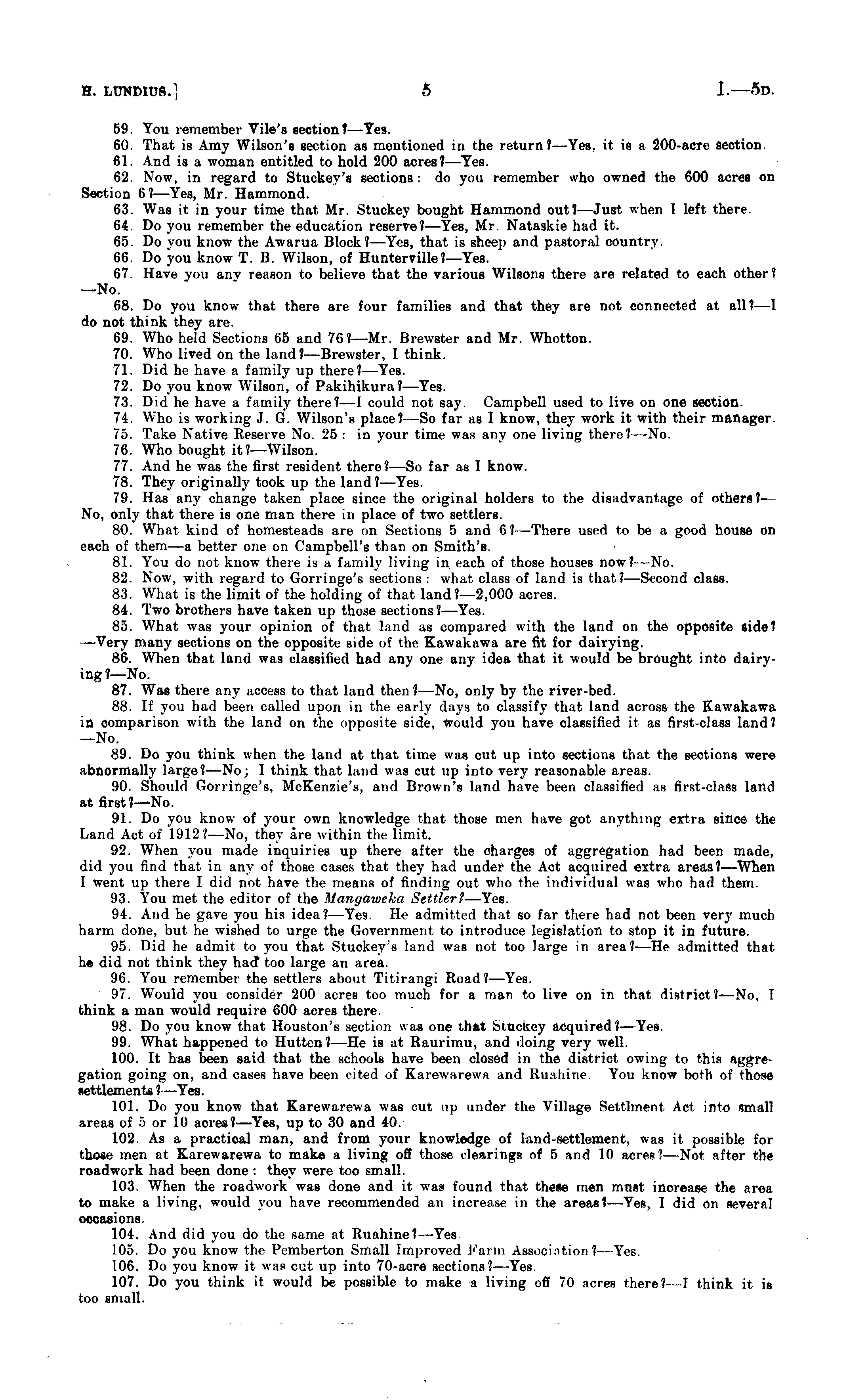 59. You remember Vile's section! —Yes. 60. That is Amy Wilson's section as mentioned in the return? —Yes. it is a 200-acre section. 61. And is a woman entitled to hold 200 acres? —Yes. 62. Now, in regard to Stuckey's sections : do you remember who owned the 600 acres on Section 6?— Yes, Mr. Hammond. 63. Was it in your time that Mr. Stuckey bought Hammond out? —Just when I left there. 64. Do you remember the education reserve? —Yes, Mr. Nataskie had it. 65. Do you know the Awarua Block? —Yes, that is sheep and pastoral country. 66. Do you know T. B. Wilson, of Hunterville?—Yes. 67. Have you any reason to believe that the various Wilsons there are related to each other? —No. 68. Do you know that there are four families and that they are not connected at all?— 1 do not think they are. 69. Who held Sections 65 and 76? —Mr. Brewster and Mr. Whotton. 70. Who lived on the land? —Brewster, I think. 71. Did he have a family up there?— Yes. 72. Do you know Wilson, of Pakihikura? —Yes. 73. Did he have a family there? —I could not say. Campbell used to live on one section. 74. Who is working J. G. Wilson's place?—So far as I know, they work it with their manager. 75. Take Native Reserve No. 25 : in your time was any one living there?— No. 76. Who bought it?— Wilson. 77. And he was the first resident there?—So far as I know. 78. They originally took up the land? —Yes. 79. Has any change taken place since the original holders to the disadvantage of others?— No, only that there is one man there in place of two settlers. 80. What kind of homesteads are on Sections 5 and 6? —There used to be a good house on each of them—a better one on Campbell's than on Smith's. 81. You do not know there is a family living in, each of those houses now? —No. 82. Now, with regard to Gorringe's sections : what class of land is that?— Second class. 83. What is the limit of the holding of that land? —2,000 acres. 84. Two brothers have taken up those sections? —Yes. 85. What was your opinion of that land as compared with the land on the opposite side? —Very many sections on the opposite side of the Kawakawa are fit for dairying. 86. When that land was classified had any one any idea that it would be brought into dairying?— No. 87. Was there any access to that land then? —No, only by the river-bed. 88. If you had been called upon in the early days to classify that land across the Kawakawa in comparison with the land on the opposite side, would you have classified it as first-class land? —No. 89. Do you think when the land at that time was cut up into sections that the sections were abnormally large?—No; I think that land was cut tip into very reasonable areas. 90. Should Gorringe's, McKenzie's, and Brown's land have been classified as first-class land at first? —No. 91. Do you know of your own knowledge that those men have got anything extra since the Land Act of 1912?—N0, they are within the limit. 92. When you made inquiries up there after the charges of aggregation had been made, did you find that in any of those cases that they had under the Act acquired extra areas? —When 1 went up there I did not have the means of finding out who the individual was who had them. 93. You met the editor of the Mangaweka Settler? — Yes. 94. And he gave you his idea?- —Yes. He admitted that so far there had not been very much harm done, but he wished to urge the Government to introduce legislation to stop it in future. 95. Did he admit to you that Stuckey's land was not too large in area?—He admitted that he did not think they had , too large an area. 96. You remember the settlers about Titirangi Road? —Yes. 97. Would you consider 200 acres too much for a man to live on in that district?—No, I think a man would require 600 acres there. 98. Do you know that Houston's section was one that isiuckey acquired? —Yee. 99. What happened to Hutten I —He is at Raurimu, and doing very well. 100. It has been said that the schools have been closed in the district owing to this aggregation going on, and cases have been cited of Karewarewa and Ruahine. You know both of those settlements ?—Yes. 101. Do you know that Karewarewa was cut up under the Village Settlment Act into small areas of 5 or 10 acres? —Yes, up to 30 and 40. 102. As a practical man, and from your knowledge of land-settlement, was it possible for those men at Karewarewa to make a living off those olearings of 5 and 10 acres'!— Not after the roadwork had been done : they were too small. 103. When the roadwork was done and it was found that these men must increase the area to make a living, would you have recommended an increase in the areas? —Yes, I did on several occasions. 104. And did you do the same at Ruahine? —Yes 105. Do you know the Pemberton Small Improved Farm Association ?—Yes. 106. Do you know it was cut up into 70-acre sections?— Yes. 107. Do you think it would be possible to make a living off 70 acres there? —I think it is too small.