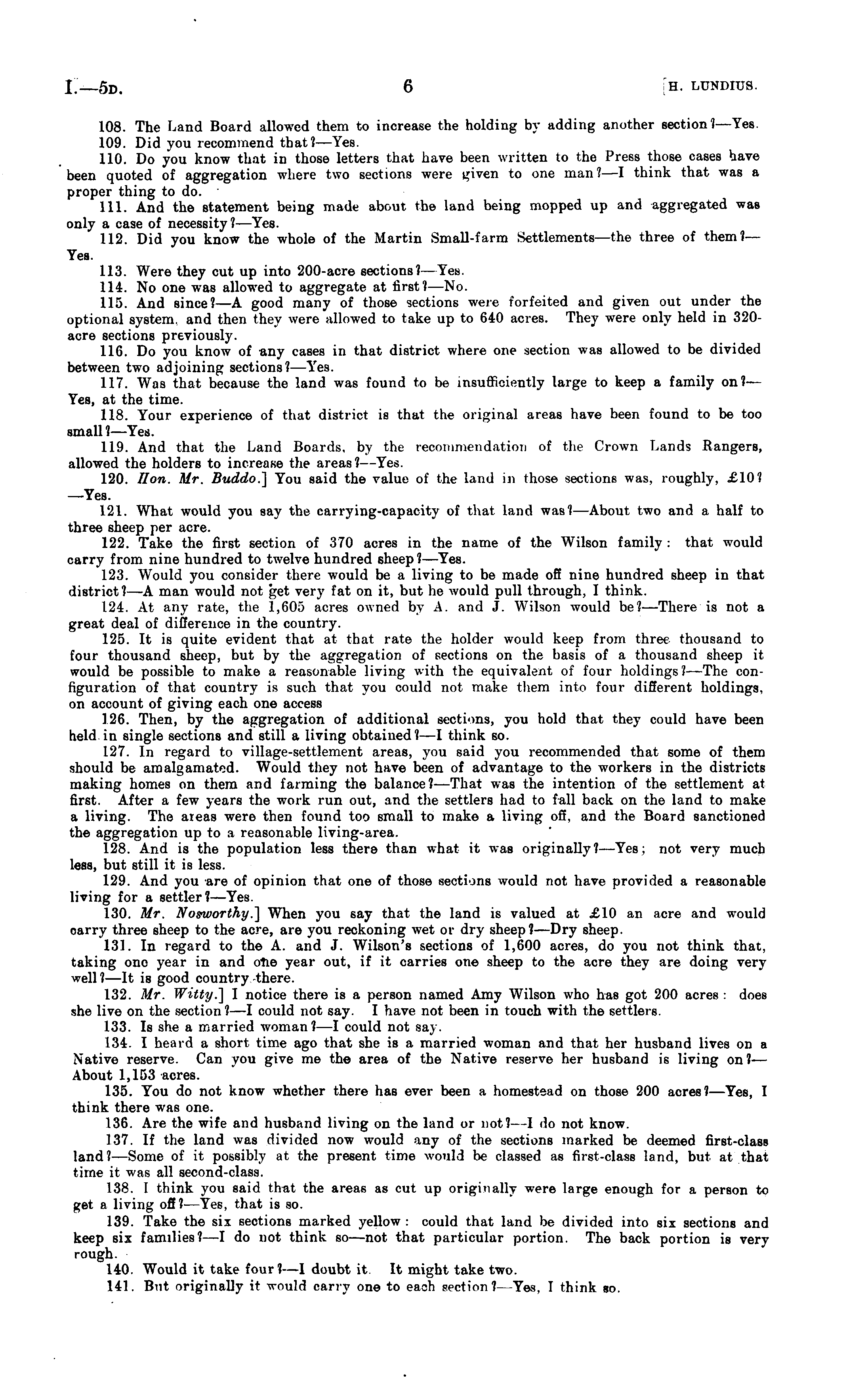 108. The Land Board allowed them to increase the holding by adding another section?— Yes. 109. Did you recommend that? —Yes. 110. Do you know that in those letters that have been written to the Press those cases have been quoted of aggregation where two sections were given to one man?—l think that was a proper thing to do. 111. And the statement being made about the land being mopped up and aggregated was only a case of necessity? —Yes. 112. Did you know the whole of the Martin Small-farm Settlements —the three of them?— Yes. 113. Were they cut up into 200-acre sections? —Yes. 114. No one was allowed to aggregate at first? —No. 115. And since? —A good many of those sections were forfeited and given out under the optional system, and then they were allowed to take up to 640 acres. They were only held in 320--acre sections previously. 116. Do you know of any cases in that district where one section was allowed to be divided between two adjoining sections? —Yes. 117. Was that because the land was found to be insufficiently large to keep a family on? — Yes, at the time. 118. Your experience of that district is that the original areas have been found to be too small ?—Yes. 119. And that the Land Boards, by the recommendation of the Crown Lands Rangers, allowed the holders to increase the areas? —Yes. 120. Hon. Mr. Buddo.] You said the value of the land in those sections was, roughly, £10? —Yes. 121. What would you say the carrying-capacity of that land was? —About two and a half to three sheep per acre. 122. Take the first section of 370 acres in the name of the Wilson family : that would carry from nine hundred to twelve hundred sheep? —Yes. 123. Would you consider there would be a living to be made off nine hundred sheep in that district?—A man would not get very fat on it, but he would pull through, I think. 124. At any rate, the 1,605 acres owned by A. and J. Wilson would be?— There is not a great deal of difference in the country. 125. It is quite evident that at that rate the holder would keep from three thousand to four thousand sheep, but by the aggregation of sections on the basis of a thousand sheep it would be possible to make a reasonable living with the equivalent of four holdings?— The configuration of that country is such that you could not make them into four different holdings, on account of giving each one access 126. Then, by the aggregation of additional sections, you hold that they could have been held in single sections and still a living obtained? —I think so. 127. In regard to village-settlement areas, you said you recommended that some of them should be amalgamated. Would they not have been of advantage to the workers in the districts making homes on them and farming the balance? —That was the intention of the settlement at first. After a few years the work run out, and the settlers had to fall back on the land to make a living. The areas were then found too small to make a living off, and the Board sanctioned the aggregation up to a reasonable living-area. 128. And is the population less there than what it was originally? —Yes; not very much less, but still it is less. 129. And you are of opinion that one of those sections would not have provided a reasonable living for a settler?— Yes. 130. Mr. Nosworthy.] When you say that the land is valued at £10 an acre and would oarry three sheep to the acre, are you reckoning wet or dry sheep?— Dry sheep. 131. In regard to the A. and J. Wilson's sections of 1,600 acres, do you not think that, taking one year in and otic year out, if it carries one sheep to the acre they are doing very well? —It is good country there. 132. Mr. Witty. ,] I notice there is a person named Amy Wilson who has got 200 acres : does she live on the section? —I could not say. I have not been in touch with the settlers. 133. Is she a married woman?—l could not say. 134. I heard a short time ago that she is a married woman and that her husband lives on a Native reserve. Can you give me the area of the Native reserve her husband is living on ?— About 1,153 acres. 135. You do not know whether there has ever been a homestead on those 200 acres?— Yes, I think there was one. 136. Are the wife and husband living on the land or not?—l do not know. 137. If the land was divided now would any of the sections marked be deemed first-class land? —Some of it possibly at the present time would be classed as first-class land, but at that time it was all second-class. 138. I think you said that the areas as cut up originally were large enough for a person to get a living off? —Yes, that is so. 139. Take the six sections marked yellow : could that land be divided into six sections and keep six families? —I do not think so —not that particular portion. The back portion is very rough. 140. Would it take four?—l doubt it It might take two. 141. But originally it would carry one to each section?— Yes, I think go.