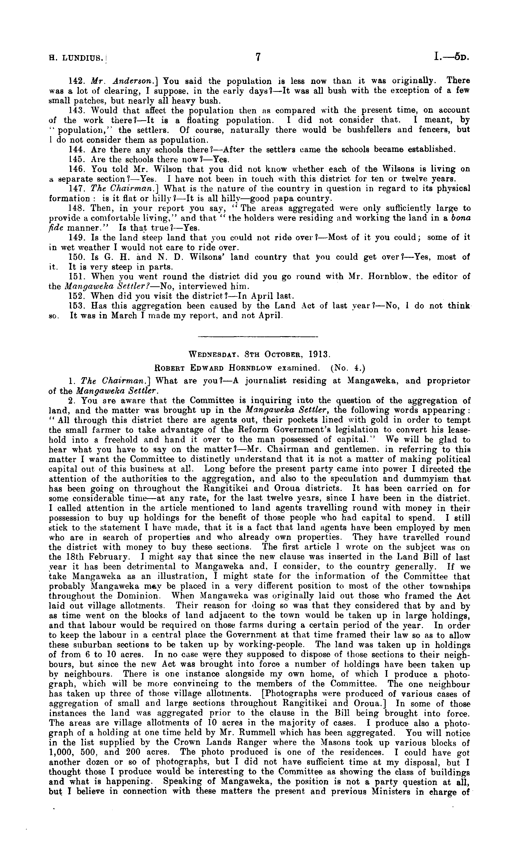 Wednesday. Bth October, 1913. Robert Edward Hornblow examined. (No. 4.) 1. The Chairman.] What are you?—A journalist residing at Mangaweka, and proprietor of the Mangaweka Settler. 2. You are aware that the Committee is inquiring into the question of the aggregation of land, and the matter was brought up in the Mangaweka Settler, the following words appearing : " All through this district there are agents out, their pockets lined with gold in order to tempt the small farmer to take advantage of the Reform Government's legislation to convert his leasehold into a freehold and hand it over to the man possessed of capital." We will be glad to hear what you have to say on the matter? —Mr. Chairman and gentlemen, in referring to this matter I want the Committee to distinctly understand that it is not a matter of making political capital out of this business at all. Long before the present party came into power I directed the attention of the authorities to the aggregation, and also to the speculation and dummyism that has been going on throughout the Rangitikei and Oroua districts. It has been carried on for some considerable time —at any rate, for the last twelve years, since I have been in the district. I called attention in the article mentioned to land agents travelling round with money in their possession to buy up holdings for the benefit of those people who had capital to spend. I still stick to the statement I have made, that it is a fact that land agents have been employed by men who are in search of properties and who already own properties. They have travelled round the district with money to buy these sections. The first article 1 wrote on the subject was on the 18th February. I might say that since the new clause was inserted in the Land Bill of last year it has been detrimental to Mangaweka and, I consider, to the country generally. If we take Mangaweka as an illustration, I might state for the information of the Committee that probably Mangaweka may be placed in a very different position to most of the other townships throughout the Dominion. When Mangaweka was originally laid out those who framed the Act laid out village allotments. Their reason for doing so was that they considered that by and by as time went on the blocks of land adjacent to the town would be taken up in large holdings, and that labour would be required on those farms during a certain period of the year. In order to keep the labour in a central place the Government at that time framed their law so as to allow these suburban sections to be taken up by working-people. The land was taken up in holdings of from 6to 10 acres. In no case were they supposed to dispose of those sections to their neighbours, but since the new Act was brought into force a number of holdings have been taken up by neighbours. There is one instance alongside my own home, of which I produce a photograph, which will be more convincing to the members of the Committee. The one neighbour has taken up three of those village allotments. [Photographs were produced of various cases of aggregation of small and large sections throughout Rangitikei and Oroua.] In some of those instances the land was aggregated prior to the clause in the Bill being brought into force. The areas are village allotments of 10 acres in the majority of cases. I produce also a photograph of a holding at one time held by Mr. Rummell which has been aggregated. You will notice in the list supplied by the Crown Lands Ranger where the Masons took up various blocks of 1,000, 500, and 200 acres. The photo produced is one of the residences. I could have got another dozen or so of photographs, but I did not have sufficient time at my disposal, but I thought those I produce would be interesting to the Committee as showing the class of buildings and what is happening. Speaking of Mangaweka, the position is not a party question at all, but I believe in connection with these matters the present and previous Ministers in charge of