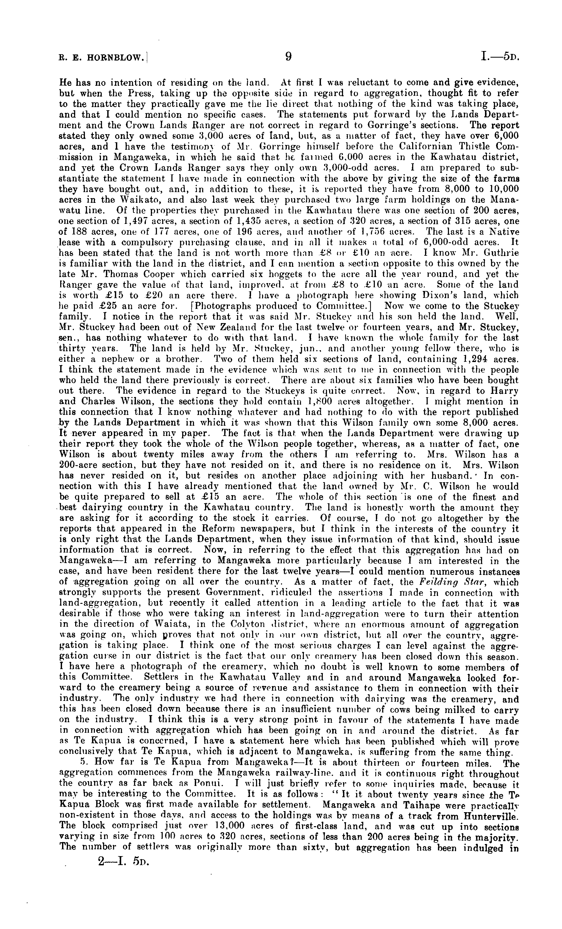 He has no intention of residing on the land. At first 1 was reluctant to come and give evidence, but when the Press, taking up the opposite side in regard to aggregation, thought fit to refer to the matter they practically gave me the lie direct that nothing of the kind was taking place, and that I could mention no specific cases. The statements put forward by the Lands Department and the Crown Lands Ranger are not correct in regard to Gorringe's sections. The report stated they only owned some 3,000 acres of land, but, as a matter of fact, they have over 6,000 acres, and 1 have the testimony of Mr. Corringe himself before the Californian Thistle Commission in Mangaweka, in which he said that he farmed 6,000 acres in the Kawhatau district, and yet the Crown Lands Ranger says they only own 3,000-odd acres. I am prepared to substantiate the statement I have made in connection with the above by giving the size of the farms they have bought, out, and, in addition to these, it is reported they have from 8,000 to 10,000 acres in the Waikato, and also last week they purchased two large farm holdings on the Manawatu line. Of the properties they purchased in the Kawhatau there was one section of 200 acres, one section of 1,497 acres, a section of 1,435 acres, a section of 320 acres, a section of 315 acres, one of 188 acres, one of 177 acres, one of 196 acres, and another of 1,756 acres. The last is a Native lease with a compulsory purchasing clause, and in all it makes a total of 6,000-odd acres. It has been stated that the land is not worth more than £8 or €10 an acre. I know Mr. Guthrie is familiar with the land in the district, and I can mention a section opposite to this owned by the late Mr. Thomas Cooper which carried six hoggets to the acre all the year round, and yet the Hanger gave the value of that land, improved, at from £8 to £10 an acre. Some of the land is worth £15 to £20 an acre there. I have a photograph here showing Dixon's land, which he paid £25 an acre for. [Photographs produced to Committee.] Now we come to the Stuckey family. I notice in the report that it was said Mr. Stuckey and his son held the land. Well, Mr. Stuckey had been out of New Zealand for the last twelve or fourteen years, and Mr. Stuckey, sen., has nothing whatever to do with that land. I have known the whole family for the last thirty years. The land is held by Mr. Stuckey, jun.. and another young fellow there, who is either a nephew or a brother. Two of them held six sections of land, containing 1,294 acres. I think the statement made in the evidence which was sent to me in connection with the people who held the land there previously is correct. There are about six families who have been bought out there. The evidence in regard to the Stuekeys is quite correct. Now, in regard to Harry and Charles Wilson, the sections they hold contain 1,800 acres altogether. I might mention in this connection that I know nothing whatever and had nothing to do with the report published by the Lands Department in which it was shown that this Wilson family own some 8,000 acres. It never appeared in my paper. The fact is that when the Lands Department were (hawing up their report they took the whole of the Wilson people together, whereas, as a matter of fact, one Wilson is about twenty miles away from the others I am referring to. Mrs. Wilson has a 200-acre section, but they have not resided on it, and there is no residence on it. Mrs. Wilson has never resided on it, but resides on another place adjoining with her husband. ' In connection with this I have already mentioned that the land owned by Mr. C. Wilson he would be quite prepared to sell at £15 an acre. The whole of this section is one of the finest and best dairying country in the Kawhatau country. The land is honestly worth the amount they are asking for it according to the stock it carries. Of course, I do not go altogether by the reports that appeared in the Reform newspapers, but I think in the interests of the country it is only right that the Lands Department, when they issue information of that kind, should issue information that is correct. Now, in referring to the effect that this aggregation has had on Mangaweka—l am referring to Mangaweka more particularly because I am interested in the case, and have been resident there for the last twelve years—l could mention numerous instances of aggregation going on all over the country. As a matter of fact, the Feilding Star, which strongly supports the present Government, ridiculed the assertions I made in connection with land-aggregation, but recently it called attention in a leading article to the fact that it was desirable if those who were taking an interest in land-aggregation were to turn their attention in the direction of Waiata, in the Colyton district, where an enormous amount of aggregation was going on, which proves that not only in our own district, but all over the country, aggregation is taking place. I think one of the most serious charges I can level against the aggregation curse in our district is the fact that our only creamery lias been closed down this season. I have here a photograph of the creamery, which no doubt is well known to some members of this Committee. Settlers in the Kawhatau Valley and in and around Mangaweka looked forward to the creamery being a source of revenue and assistance to them in connection with their industry. The only industry we had there in connection with dairying was the creamery, and this has been closed down because there is an insufficient number of cows being milked to carry on the industry. I think this is a very strong point in favour of the statements I have made in connection with aggregation which has been going on in and around the district. As far as Te Kapua is concerned, I have a statement here which has been published which will prove conclusively that Te Kapua, which is adjacent to Mangaweka. is suffering from the same thing. 5. How far is 