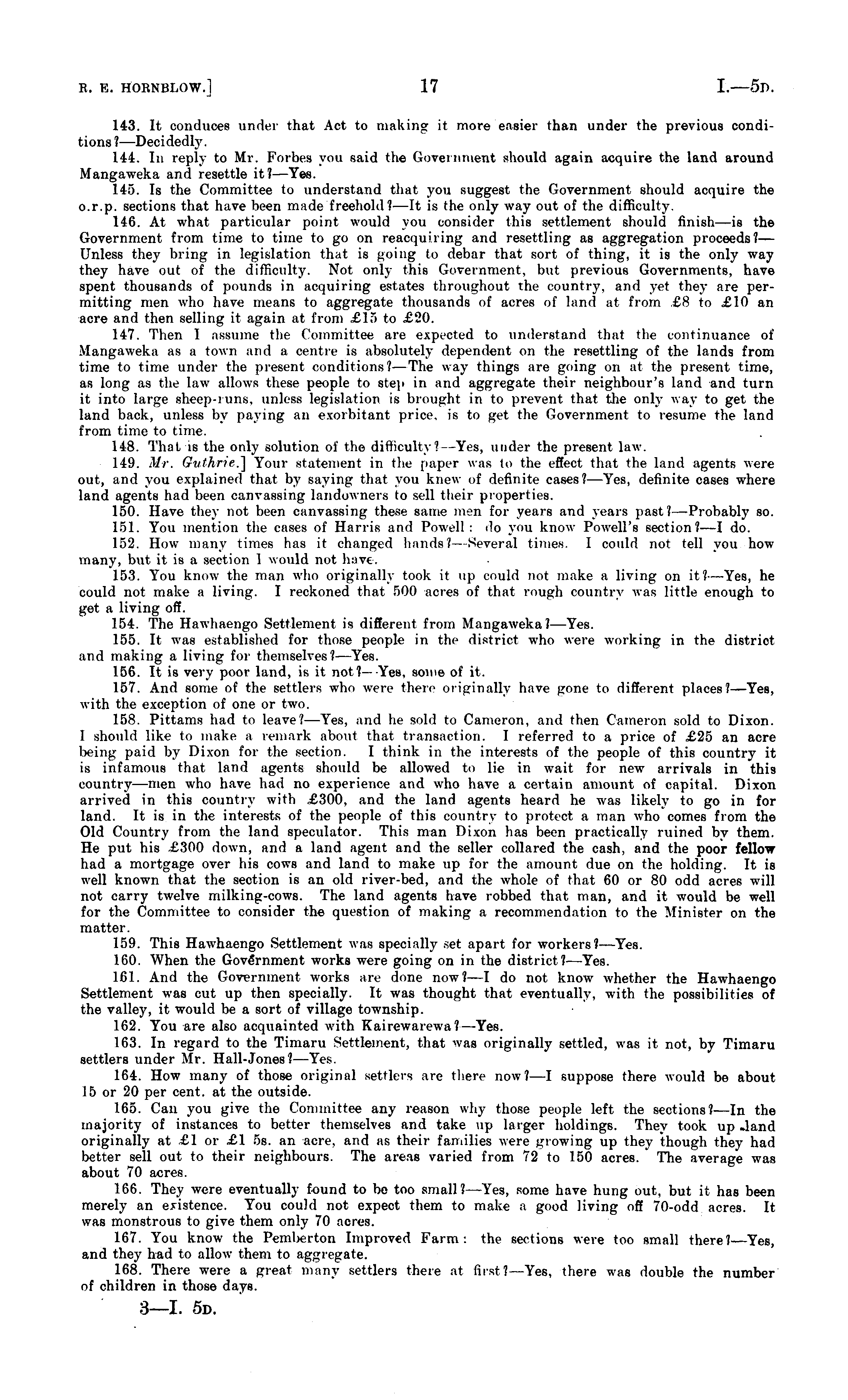 143. It conduces under that Act to making it more easier than under the previous conditions ? —Decidedly. 144. In reply to Mr. Forbes you said the Government should again acquire the land around Mangaweka and resettle it? —Yes. 145. Is the Committee to understand that you suggest the Government should acquire the o.r.p. sections that have been miide freehold? —It is the only way out of the difficulty. 146. At what particular point would you consider this settlement should finish —is the Government from time to time to go on reacquiring and resettling as aggregation proceeds?— Unless they bring in legislation that is going to debar that sort of thing, it is the only way they have out of the difficulty. Not only this Government, but previous Governments, have spent thousands of pounds in acquiring estates throughout the country, and yet they are permitting men who have means to aggregate thousands of acres of land at from £8 to £10 an acre and then selling it again at from £15 to £20. 147. Then I assume the Committee are expected to understand that the continuance of Mangaweka as a town and a centre is absolutely dependent on the resettling of the lands from time to time under the present conditions? —The way things are going on at the present time, as long as the law allows these people to step in and aggregate their neighbour's land and turn it into large sheep-runs, unless legislation is brought in to prevent that the only way to get the land back, unless by paying an exorbitant price, is to get the Government to resume the land from time to time. 148. That is the only solution of the difficulty?— Yes, under the present law. 149. Mr. Gvthrie.} Your statement in the paper was to tiie effect that the land agents were out, and you explained that by saving that you knew of definite cases?— Yes, definite cases where land agents had been canvassing landowners to sell their properties. 150. Have they not been canvassing thes* l sum" men for years and years past?—-Probably so. 151. You mention the cases of Harris and Powell : do you know Powell's section?—l do. 152. How many times has it changed hands? —Several times. I could not tell you how many, but it is a section 1 would not have. 153. You know the man who originally took it up could not make a living on it?— Yes, he could not make a living. I reckoned that 500 acres of that rough country was little enough to get a living off. 154. The Hawhaengo Settlement is different from Mangaweka?—Yes. 155. It was established for those people in the district who wove working in the district and making a living for themselves?— Yes. 156. It is very poor land, is it not?— Yes, some of it. 157. And some of the settlers who were there originally have gone to different places?— Yes, with the exception of one or two. 158. Pittams had to leave?— Yes, and he sold to Cameron, and then Cameron sold to Dixon. I should like to make a remark about that transaction. I referred to a price of £25 an acre being paid by Dixon for the section. I think in the interests of the people of this country it is infamous that land agents should be allowed to lie in wait for new arrivals in this country —men who have had no experience and who have a certain amount of capital. Dixon arrived in this country with £300, and the land agents heard he was likely to go in for land. It is in the interests of the people of this country to protect a man who comes from the Old Country from the land speculator. This man Dixon lias been practically ruined by them. He put his £300 down, and a land agent and the seller collared the cash, and the poor fellow had a mortgage over his cows and land to make up for the amount due on the holding. It is well known that the section is an old river-bed, and the whole of that 60 or 80 odd acres will not carry twelve milking-cows. The land agents have robbed that man, and it would be well for the Committee to consider the question of making a recommendation to the Minister on the matter. 159. This Hawhaengo Settlement was specially set apart for workers?— Yes. 160. When the Government works were going on in the district?— Yes. 161. And the Government works are done now?—l do not know whether the Hawhaengo Settlement was cut up then specially. It was thought that eventually, with the possibilities of the valley, it would be a sort of village township. 162. You are also acquainted with Kairewarewa?—Yes. 163. In regard to the Timaru Settlement, that was originally settled, was it not, by Timaru settlers under Mr. Hall-Jones?—Yes. 164. How many of those original settlers are there now?—l suppose there would be about 15 or 20 per cent, at the outside. 165. Can you give the Committee any reason why those people left the sections?-—ln the majority of instances to better themselves and take up larger holdings. They took up -land originally at £1 or £1 ss. an acre, and as their families were growing up they though they had better sell out to their neighbours. The areas varied from 72 to 150 acres. The average was about 70 acres. 166. They were eventually found to be too small? —Yes, some have hung out, but it has been merely an existence. You could not expect them to make a good living off 70-odd acres. It was monstrous to give them only 70 acres. 167. You know the Peml>erton Improved Farm: the sections were too small there? —Yes, and they had to allow them to aggregate. 168. There were a great many settlers there at first?— Yes, there was double the number of children in those days.