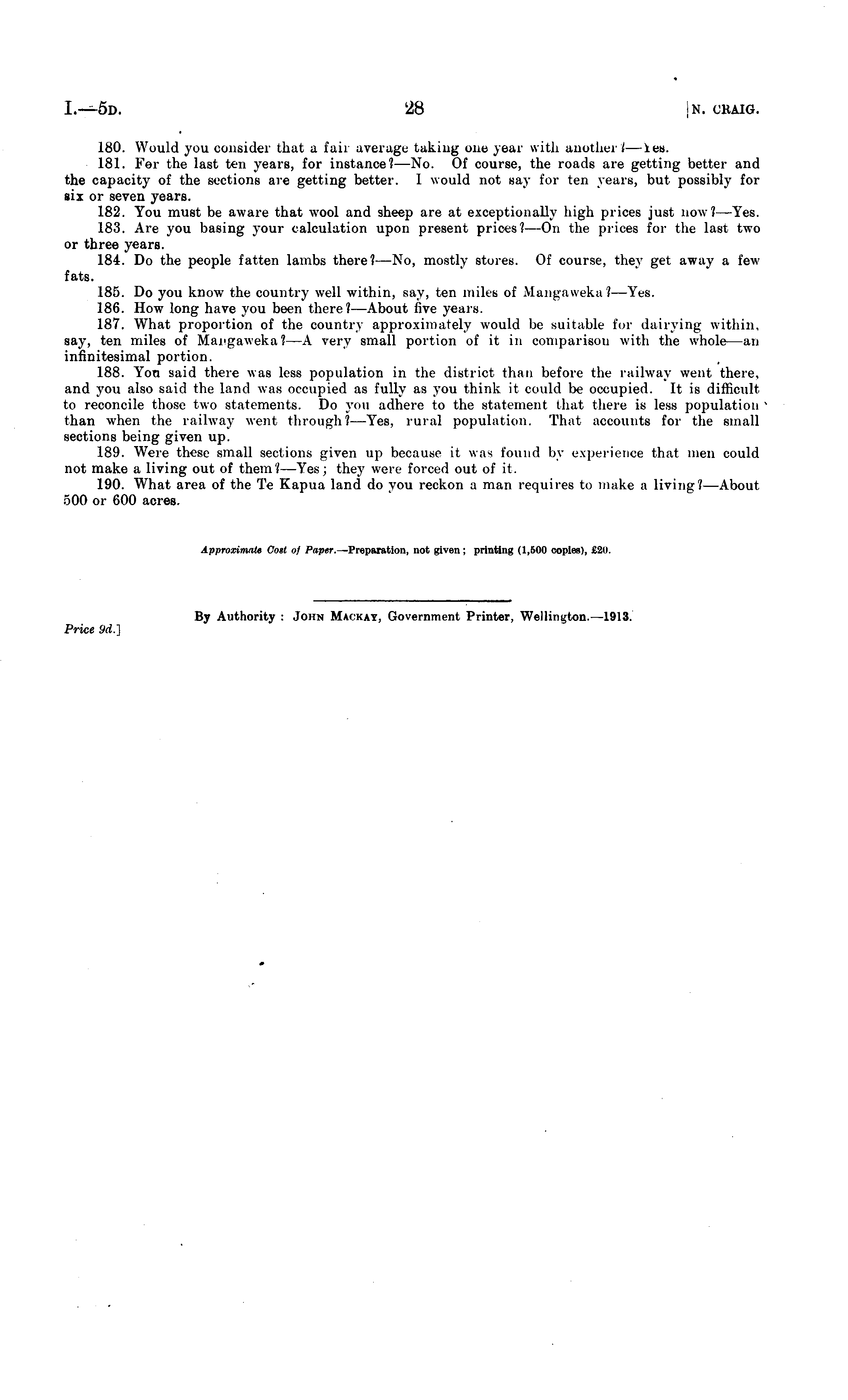 180. Would you consider that a fair average taking one year with another /—les. 181. For the last ten years, for instance? —No. Of course, the roads are getting better and the capacity of the sections are getting better. 1 would not say for ten years, but possibly for six or seven years. 182. You must be aware that wool and sheep are at exceptionally high prices just now? —Yes. 183. Are you basing your calculation upon present prices?—On the prices for the last two or three years. 184. Do the people fatten lambs there? —No, mostly stores. Of course, they get away a few fats. 185. Do you know the country well within, say, ten miles of Mangaweka? —Yus. 186. How long have you been there?— About five years. 187. What proportion of the country approximately would be suitable for dairying within, say, ten miles of Maugawekaf —A very small portion of it in comparison with the whole—an infinitesimal portion. 188. Yon said there was less population in the district than before the railway went there, and you also said the land was occupied as fully as you think it could be occupied. It is difficult to reconcile those two statements. Do you adhere to the statement that there is less population than when the railway went through?— Yes, rural population. That accounts for the small sections being given up. 189. Were these small sections given up because it was found by experience that men could not make a living out of them?— Yes; they were forced out of it. 190. What area of the Tc Kapua land do you reckon a man requires to make a living?— About 500 or 600 acres.