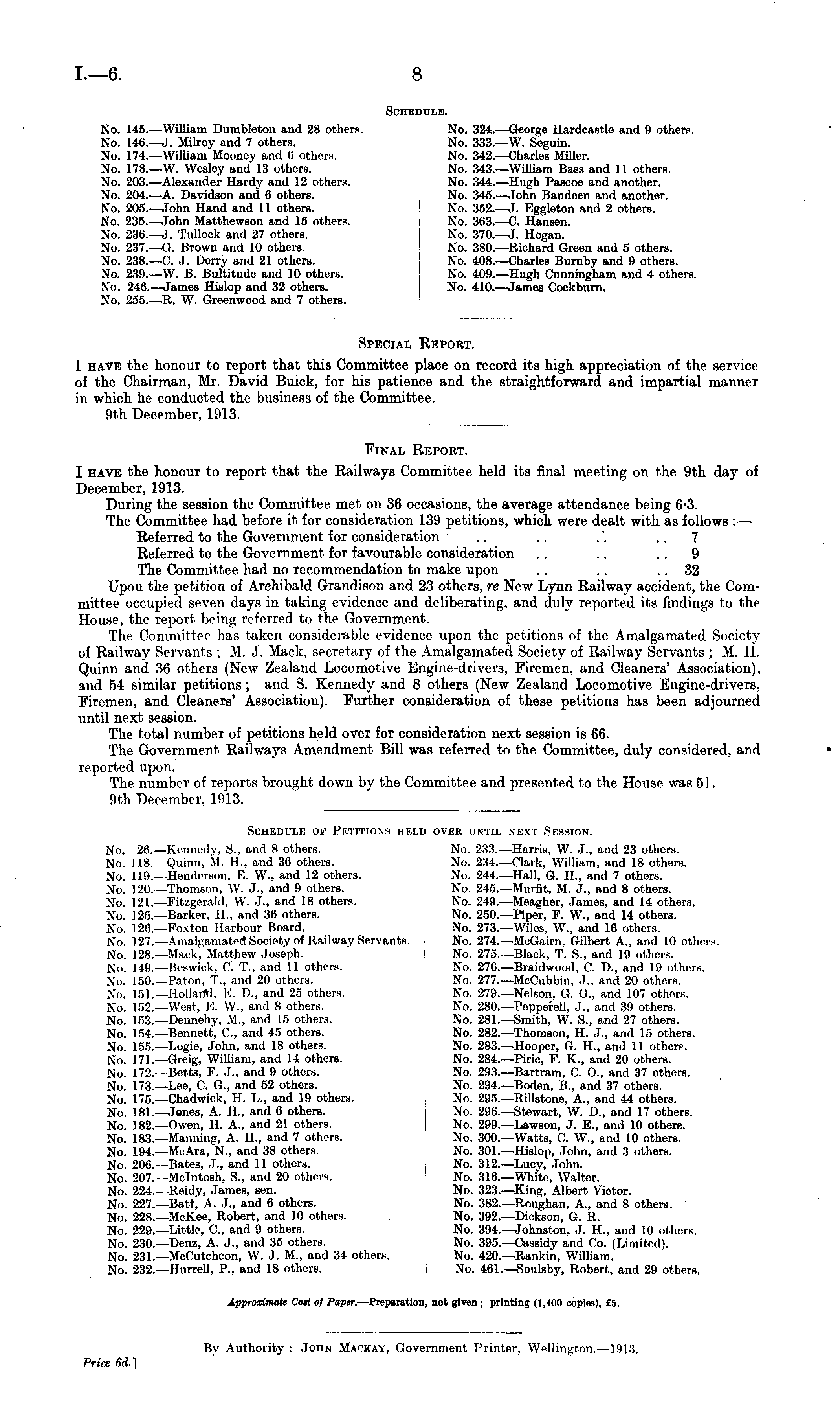 Special Report. I have the honour to report that this Committee place on record its high appreciation of the service of the Chairman, Mr. David Buick, for his patience and the straightforward and impartial manner in which he conducted the business of the Committee. 9th December, 1913.