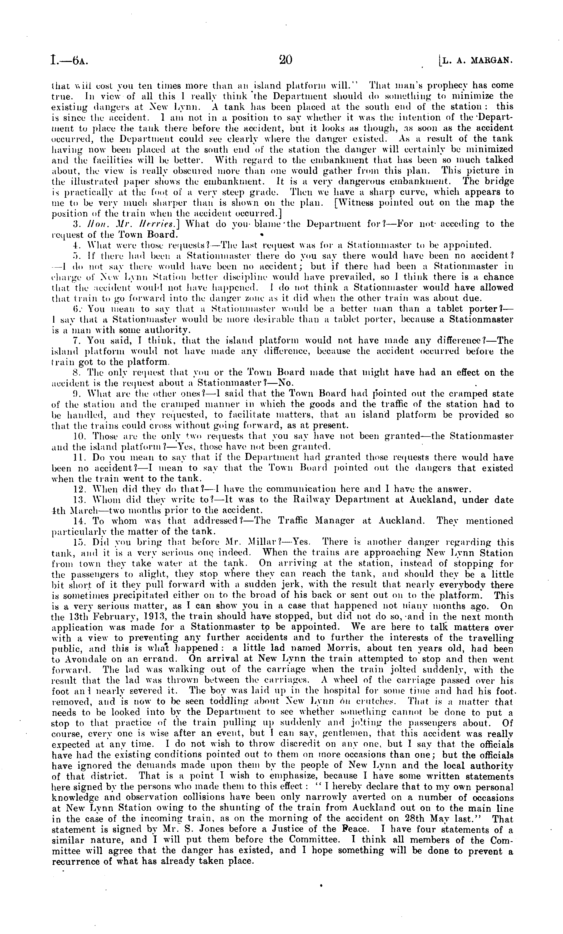 that ivilJ cost you ten times more than an island platform will." That man's prophecy has come true. In view of all this 1 realty think tlie Department should do something to minimize the existing dangers at New- Lynn. A tank has been placed at the south end of the station: this is since the accident. 1 am not in a position to say whether it was the intention of the Department to place the tank there before the accident, bill it looks as though, as soon as the accident occurred, the Department could see clearly where the danger existed. As a result of the tank having now been placed at the south end of the station the danger will certainly be minimized and the facilities will be better. With regard to the embankment that has been so much talked about, the view is really obscured more than one would gather from this plan. This picture in the illustrated paper shows the embankment. It is a wvy dangerous embankment. The bridge is practically at the foot of a very steep grade. Then we have a sharp curve, which appears to me to be very much sharper than is shown on the plan. [Witness pointed out on the map the position c]' the train when the accident occurred.] 3. Hon. Mr. Herries.] What do you-blame'the Department for? —For not acceding to the request of the Town Board. • I. What were those requests? The last request was for a Stationmaster to be appointed. 5. If there had been a St at iouuiastei there do you say there would have been no accident? —I do not say there would have been no accident; but if there had been a Stationmaster in charge of Xnv Lynn Station better discipline would have prevailed, so I think there is a chance that the accident would not have happened. I do not think a Stationmaster would have alloxved that train to go forward into the' danger /one as it did when the other train was about due. (>.■ You mean to say that a Stationmaster would be a better man than a tablet porter?— I say thai a Stationmaster would be more desirable than a tablet porter, because a Stationmaster is a man with some authority. 7. You said, I think, that the island platform would not have made any difference?— The island platform would not have made any difference, because the accident occurred before the i rain got to the platform. 8. The only request that you or the Town Board made that might have had an effect on the accident is the request about a Stationmaster?—No. !). What are the other ones? —1 said that the Town Board had pointed mil the cramped state of the station and the cramped manner in which tlie goods and tin' traffic of the station had to be handled, and they requested, to facilitate matters, that an island platform be provided so that the trains could cross without going forward, as at present. 10. Those are the only two requests that you say have not been granted—the Stationmaster and the island platform? —Yes. those have not been granted. 11. Do you mean to say that if the Department had granted those requests there would have been no accident?—l mean to say that the Town Board pointed out the dangers that existed when the train went to the tank. 12. When did they do that?—l have th" communication bore and 1 have the answer. 13. Whom did they write to? —It was to the Railway Department at Auckland, under date Ith March two months prior to the accident. 14. To whom was that addressed? —The Traffic Manager at Auckland. They mentioned particularly the matter of the tank. 15. Did you bring that before Mr. Millar? —Yes. There is another danger regarding this tank, and it is a very serious one indeed. When the trains are approaching New Lynn Station from town they take water at the tank. On arriving at the station, instead of stopping for the passengers to alight, they stop where they can reach tho tank, and should they be a little bit short of it they pull forward with a sudden jerk, with the result that nearly everybody there is sometimes precipitated either on to the broad of his back or sent out on to the platform. This is a wry serious matter, as I can show you in a case that happened not niany months ago. On ihe 13th February, 1913, the train should have stopped, but did not do so, and in the next month application was made for a Stationmaster to be appointed. We are here to talk matters over with a view to preventing any further accidents and to further the interests of the travelling public, and 11 lis is what happened : a little lad named Morris, about ten years old, had been to Avondale on an errand. On arrival at Nexv Lynn tho train attempted to stop and then went forward. The lad was walking out of the carriage when the train jolted suddenly, with the result that the lad was thrown between the carriages. A wheel of the carriage passed over his foot an 1 nearly severed it. The boy was laid up in the hospital for some time and had his foot, removed, and is now to be seen toddling about New Lvnn on crutches. That is a matter that needs to be looked into by the Department to see whether something cannot be done to put a stop to that practice of the train pulling up suddenly ami jolting the passengers about. Of course, every one is wise after an event, but I can say, gentlemen, that this accident was really expected at any time. I do not wish to throw discredit on any one. but 1 say that the officials have had the existing conditions pointed out to them on more occasions than one; but the officials have ignored tho demands made upon them by tho people of Now Lynn and the local authority of that district. That is a point I wish to emphasize, because 1 have some written statement's here signed by the persons who made them to this effect : "I hereby declare that to my own personal knowledge and observation collisions have been only narrowly averted on a number of occasions at Now Lvnn Station owing to the shunting of tho train from Auckland out on to the main line in the case of the incoming train, as on the morning of the accident on 28th May last."