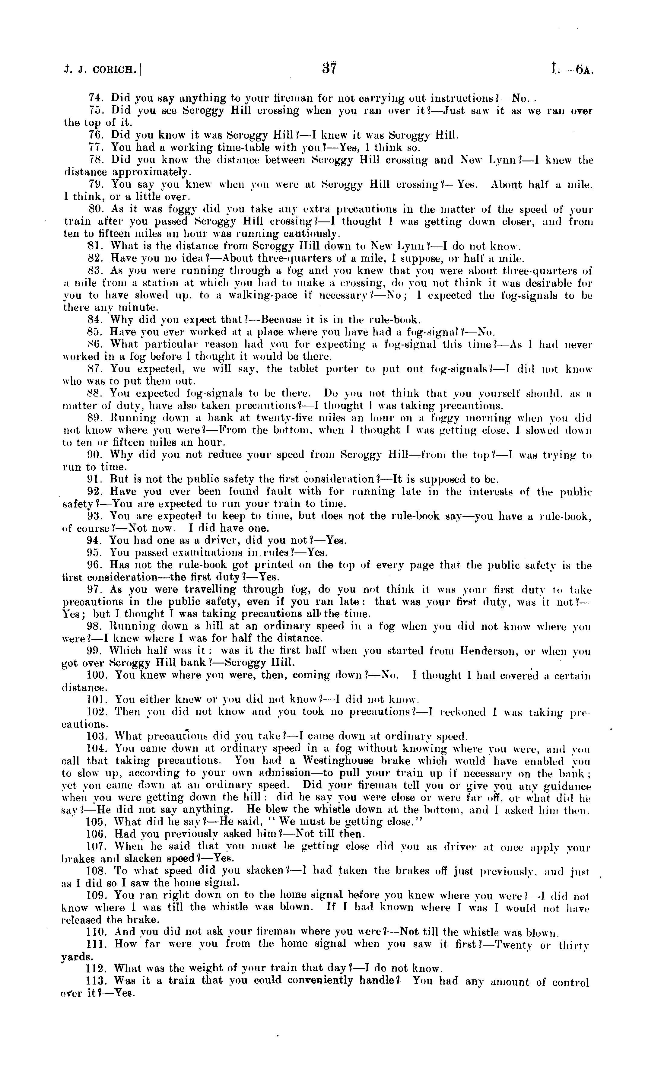 74. Did you say anything to your fireman for not carrying out instructions? —No. . 75. Did you see Scroggy Hill crossing when you ran over it!— Just saw it as we ran over the top of it. 76. Did you know it was Scroggy Hill?— 1 knew it was Scroggy Hill. 77. You had a working time-table with you ? —Yos, I think so. 78. Did you know tho distance between Scroggy Hill crossing and New Lynn?—l knew the distance approximately. 70. You say you knew when you wore at Scroggy Hill crossing? Yes. About half a mile. 1 think, or a little over. 80. As it was foggy did you take any extra precautions in the matter of the speed of your train after you passed Scroggy Hill crossing?—l thought I was getting down closer, and from ten to fifteen miles an hour was running cautiously. 81. What is the distance from Scroggy Hill down to New Lynn? —I do not know. 82. Have you no idea? —About throe-quarters of a mile, 1 suppose, or half a mile. 83. As you were running through a fog and you knew that you were about three-quarters of a mile from a station at which you had to make a crossing, do you not think it was desirable for you to have slowed up, to a walking-pace if necessary ?—-No; I expected the fog-signals to be there any minute. 84. Why did you expect that? —Because it is in the rule-book. 85. Have you ever worked at a place whore you have had a fog-signal ?—No. 86. What particular reason had you for expecting a fog-signal this time? —As I had never worked in a fog before 1 thought it would be there. 87. You expected-, we will say. the tablet porter te put out fog-signals?—l did not know who was to put them out. 88. You expected fog-signals to be there. Do you not think that you yourself should, as a matter of duty, have also taken precautions?—l thought I was taking precautions. 89. Running down a bank at twenty-five miles an hour on a foggy morning when you did not know whore you were? —From the bottom, when I thought I was getting close. I slowed down to ten or fifteen miles an hour. 00. Why did you not reduce your speed from Scroggy Hill—from the top?—] was trying to run to time. 111. But is not the public safety the first consideration? —It is supposed to be. 02. Have you ever been found fault with for running late in the interests of the public safety?— You are expected to run your train to time. 93. You are expected to keep to time, but does not the rule-book say —you have a rule-book, of course? —Not now. I did have one. 94. You had one as a driver, did you not?— Yes. 95. You passed examinations in rules?— Yes. 96. Has not the rule-book got printed on the top of every page that the public safety is the first consideration —the first duty? —Yes. 97. As you were travelling through fog. do you not think it was your first duty to take precautions in the public safety, even if you ran late: that was your first duty, was it not?— Yos ; but I thought I was taking precautions all the time. 98. Running down a hill at an ordinary speed in a fog when you did not know where you were?- I knew whero I was for half the distance. 00. Which half was it : was it the first half when you started from Henderson, or when you got over Scroggy Hill bank?—Scroggy Hill. 100. You knew whore you wore, then, coming down? —No. I thought I had covered a certain distance. 101. You either knew or you did not know ? —I did not know, 102. Then you did not know and you took no precautions?—l reckoned 1 was taking pre cautions. 103. What precautions did you take? —I came down at ordinary speed. 104. You came down at ordinary speed in a fog without knowing where you were, and you call that taking precautions. You hail a Westingliouse brake which would have enabled you to slow iij), according to your own admission —to pull your train up if necessary mi the bank; yet you came down at an ordinary speed. Did your fireman tell you or give you any guidance when you were getting down tho hill: did he say you were close or were far off. or what did he sa\ ?—Ho did not say anything. He blew the whistle down at tlie bottom, and I asked him then 105. What did he say?—He said. " We must be getting close." I0(i. Had you previously asked him? —Not till then. 1(17. When he said that you must bo getting close did you as driver at once apply your brakes and slacken speed? —Yes. 108. To what speed did you slacken? —I had taken the brakes off just previously, and just as I did so I saw the home signal. 10!). You ran right down on to the home signal before you knew where you wore 1 ? I did not know whore 1 was till the whistle was blown. If I had known whero I was I would not have nli used the brake. 110. And you did not ask your fireman where you were?— Not till tlie whistle was blown. 111. How far wore you from the home signal when you saw it first? —Twenty or thirty yards. 112. What was the weight of your train that day?—l do not know. 113. Was it a train that you could conveniently handle? You had any amount of control over it?—Ye6.