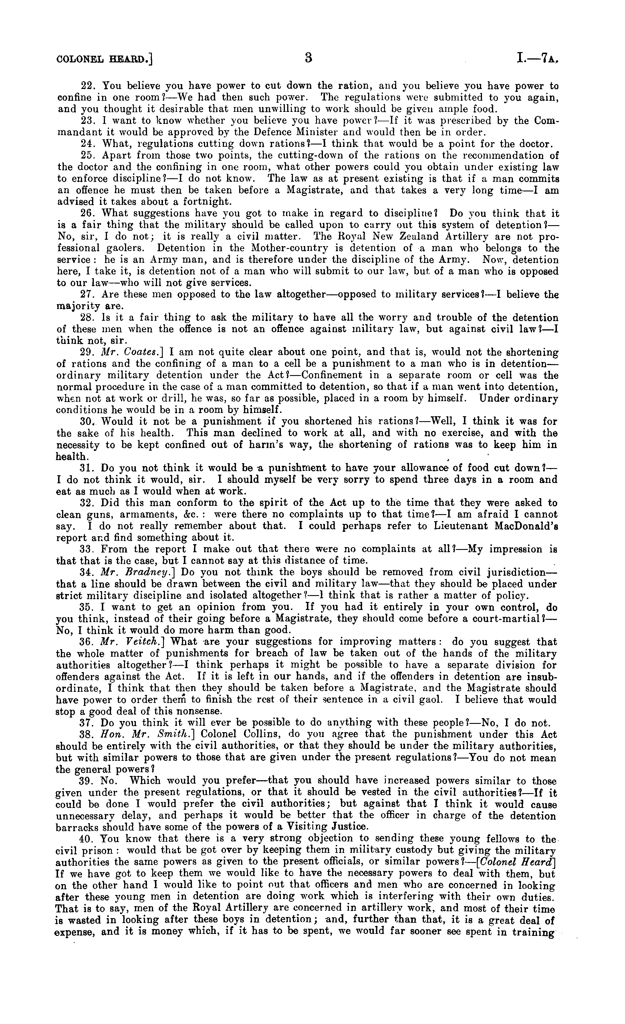 22. You believe you have power to cut down the ration, and you believe you have power to confine in one room? —We had then such power. The regulations were submitted to you again, and you thought it desirable that men unwilling to work should be given ample food. 23. 1 want to know whether you believe you have power?—lf it was prescribed by the Commandant it would be approved by the Defence Minister and would then be in order. 24. What, regulations cutting down rations? —I think that would be a point for the doctor. 25. Apart from those two points, the cutting-down of the rations on the recommendation of the doctor and the confining in one room, what other powers could you obtain under existing law to enforce discipline?—l do not know. The law as at present existing is that if a man commits an offence he must then be taken before a Magistrate, and that takes a very long time —I am advised it takes about a fortnight. 26. What suggestions have you got to make in regard to discipline? Do you think that it is a fair thing that the military should be called upon to carry out this system of detention? — No, sir, I do not; it is really a civil matter. The Royal New Zealand Artillery are not professional gaolers. Detention in the Mother-country is detention of a man who belongs to the service : he is an Army man, and is therefore under the discipline of the Army. Now, detention here, I take it, is detention not of a man who will submit to our law, but of a man who is opposed to our law —who will not give services. 27. Are these men opposed to the law altogether—opposed to military services? —I believe the majority are. 28. Is it a fair thing to ask the military to have all the worry and trouble of the detention of these men when the offence is not an offence against military law, but against civil law? —I think not, sir. 29. Mr. Coates.] I am not quite clear about one point, and that is, would not the shortening of rations and the confining of a man to a cell be a punishment to a man who is in detention — ordinary military detention under the Act? —Confinement in a separate room or cell was the normal procedure in the case of a man committed to detention, so that if a man went into detention, when not at work or drill, he was, so far as possible, placed in a room by himself. Under ordinary conditions he would be in a room by himself. 30. Would it not be a punishment if you shortened his rations? —Well, I think it was for the sake of his health. This man declined to work at all, and with no exercise, and with the necessity to be kept confined out of harm's way, the shortening of rations was to keep him in health. 31. Do you not think it would be a punishment to have your allowance of food cut down? — Ido not think it would, sir. I should myself be very sorry to spend three days in a room and eat as much as I would when at work. 32. Did this man conform to the spirit of the Act up to the time that they were asked to clean guns, armaments, &c. : were there no complaints up to that time? —I am afraid I cannot say. I do not really remember about that. I could perhaps refer to Lieutenant Mac Donald's report and find something about it. 33. From the report I make out that there were no complaints at all?—My impression is that that is the case, but I cannot say at this distance of time. 34. Mr. Bradney.] Do you not think the boys should be removed from civil jurisdiction— that a line should be drawn between the civil and military law—that they should be placed under strict military discipline and isolated altogether? —1 think that is rather a matter of policy. 35. I want to get an opinion from you. If you had it entirely in your own control, do you think, instead of their going before a Magistrate, they should come before a court-martial?— No, I think it would do more harm than good. 36. Mr. Veitch.] What are your suggestions for improving matters : do you suggest that the whole matter of punishments for breach of law be taken out of the hands of the military authorities altogether ?—I think perhaps it might be possible to have a separate division for offenders against the Act. If it is left in our hands, and if the offenders in detention are insubordinate, I think that then they should be taken before a Magistrate, and the Magistrate should have power to order them to finish the rest of their sentence in a civil gaol. I believe that would stop a good deal of this nonsense. 37. Do you think it will ever be possible to do anything with these people?—No, I do not. 38. Hon. Mr. Smith.] Colonel Collins, do you agree that the punishment under this Act should be entirely with the civil authorities, or that they should be under the military authorities, but with similar powers to those that are given under the present regulations?— You do not mean the general powers? 39. No. Which would you prefer—that you should have increased powers similar to those given under the present regulations, or that it should be vested in the civil authorities?—lf it could be done I would prefer the civil authorities; but against that I think it would cause unnecessary delay, and perhaps it would be better that the officer in charge of the detention barracks should have some of the powers of a Visiting Justice. 40. You know that there is a very strong objection to sending these young fellows to the civil prison : would that be got over by keeping them in military custody but giving the military authorities the same powers as given to the present officials, or similar powers?— [Colonel Heard] If we have got to keep them we would like to have the necessary powers to deal with them, but on the other hand I would like to point out that officers and men who are concerned in looking after these young men in detention are doing work which is interfering with their own duties. That is to say, men of the Royal Artillery are concerned in artillery work, and most of their time is wasted in 