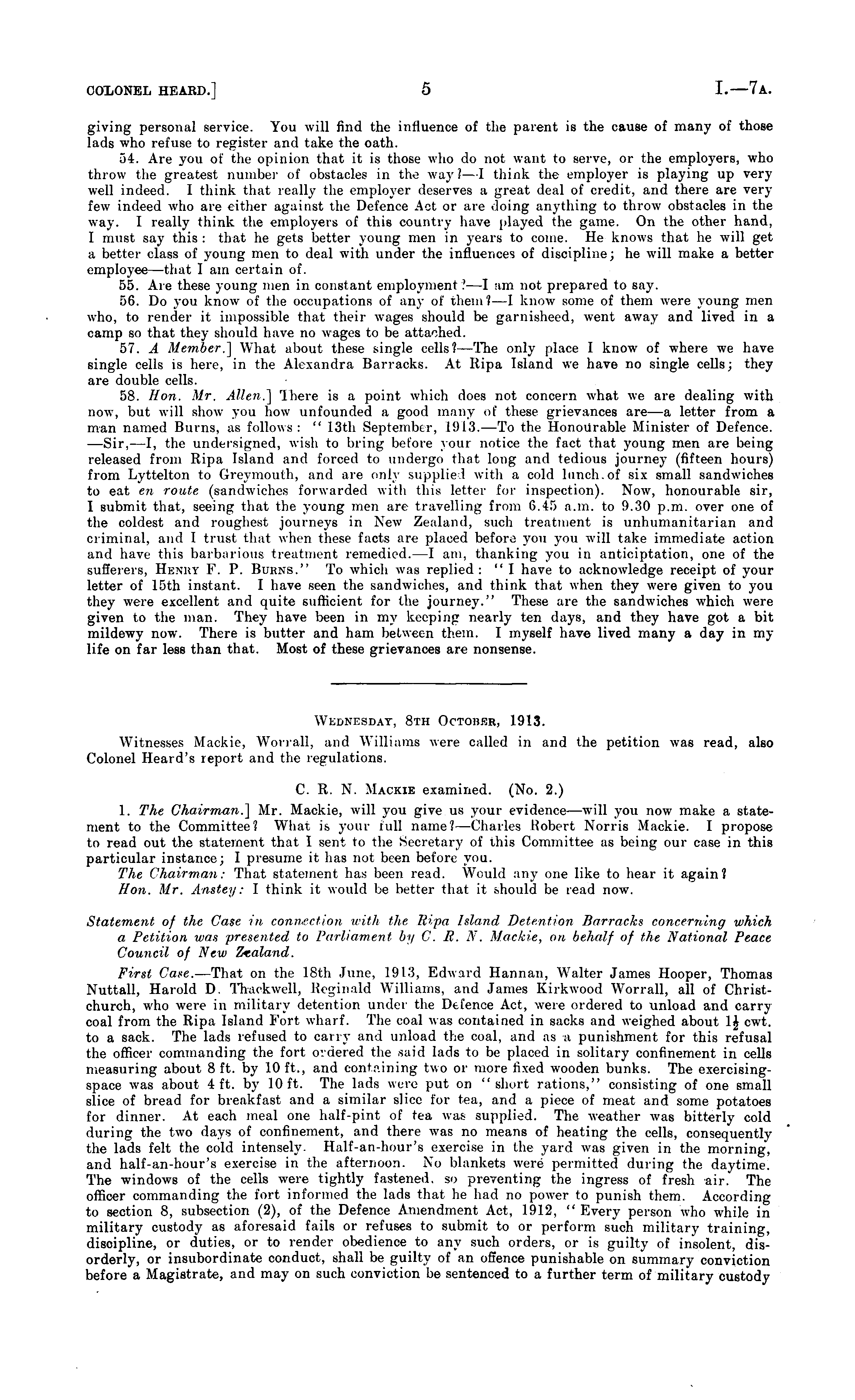 Wednesday, Bth October, 1913. Witnesses Mackie, Worrall, and Williams were called in and the petition was read, also Colonel Heard's report and the regulations. C. R. N. Mackie examined. (No. 2.) 1. The Chairman.] Mr. Mackie, will you give us your evidence—will you now make a statement to the Committee? What is, your lull name? —Charles Robert Norris Mackie. I propose to read out the statement that I sent to the Secretary of this Committee as being our case in this particular instance; I presume it lias not been before you. The Chairman: That statement has been read. Would any one like to hear it again? Hon. Mr. Anstey: I think it would be better that it should be read now. Statement of the Case in connection with the Ripa Island Detention B/trrar.ks concerning which a Petition was presented to Parliament by C. E. N. Mackie, on behalf of the National Peace Council of New Zealand. First Case. —That on the 18th June. 1913, Edward Haiinan, Walter James Hooper, Thomas Nuttall, Harold D. Thackwell, Reginald Williams, and Junius Kirkwood Worrall, all of Christchurch, who were in military detention under the Dtfence Act, were ordered to unload and carry coal from the Ripa Island Fort wharf. The coal was contained in sacks and weighed about cwt. to a sack. The lads refused to carry and unload the coal, and as a punishment for this refusal the officer commanding the fort ovdered the said lads to be placed in solitary confinement in cells measuring about 8 ft. by 10 ft., and containing two or more fixed wooden bunks. The exercisingspace was about 4ft. by 10ft. The lads were put on "short rations," consisting of one small slice of bread for breakfast and a similar slice for tea, and a piece of meat and some potatoes for dinner. At each meal one half-pint of tea was supplied. The weather was bitterly cold during the two days of confinement, and there was no means of heating the cells, consequently the lads felt the cold intensely. Half-an-liour's exercise in the yard was given in the morning, and half-an-hour's exercise in the afternoon. No blankets were permitted during the daytime. The windows of the cells were tightly fastened, so preventing the ingress of fresh air. The officer commanding the fort informed the lads that he had no power to punish them. According to section 8, subsection (2), of the Defence Amendment Act, 1912, " Every person who while in military custody as aforesaid fails or refuses to submit to or perform such military training, discipline, or duties, or to render obedience to any such orders, or is guilty of insolent, disorderly, or insubordinate conduct, shall be guilty of an offence punishable on summary conviction before a Magistrate, and may on such conviction be sentenced to a further term of military custody
