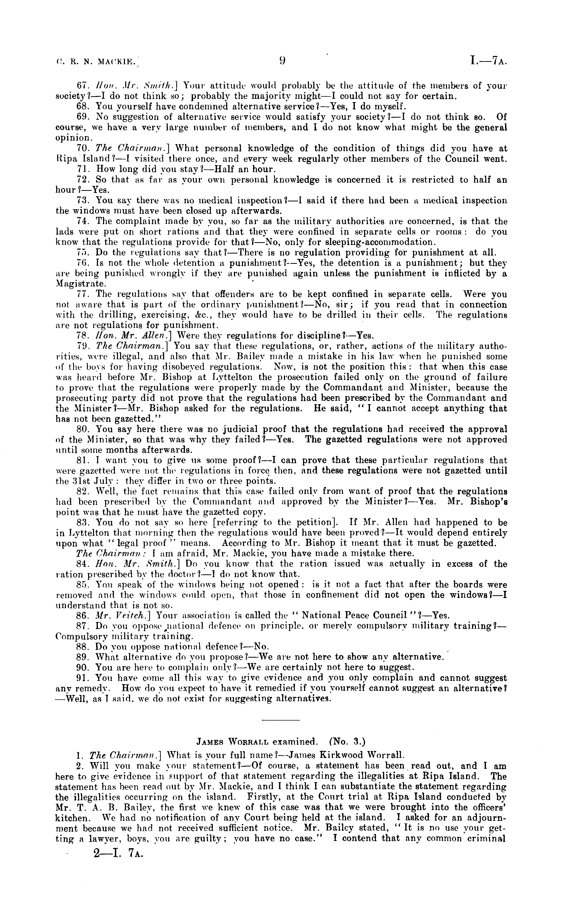 07. lion. Mr. Smith.] Your attitude would probably be the attitude of the members of your society? —I do not think so; probably the majority might —I could not say for certain. 68. You yourself have condemned alternative service? —Yes, I do myself. 69. No suggestion of alternative service would satisfy your society? —I do not think so. Of course, we have a very large number of members, and I do not know what might be the general opinion. 70. The Chairman.] What personal knowledge of the condition of things did you have at Ripa Island?—l visited there once, and every week regularly other members of the Council went. 71. How long did you stay?— Half an hour. 72. So that as far as your own personal knowledge is concerned it is restricted to half an hour ?—Yes. 73. You say there was no medical inspection I—l1 — I said if there had been a medical inspection the windows must have been closed up afterwards. 74. The complaint made by you, so far as the military authorities are concerned, is that the lads were put on short rations and that they were confined in separate cells or rooms : do you know that the regulations provide for that? —No, only for sleeping-accommodation. 75. Do the regulations say that] —There is no regulation providing for punishment at all. 7(>. Is not the whole detention a punishment?— Yes, the detention is a punishment; but they are being punished wrongly if they are punished again unless the punishment is inflicted by a Magistrate. 77. The regulations say that offenders are to be kept confined in separate cells. Were you not aware that is part of the ordinary punishment?—No, sir; if you read that in connection with the drilling, exercising, &c, they would have to be drilled in their cells. The regulations are not regulations for punishment. 78. Hon. Mr. Allen.] Were they regulations for discipline?— Yes. 7!). The Chairman.] You say that these regulations, or, rather, actions of the military authorities, were illegal, and also that Mr. Bailey made a mistake in his law when he punished some of (lie boys for having disobeyed regulations. Now, is not the position this: that when this case was heard before Mr. Bishop at Lyttelton the prosecution failed only on the ground of failure to prove that the regulations were properly made by the Commandant and Minister, because the prosecuting party did not prove that the regulations had been prescribed by the Commandant and the Minister I—Mr.1 —Mr. Bishop asked for the regulations. He said, "I cannot accept anything that has not been gazetted." 80. You say here there was no judicial proof that the regulations had received the approval of the Minister, so that was why they failed? —Yes. The gazetted regulations were not approved until some months afterwards. 81. I want you to give us some proof?—l can prove that these particular regulations that were gazetted were not the regulations in force then, and these regulations were not gazetted until the -ilst July : they differ in two or three points. 82. Well, the fact remains that this case failed only from want of proof that the regulations had been prescribed by the Commandant and approved by the Minister? —Yes. Mr. Bishop's point was that he must have the gazetted oopy. 83. You do not say so here [referring to the petition]. If Mr. Allen had happened to be in Lyttelton that morning then the regulations would have been proved?—lt would depend entirely upon what "legal proof " means. According to Mr. Bishop it meant that it must be gazetted. The Chairman : I am afraid, Mr. Mackie, you have made a mistake there. 84. Hon. Mr. Smith.] Do you know that the ration issued was actually in excess of the ration prescribed by the doctor | —1 do not know that. 85. You speak of the windows being not opened : is it not a fact that after the boards were removed and the windows could open, that those in confinement did not open the windows? —I understand that is not so. 86. Mr. Veitch.] Your association is called the " National Peace Council "? —-Yes. 87. Do you oppose defence on principle, or merely compulsory military training?— Compulsory military training. 88. Do you oppose national defence? —No. 89. What alternative do you propose! —We are not here to show any alternative. 90. You are here to complain only?—We are certainly not here to suggest. 91. You have oome all this way to give evidence and you only complain and cannot suggest any remedy. How do you expect to have it remedied if you yourself cannot suggest an alternative? —Well, as I said, we do not exist for suggesting alternatives.