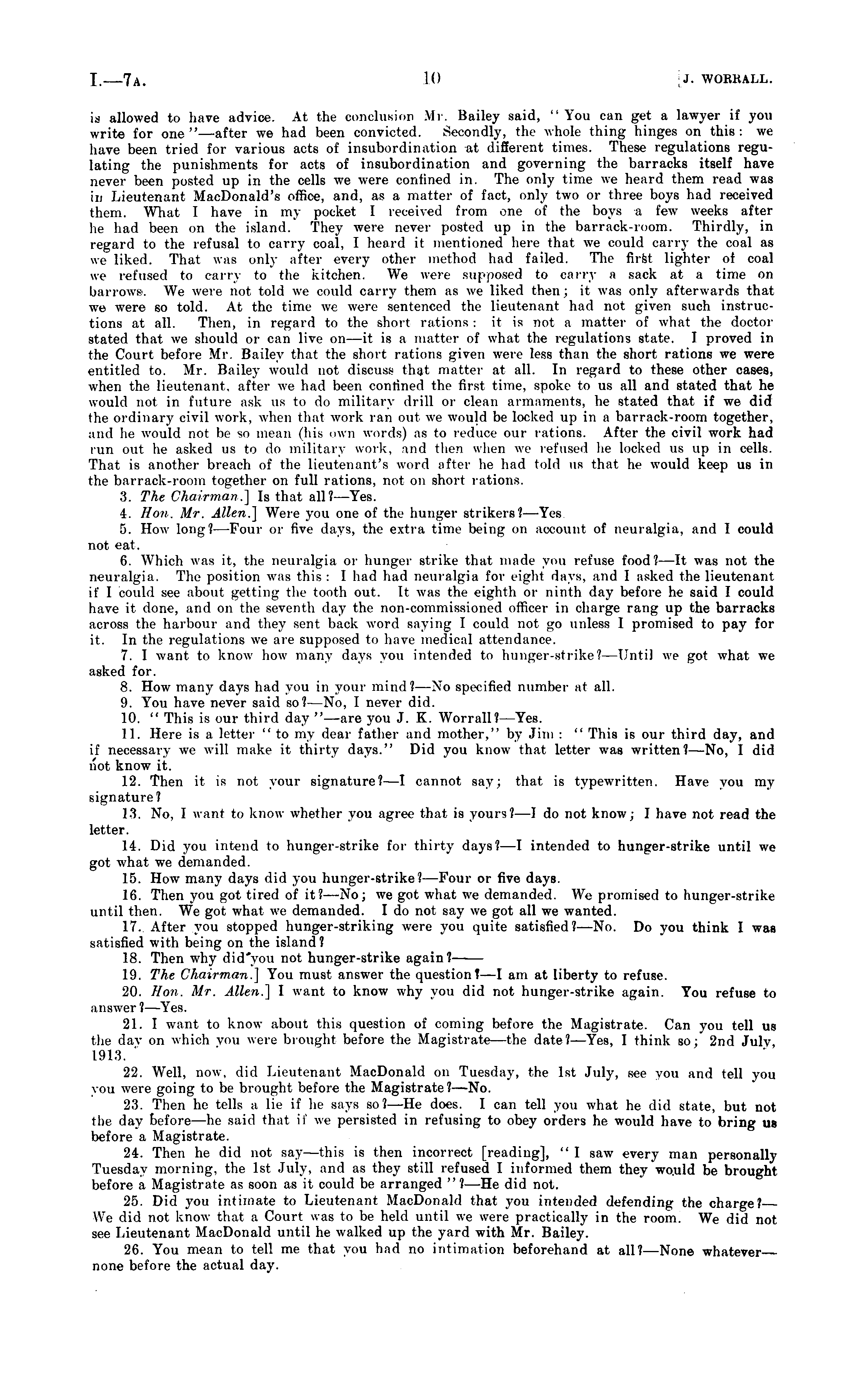 is allowed to have advice. At the conclusion Mr. Bailey said, "You can get a lawyer if you write for one " —after we had been convicted. Secondly, the whole thing hinges on this : we have been tried for various acts of insubordination at different times. These regulations regulating the punishments for acts of insubordination and governing the barracks itself have never been posted up in the cells we were confined in. The only time we heard them read was in Lieutenant Mac Donald's office, and, as a matter of fact, only two or three boys had received them. What I have in my pocket I received from one of the boys a few weeks after he had been on the island. They were never posted up in the barrack-room. Thirdly, in regard to the refusal to carry coal, I heard it mentioned here that we could carry the coal as we liked. That was only after every other method had failed. The first lighter of coal we refused to carry to the kitchen. We were supposed to carry a sack at a time on barrows. We were not, told we could cany them as we liked then ;it was only afterwards that we were so told. At the time we were sentenced the lieutenant had not given such instructions at all. Then, in regard to the short rations: it is not a matter of what the doctor stated that we should or can live on —it is a matter of what the regulations state. I proved in the Court before Mr. Bailey that the short rations given were less than the short rations we were entitled to. Mr. Bailej - would not discuss that matter at all. In regard to these other cases, when the lieutenant, after we had been confined the first time, spoke to us all and stated that he would not in future ask us to do military drill or clean armaments, he stated that if we did the ordinary civil work, when that work ran out we would be locked up in a barrack-room together, and lie would not be so mean (his own words) as to reduce our rations. After the civil work had run out he asked us to do military work, and then when we refused lie locked us up in cells. That is another breach of the lieutenant's word after lie had told us that he would keep us in the barrack-room together on full rations, not on short rations. 3. The Chairman.} Is that all? —Yes. 4. Hon. Mr. Allen.] Were you one of the hunger strikers?— Yes 5. How long? —Four or five days, the extra time being on account of neuralgia, and I could not eat. 6. Which was it, the neuralgia or hunger strike that made you refuse food? —It was not the neuralgia. The position was this: I had had neuralgia for eight days, and I asked the lieutenant if I could see about getting the tooth out. It was the eighth or ninth day before he said I could have it done, and on the seventh day the non-commissioned officer in charge rang up the barracks across the harbour and they sent back word saying I could not go unless I promised to pay for it. In the regulations we are supposed to have medical attendance. 7. I want to know how many days you intended to hunger-strike?— Until we got what we asked for. 8. How many days had you in your mind?—No specified number at all. 9. You have never said so? —No, I never did. 10. " This is our third day "—are you J. K. Worrall?—Yes. 11. Here is a letter " to my dear father and mother," by Jim : " This is our third day, and if necessary we will make it thirty days." Did you know that letter was written? —No, I did not know it. 12. Then it is not your signature?—l cannot say; that is typewritten. Have you my signature? IS. No, I want to know whether you agree that is yours?—l do not know; I have not read the letter. 14. Did you intend to hunger-strike for thirty days? —I intended to hunger-strike until we got what we demanded. 15. How many days did you hunger-strike?— Four or five days. 16. Then you got tired of it? —No; we got what we demanded. We promised to hunger-strike until then. We got what we demanded. Ido not say we got all we wanted. 17. After you stopped hunger-striking were you quite satisfied? —No. Do you think I was satisfied with being on the island? 18. Then why did'you not hunger-strike again? 19. The Chairman.] You must answer the question?—l am at liberty to refuse. 20. Hon. Mr. Allen.~\ I want to know why you did not hunger-strike again. You refuse to answer? —Yes. 21. I want to know about this question of coming before the Magistrate. Can you tell us the day on which you were brought before the Magistrate—the date?— Yes, I think so; 2nd July 1913. ' 22. Well, now, did Lieutenant Mac Donald on Tuesday, the Ist July, see you and tell you you were going to be brought before the Magistrate?— No. 23. Then he tells a lie if lie says so?—He does. I can tell you what he did state, but not the day before —he said that if we persisted in refusing to obey orders he would have to bring us before a Magistrate. 24. Then he did not say—this is then incorrect [reading], " I saw every man personally Tuesday morning, the Ist July, and as they still refused I informed them they wo.uld be brought before a Magistrate as soon as it could be arranged "?—He did not. 25. Did you intimate to Lieutenant Mac Donald that you intended defending the charge? We did not know that a Court was to be held until we were practically in the room. We did not see Lieutenant Mac Donald until he walked up the yard with Mr. Bailey. 26. You mean to tell me that you had no intimation beforehand at all?— None whatever none before the actual day.