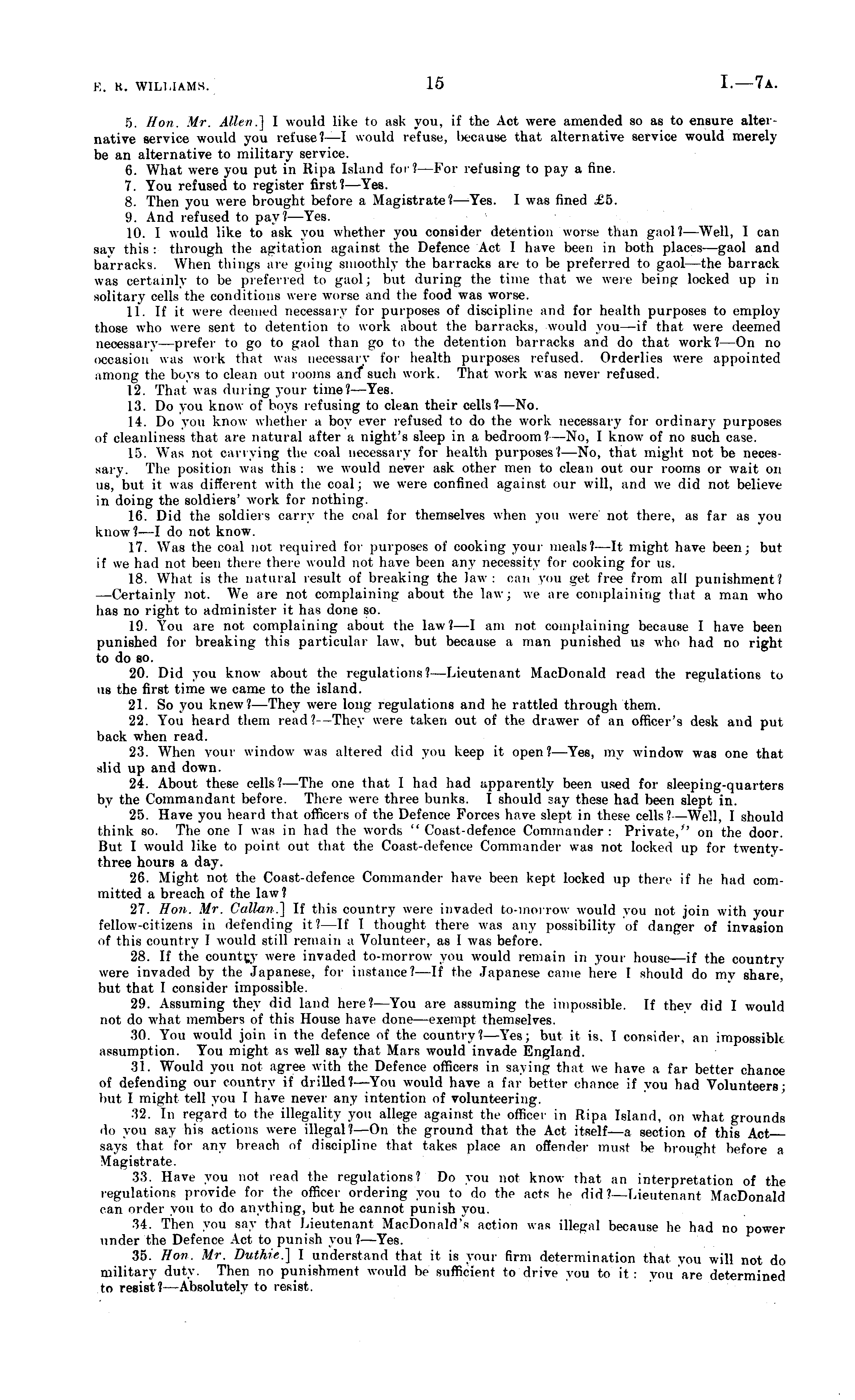 5. Hon. Mr. Allrn.\ I would like to ask you, if the Act were amended so as to ensure alternative service would you refuse?—l would refuse, because that alternative service would merely be an alternative to military service. 6. What were you put in Kipa Island for? —For refusing to pay a fine. 7. You refused to register first? —Yes. 8. Then you were brought before a Magistrate?— Yes. I was fined £5. 9. And refused to pay? —Yes. 10. I would like to ask you whether you consider detention worst- than gaol?— Well, I can gay tliis : through the agitation against the Defence Act I have been in both places—-gaol and barracks. When things are going smoothly the barracks are to be preferred to gaol—the barrack was certainly to be preferred to gaol; but during the time that we were being locked up in solitary cells the conditions were worse and the food was worse. 11. If it were deemed necessary for purposes of discipline and for health purposes to employ those who were sent to detention to work about the barracks, would you —if that were deemed necessary —prefer to go to gaol than go to the detention barracks and do that work? —On no occasion was work that was necessary for health purposes refused. Orderlies were appointed among the boys to clean out rooms ana such work. That work was never refused. 12. That was dining your time? —Yes. 13. Do you know of boys refusing to clean their cells? —No. 14. Do you know whether a boy ever refused to do the work necessary for ordinary purposes of cleanliness that are natural after a night's sleep in a bedroom? —No, I know of no such case. 16. Was not carrying the coal necessary for health purposes?—No, that might not be necessary. The position was this :we would never ask other men to clean out our rooms or wait on us, but it was different with the coal; we were confineil against our will, and we did not believe in doing the soldiers' work for nothing. 16. Did the soldiers carry the coal for themselves when you were not there, as far as you know? —I do not know. 17. Was the coal not required for purposes of cooking your meals?—lt might have been; but if we had not been there there would not have been any necessity for cooking for us. 18. What is the natural result of breaking the law: can you get free from all punishment? —Certainly not. We are not complaining about the law; we are complaining that a man who has no right to administer it has done so. 19. Yon are not complaining about the law?—l am not complaining because I have been punished for breaking this particular law, but because a man punished us who had no right to do so. 20. Did you know about the regulations?— Lieutenant Mac Donald read the regulations to us the first time we came to the island. 21. So you knew? —They were long regulations and he rattled through them. 22. You heard them read?— They were taken out of the drawer of an officer's desk and put back when read. 23. When your window was altered did you keep it open?— Yes, my window was one that slid up and down. 24. About these cells?— The one that I had had apparently been used for sleeping-quarters by the Commandant before. There were three bunks. I should say these had been slept in. 25. Have you heard that officers of the Defence Forces have slept in these cells? —Well, I should think so. The one I was in had the words " Coast-defence Cormnander : Private," on the door. But I would like to point out that the Coast-defence Commander was not locked up for twentythree hours a day. 26. Might not the Coast-defence Commander have been kept locked up there if he had committed a breach of the law ? 27. Hon. Mr. Calkin.] If this country were invaded to-morrow would you not join with your fellow-citizens in defending it?—lf I thought there was any possibility of danger of invasion of this country I would still remain a Volunteer, as I was before. 28. If the country were invaded to-morrow you would remain in your house—if the country were invaded by the Japanese, for instance? —If the Japanese came here I should do my share, but that I consider impossible. 29. Assuming they did land here?— You are assuming the impossible. If they did I would not do what members of this House have done —exempt themselves. 30. You would join in the defence of the country? —Yes; but it is. I consider, an impossiblf assumption. You might as well say that Mars would invade England. 31. Would you not agree with the Defence officers in saying that we have a far better chance of defending our country if drilled? —You would have a far better chance if you had Volunteers; but I might tell you I have never any intention of volunteering. 32. In regard to the illegality you allege against the officer in Ripa Island, on what grounds do you say his actions were illegal?—On the ground that the Act itself— a section of this Act says that for any breach of discipline that takes place an offender must be brought before a Magistrate. 33. Have you not read the regulations? Do you not know that an interpretation of the regulations provide for the officer ordering you to do the acts he did?— Lieutenant Mac Donald can order you to do anything, but he cannot punish you. 34. Then you say that Lieutenant Mao Donald's action was illegal because he had no power under the Defence Act to punish you?— Yes. 35. Hon. Mr. Duthie.] I understand that it is your firm determination that you will not do military duty. Then no punishment would be sufficient to drive you to it : you are determined to resist? —Absolutely to resist.