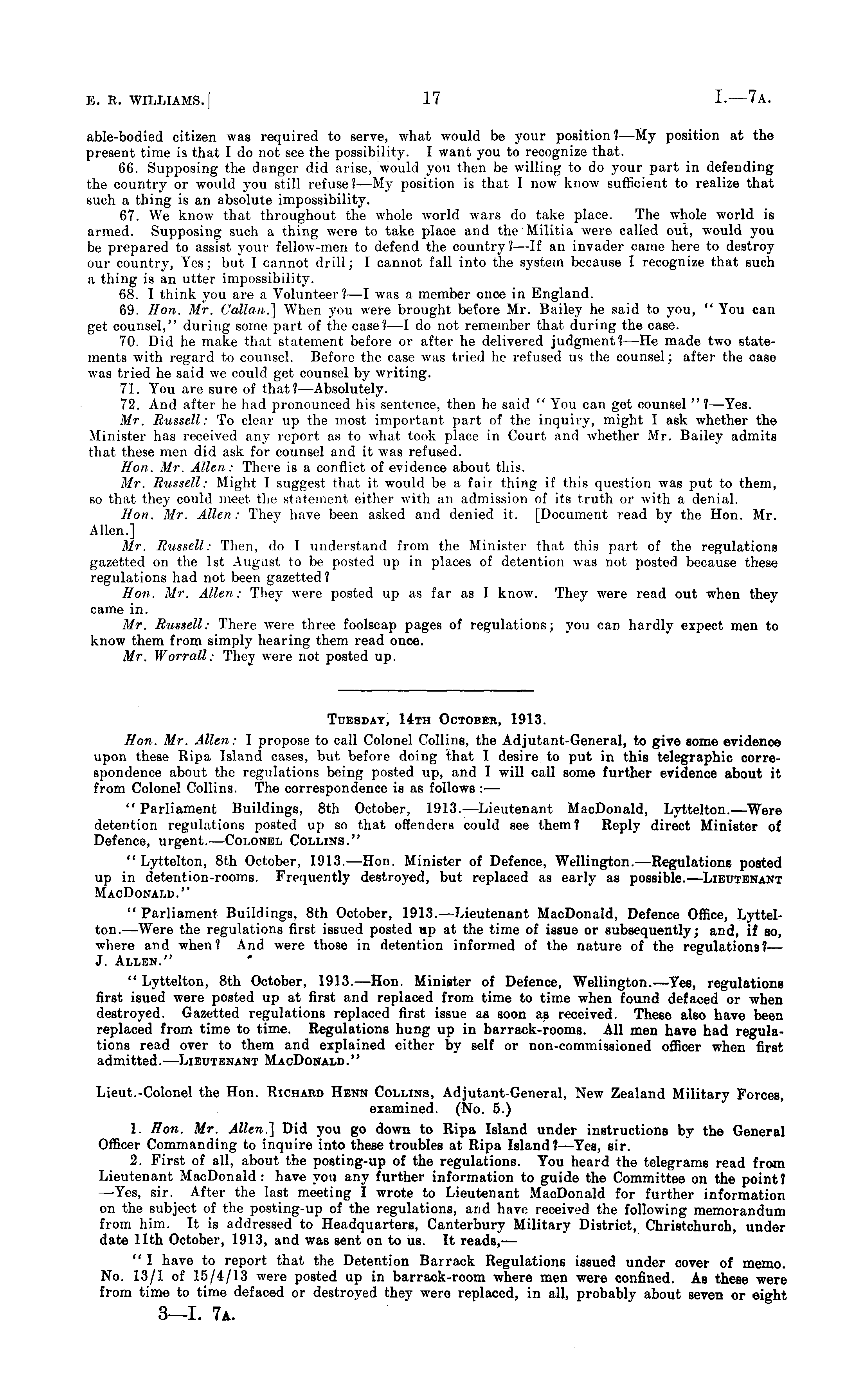 Tuesday, 14th October, 1913. Hon. Mr. Allen: I propose to call Colonel Collins, the Adjutant-General, to give some evidence upon these Ripa Island cases, but before doing that I desire to put in this telegraphic correspondence about the regulations being posted up, and I will call some further evidence about it from Colonel Collins. The correspondence is as follows : — " Parliament Buildings, Bth October, 1913. —Lieutenant Mac Donald, Lyttelton.—Were detention regulations posted up so that offenders could see them? Reply direct Minister of Defence, urgent. —Colonel Collins." " Lyttelton, Bth October, 1913. —Hon. Minister of Defence, Wellington.—Regulations posted up in detention-rooms. Frequently destroyed, but replaced as early as possible.—Lieutenant Mac Donald." " Parliament Buildings, Bth October, 1913.—Lieutenant Mac Donald, Defence Office, Lyttelton.—Were the regulations first issued posted up at the time of issue or subsequently; and, if so, where and when? And were those in detention informed of the nature of the regulations?— J. Allen." " Lyttelton, Bth October, 1913.—H0n. Minister of Defence, Wellington.—Yes, regulations first isued were posted up at first and replaced from time to time when found defaced or when destroyed. Gazetted regulations replaced first issue as soon as received. These also have been replaced from time to time. Regulations hung up in barrack-rooms. All men have had regulations read over to them and explained either by self or non-commissioned officer when first admitted. —Lieutenant Mac Donald .'' Lieut.-Colonel the Hon. Richard Henn Collins, Adjutant-General, New Zealand Military Forces, examined. (No. 5.) 1. Hon. Mr. Allen.'] Did you go down to Ripa Island under instructions by the General Officer Commanding to inquire into these troubles at Ripa Island?— Yes, sir. 2. First of all, about the posting-up of the regulations. You heard the telegrams read from Lieutenant Mac Donald : have you any further information to guide the Committee on the point? —Yes, sir. After the last meeting I wrote to Lieutenant Mac Donald for further information on the subject of the posting-up of the regulations, and have received the following memorandum from him. It is addressed to Headquarters, Canterbury Military District, Christchurch, under date 11th October, 1913, and was sent on to us. It reads,' — " I have to report that the Detention Barrack Regulations issued under cover of memo. No. 13/1 of 15/4/13 were posted up in barrack-room where men were confined. As these were from time to time defaced or destroyed they were replaced, in all, probably about seven or eight