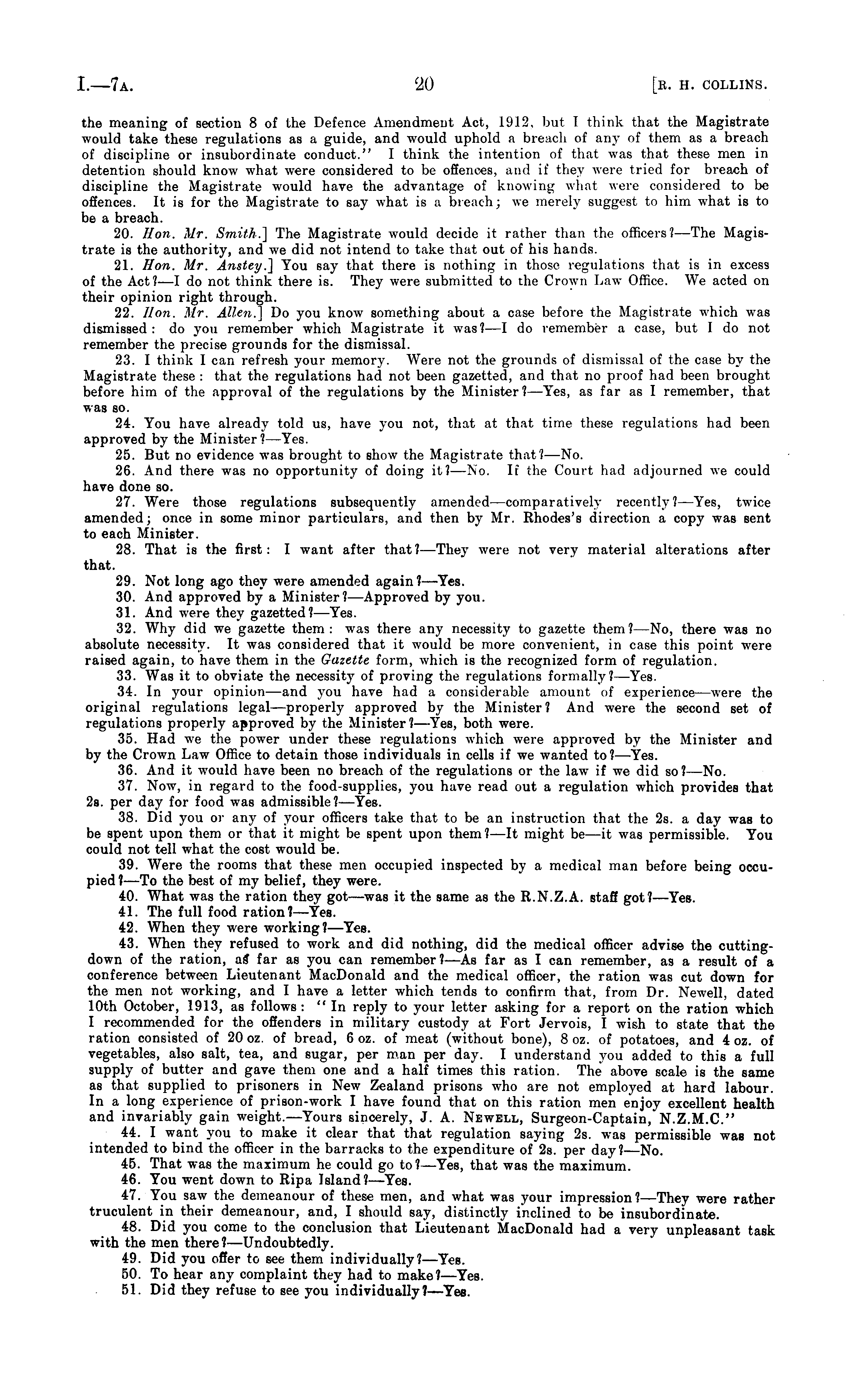 the meaning of section 8 of the Defence Amendment Act, 1912, but I think that the Magistrate would take these regulations as a guide, and would uphold a breach of any of them as a breach of discipline or insubordinate conduct." I think the intention of that was that these men in detention should know what were considered to be offences, and if they were tried for breach of discipline the Magistrate would have the advantage of knowing what were considered to be offences. It is for the Magistrate to say what is a breach; we merely suggest to him what is to be a breach. 20. Hon. Mr. Smith.] The Magistrate would decide it rather than the officers? —The Magistrate is the authority, and we did not intend to take that out of his hands. 21. Hon. Mr. Anstey.] You say that there is nothing in those regulations that is in excess of the Act?—l do not think there is. They were submitted to the Crown Law Office. We acted on their opinion right through. 22. Hon. Mr. Allen?\ Do you know something about a case before the Magistrate which was dismissed : do you remember which Magistrate it was?—l do remember a case, but I do not remember the precise grounds for the dismissal. 23. I think I can refresh your memory. Were not the grounds of dismissal of the case by the Magistrate these : that the regulations had not been gazetted, and that no proof had been brought before him of the approval of the regulations by the Minister ? —Yes, as far as I remember, that was so. 24. You have already told us, have you not, that at that time these regulations had been approved by the Minister? —Yes. 25. But no evidence was brought to show the Magistrate that?— No. 26. And there was no opportunity of doing it?— No. If the Court had adjourned we could have done so. 27. Were those regulations subsequently amended—comparatively recently?— Yes, twice amended; once in some minor particulars, and then by Mr. Rhodes's direction a copy was sent to each Minister. 28. That is the first: I want after that? —They were not very material alterations after that. 29. Not long ago they were amended again? —Yes. 30. And approved by a Minister? —Approved by you. 31. And were they gazetted? —Yes. 32. Why did we gazette them: was there any necessity to gazette them?—No, there was no absolute necessity. It was considered that it would be more convenient, in case this point were raised again, to have them in the Gazette form, which is the recognized form of regulation. 33. Was it to obviate the necessity of proving the regulations formally?— Yes. 34. In your opinion—and you have had a considerable amount of experience—were the original regulations legal—properly approved by the Minister? And were the second set of regulations properly approved by the Minister ?—Yes, both were. 35. Had we the power under these regulations which were approved by the Minister and by the Crown Law Office to detain those individuals in cells if we wanted to? —Yes. 36. And it would have been no breach of the regulations or the law if we did so? —No. 37. Now, in regard to the food-supplies, you have read out a regulation which provides that 2s. per day for food was admissible?— Yes. 38. Did you or any of your officers take that to be an instruction that the 2s. a day was to be spent upon them or that it might be spent upon them? —It might be —it was permissible. You could not tell what the cost would be. 39. Were the rooms that these men occupied inspected by a medical man before being occupied I—To1 —To the best of my belief, they were. 40. What was the ration they got—was it the same as the R.N.Z.A. staff got?— Yes. 41. The full food ration? —Yee. 42. When they were working? —Yes. 43. When they refused to work and did nothing, did the medical officer advise the cuttingdown of the ration, as* far as you can remember? —As far as I can remember, as a result of a conference between Lieutenant Mac Donald and the medical officer, the ration was cut down for the men not working, and I have a letter which tends to confirm that, from Dr. Newell, dated 10th October, 1913, as follows : "In reply to your letter asking for a report on the ration which I recommended for the offenders in military custody at Fort Jervois, I wish to state that the ration consisted of 20 oz. of bread, 6 oz. of meat (without bone), 8 oz. of potatoes, and 4 oz. of vegetables, also salt, tea, and sugar, per man per day. I understand you added to this a full supply of butter and gave them one and a half times this ration. The above scale is the same as that supplied to prisoners in New Zealand prisons who are not employed at hard labour. In a long experience of prison-work I have found that on this ration men enjoy excellent health and invariably gain weight. —Yours sincerely, J. A. Newell, Surgeon-Captain, N.Z.M.C." 44. I want you to make it clear that that regulation saying 2s. was permissible was not intended to bind the officer in the barracks to the expenditure of 2s. per day?— No. 45. That was the maximum he could go to?— Yes, that was the maximum. 46. You went down to Ripa Island?— Yes. 47. You saw the demeanour of these men, and what was your impression?— They were rather truculent in their demeanour, and, I should say, distinctly inclined to be insubordinate. 48. Did you come to the conclusion that Lieutenant Mac Donald had a very unpleasant task with the men there? —Undoubtedly. 49. Did you offer to see them individually?— Yes. 50. To hear any complaint they had to make?— Yes. 51. Did they refuse to see you individually?— Yes.