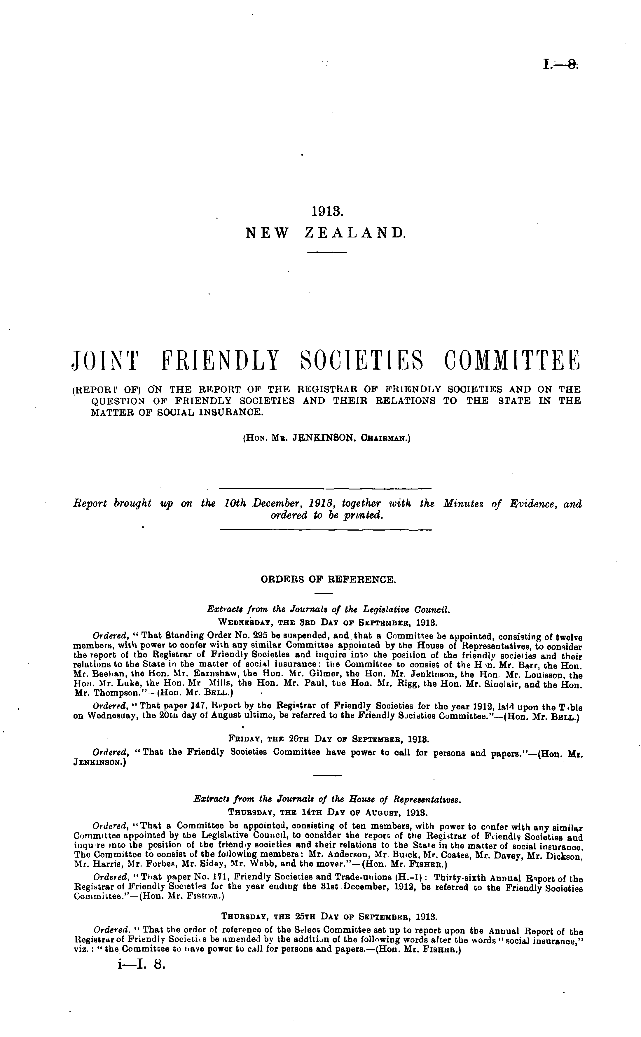 ORDERS OP REFERENCE. Extract! from the Journals of the Legislative Council. Wednesday, the 3rd Day op September, 1913. Ordered, " That Standing Order No. 295 be suspended, and that a Committee be appointed, consisting of twelve members, with power to confer wiih any similar Committee appointed by the House of Representatives, to oonsider the report of the Registrar of Friendly Societies and inquire into the position of the friendly societies and their relations to the State in the matter of social insurance: the Committee to consist of the H >n. Mr. Barr, the Hon. Mr. Beehan, the Hon. Mr. Earnshaw, the Hon. Mr. Gilmer, the Hon. Mr. Jenkinson, the Hon. Mr. Louiseon, the Hon. Mr. Luke, the Hon. Mr Mills, the Hon. Mr. Paul, tue Hon. Mr. Rigg, the Hon. Mr. Siuolair, and the Hon. Mr. Thompson."—(Hon. Mr. Bell.) Ordered, " That paper 147, Report by the Registrar of Friendly Societies for the year 1912, laid upon the Tible on Wednesday, the 20tli day of August ultimo, be referred to the Friendly Sjcieties Committee."—(Hon. Mr. 8e1t..) Friday, the 26th Day of September, 1913. Ordered, "That the Friendly Societies Committee have power to oall for persons and papers." (Hon. Mr. Jenkinson.) Extracts from the Journals of the House of Representatives. Thursday, the 14th Day op August, 1913. Ordered, "That a Committee be appointed, consisting of ten members, with power to confer with any similar Committee appointed by the Legislative Council, to consider the report of the Registrar of Friendly Sooieties and inqu re into the position of the friendiy societies and their relations to the State in the matter of social inpuranee. The Committee to consist of the following members: Mr. Anderson, Mr. Buick, Mr. Coates, Mr. Davey, Mr. Dickson, Mr. Harris, Mr. Forbes, Mr. Sidey, Mr. Webb, and the mover."—(Hon. Mr. Fisher.) Ordered, " That paper No. 171, Friendly Societies and Trade-unions IH.-1): Thirty-sixth Annual Report of the Registrar of Friendly Societies for the year ending the 31st December, 1912, be referred to the Friendly Societies Committee." —(Hon. Mr. Fishkr.) Thursday, the 25th Day op September, 1913. Ordered. " That the order of reference of the Scleot Committee set up to report upon the Annual Report of the Registrar of Friendly Societies be amended by the addition of the following words after the words " social insurance," viz. : " the Committee to nave power to call for persons and papers.—(Hon. Mr. Fisher.)