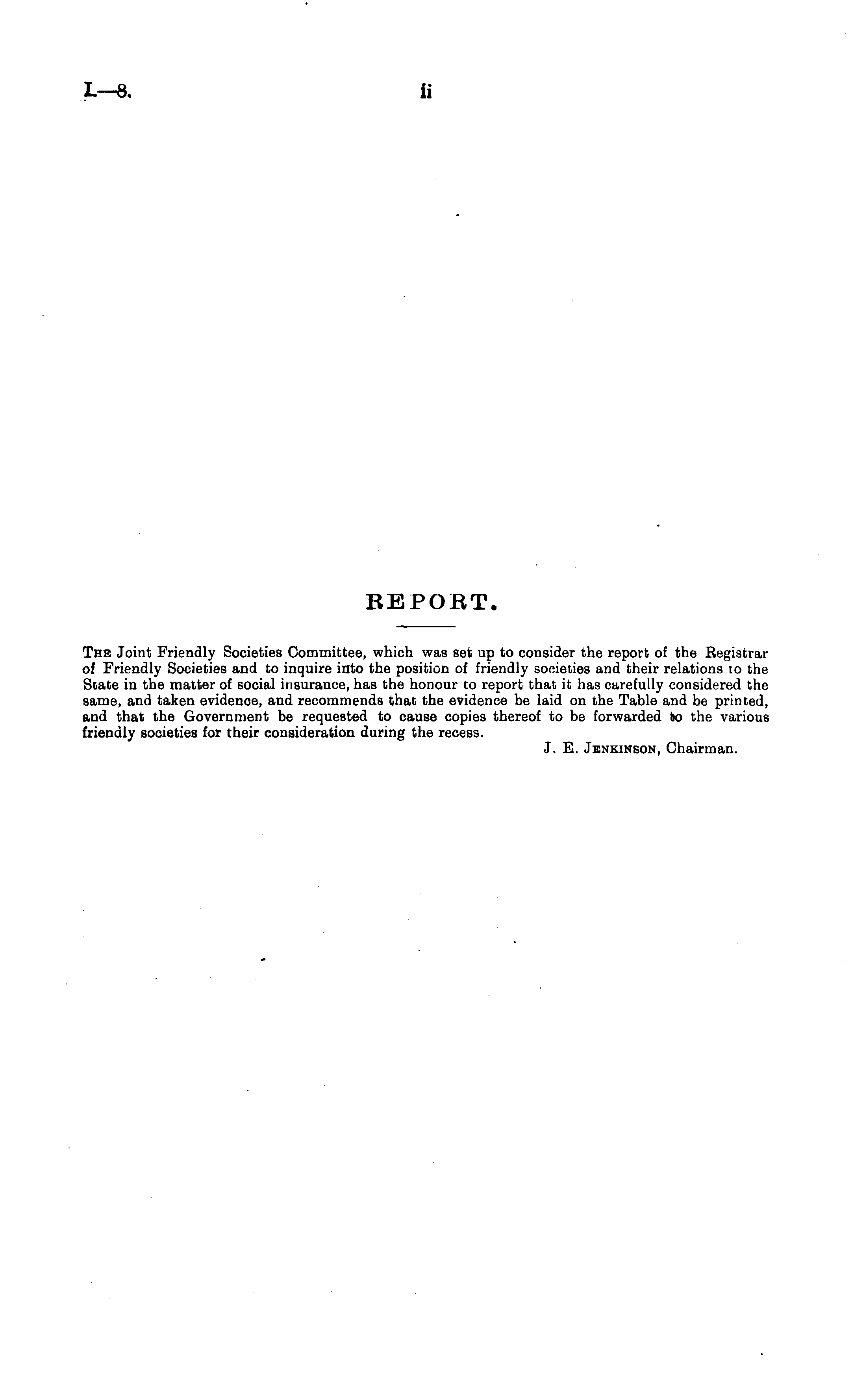 REPOBT. The Joint Friendly Societies Committee, which was set up to consider the report of the Registrar of Friendly Societies and to inquire into the position of friendly societies and their relations to the State in the matter of social insurance, has the honour to report that it has carefully considered the same, and taken evidence, and recommends that the evidence be laid on the Table and be printed, and that the Government be requested to cause copies thereof to be forwarded to the various friendly societies for their consideration during the recess. J. E. Jenkinson, Chairman.