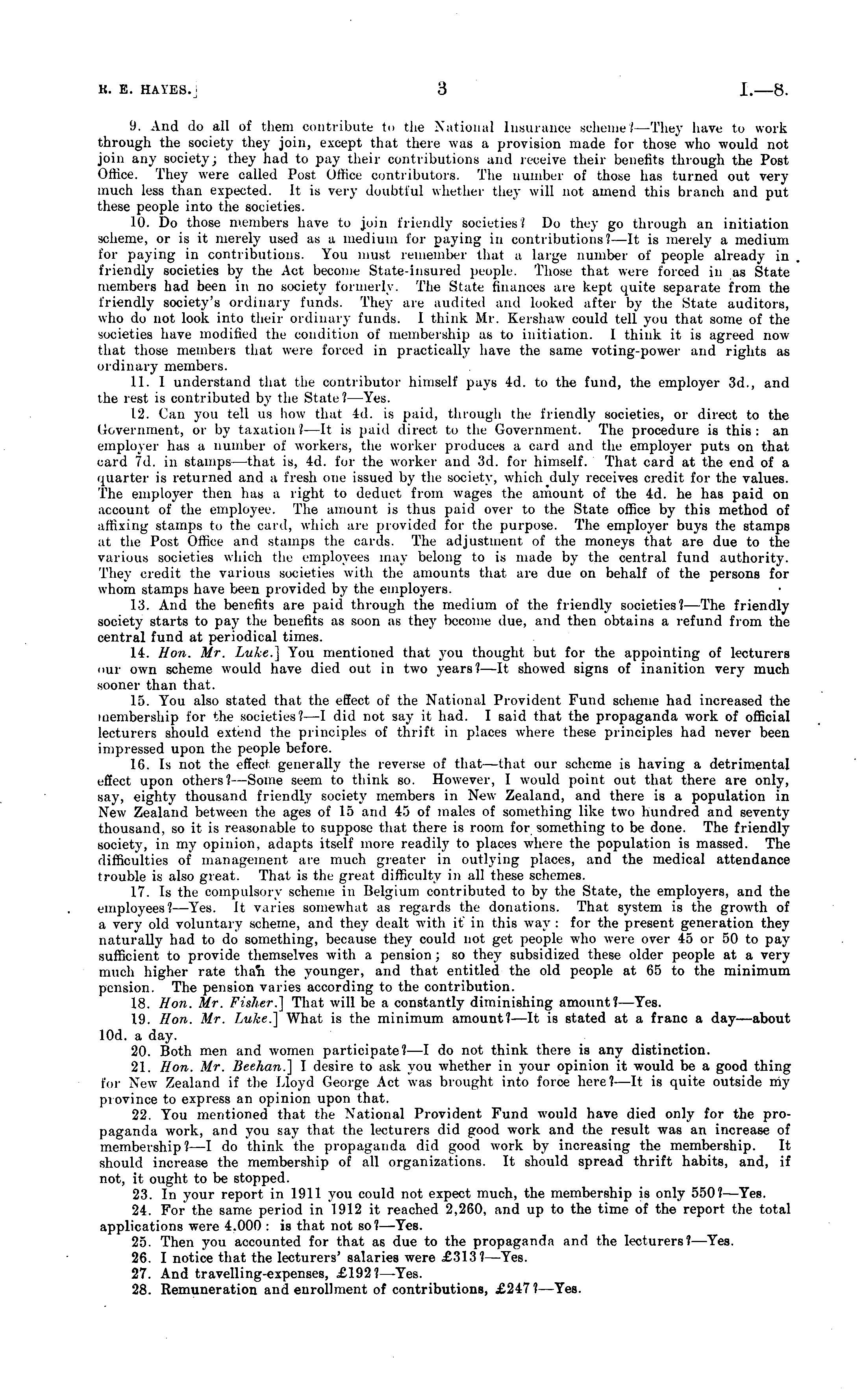 9. And do all of them contribute to the National Insurance scheme 1 They Lave to work through the society they join, except that there was a provision made for those who would not join any society; they had to pay their contributions and receive their benefits through the Post Office. They were called Post Office contributors. The number of those has turned out very much less than expected. It is very doubtful whether they will not amend this branch and put these people into the societies. 10. Do those members have to join friendly societies) Do they go through an initiation scheme, or is it merely used as a medium for paying in contributions?—lt is merely a medium for paying in contributions. You must remember that a large number of people already in friendly societies by the Act become State-insured people. Those that were forced in as State members had been in no society formerly. The State finances are kept quite separate from the friendly society's ordinary funds. They are audited and looked after by the State auditors, who do not look into their ordinary funds. I think Mr. Kershaw could tell you that some of the societies have modified the condition of membership as to initiation. 1 think it is agreed now that those members that were forced in practically have the same voting-power and rights as ordinary members. 11. I understand that the contributor himself pays 4d. to the fund, the employer 3d., and the rest is contributed by the State?— Yes. 12. Can you tell us how that id. is paid, through the friendly societies, or direct to the Government, or by taxation?—lt is paid direct to the Government. The procedure is this: an employer has a number of workers, the worker produces a card and the employer puts on that card 7d. in stamps —that is, id. for the worker and 3d. for himself. That card at the end of a quarter is returned and a fresh one issued by the society, which duly receives credit for the values. The employer then has a right to deduct from wages the amount of the 4d. he has paid on account of the employee. The amount is thus paid over to the State office by this method of affixing stamps to the card, which are provided for the purpose. The employer buys the stamps at the Post Office and stamps the cards. The adjustment of the moneys that are due to the various societies which the employees may belong to is made by the central fund authority. They credit the various societies with the amounts that are due on behalf of the persons for whom stamps have been provided by the employers. 13. And the benefits are paid through the medium of the friendly societies? —The friendly society starts to pay Ihe benefits as sunn as they become due, and then obtains a refund from the central fund at periodical times. 14. Hon. Mr. Luke.] You mentioned that you thought but for the appointing of lecturers nur own scheme would have died out in two years?—lt showed signs of inanition very much sooner than that. 15. You also stated that the effect of the National Provident Fund scheme had increased the membership for the societies? —I did not say it had. I said that the propaganda work of official lecturers should extend the principles of thrift in places where these principles had never been impressed upon the people before. 16. Is not the effect generally the reverse of that —that our scheme is having a detrimental effect upon others? —Some seem to think so. However, I would point out that there are only, say, eighty thousand friendly society members in New Zealand, and there is a population in New Zealand between the ages of 15 and 45 of males of something like two hundred and seventy thousand, so it is reasonable to suppose that there is room for something to be done. The friendly society, in my opinion, adapts itself more readily to places where the population is massed. The difficulties of management are much greater in outlying places, and the medical attendance trouble is also great. That is the great difficulty in all these schemes. 17. Is the compulsory scheme in Belgium contributed to by the State, the employers, and the employees? —Yes. It varies somewhat as regards the donations. That system is the growth of a very old voluntary scheme, and they dealt with it in this way : for the present generation they naturally had to do something, because they could not get people who were over 45 or 50 to pay sufficient to provide themselves with a pension ; so they subsidized these older people at a very much higher rate thah the younger, and that entitled the old people at 65 to the minimum pension. The pension varies according to the contribution. 18. Hon. Mr. Fisher.] That will be a constantly diminishing amount? —Yes. 19. Hon. Mr. Luke.] What is the minimum amount? —It is stated at a franc a day —about 10d. a day. 20. Both men and women participate?—l do not think there is any distinction. 21. Hon. Mr. Beehan.] I desire to ask you whether in your opinion it would be a good thing for New Zealand if the Lloyd George Act was brought into force here?—lt is quite outside my province to express an opinion upon that. 22. You mentioned that the National Provident Fund would have died only for the propaganda work, and you say that the lecturers did good work and the result was an increase of membership? —I do think the propaganda did good work by increasing the membership. It should increase the membership of all organizations. It should spread thrift habits, and, if not, it ought to be stopped. 23. In your report in 1911 you could not expect much, the membership is only 550? —Yes. 24. For the same period in 1912 it reached 2,260, and up to the time of the report the total applications were 4.000 : is that not so?— Yes. 25. Then you accounted for that as due to the propaganda and the lecturers?— Yes. 26. I notice that the lecturers' salaries were £313? —Yes. 27. And travelling-expenses, £192?— Yes. 28. Remuneration and enrollment of contributions, £247? 