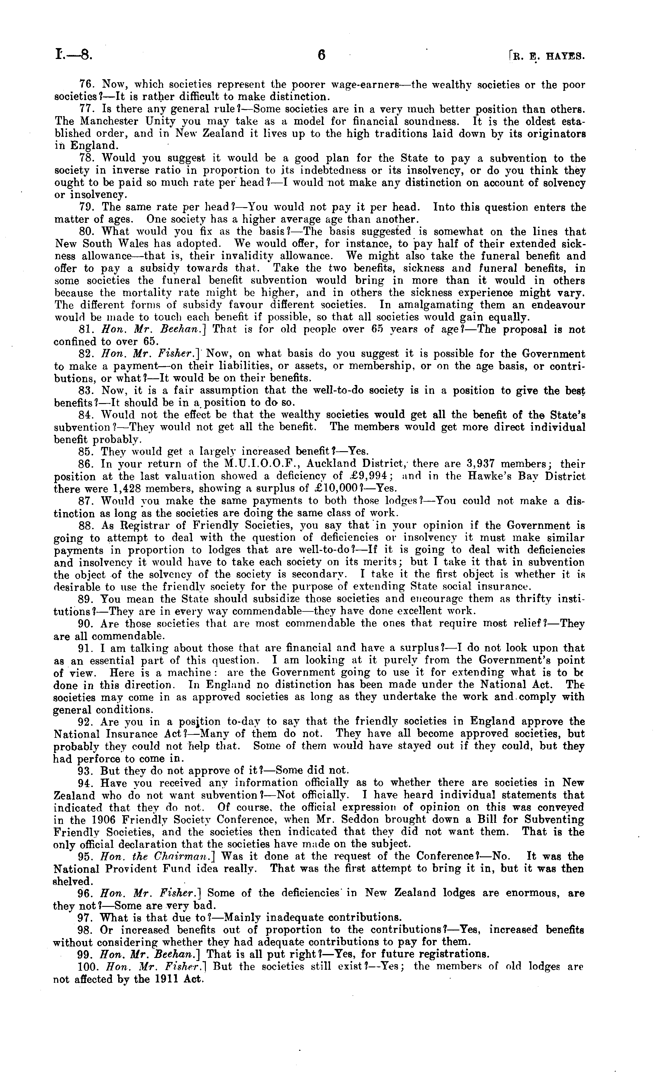 76. Now, which societies represent the poorer wage-earners —the wealthy societies or the poor societies?—lt is rather difficult to make distinction. 77. Is there any general rule? —Some societies are in a very much better position than others. The Manchester Unity you may take as a model for financial soundness. It is the oldest established order, and in New Zealand it lives up to the high traditions laid down by its originators in England. 78. Would you suggest it would be a good plan for the State to pay a subvention to the society in inverse ratio in proportion to its indebtedness or its insolvency, or do you think they ought to be paid so much rate per head ?—I would not make any distinction on account of solvency or insolvency. 79. The same rate per head? —You would not pay it per head. Into this question enters the matter of ages. One society has a higher average age than another. 80. What would you fix as the basis? —The basis suggested is somewhat on the lines that New South Wales has adopted. We would offer, for instance, to pay half of their extended sickness allowance —that is, their invalidity allowance. We might also take the funeral benefit and offer to pay a subsidy towards that. Take the two benefits, sickness and funeral benefits, in some societies the funeral benefit subvention would bring in more than it would in others because the mortality rate might be higher, and in others the sickness experience might vary. The different forms of subsidy favour different societies. In amalgamating them an endeavour would be made to touch each benefit if possible, so that all societies would gain equally. 81. Hon. Mr. Beehan.] That is for old people over 65 years of age?— The proposal is not confined to over 65. 82. Hon. Mr. Fisher.] Now, on what basis do you suggest it is possible for the Government to make a payment—on their liabilities, or assets, nr membership, or on the age basis, or contributions, or what? —It would be on their benefits. 83. Now, it is a fair assumption that the well-to-do society is in a position to give the best benefits? —It should be in a.position to do so. 84. Would not the effect be that the wealthy societies would get all the benefit of the State's subvention? —They would not get all the benefit. The members would get more direct individual benefit probably. 85. They would get a largely increased benefit? —Yes. 86. In your return of the M.U.1.0.0.F., Auckland District,-there are 3,937 members; their position at the last valuation showed a deficiency of .£9,994; and in the Hawke's Bay District there were 1,428 members, showing a surplus of ,£lO,OOO? —Yes. 87. Would you make the same payments to both those lodges?— You could not make a distinction as long as the societies are doing the same class of work. 88. As Registrar of Friendly Societies, you say that in your opinion if the Government is going to attempt to deal with the question of deficiencies or insolvency it must make similar payments in proportion to lodges that are well-to-do?—lf it is going to deal with deficiencies and insolvency it would have to take each society mi its merits : but T take it that in subvention the obiect of the solvency of the society is secondary. T take it the first object is whether it is desirable to use the friendly society for the purpose of extending State social insurance. 89. You mean the State should subsidize those societies and encourage them as thrifty institutions? —They are in every way commendable —they have done excellent work. 90. Are those societies that are most commendable the ones that require most relief?— They are all commendable. 91. I am talking about those that are financial and have a surplus?—l do not look upon that as an essential part of this question. I am looking at it purely from the Government's point of view. Here is a machine : are the Government going to use it for extending what is to b( done in this direction. In England no distinction has been made under the National Act. The societies may come in as approved societies as long as they undertake the work and.comply with general conditions. 92. Are you in a position to-day to say that the friendly societies in England approve the National Insurance Act? —Many of them do not. They have all become approved societies, but probably they could not help that. Some of them would have stayed out if they could, but they had perforce to come in. 93. But they do not approve of it?— Some did not. 94. Have you received any information officially as to whether there are societies in New Zealand who do not want subvention? —Not officially. I have heard individual statements that indicated that they do not. Of course, the official expression of opinion on this was conveyed in the 1906 Friendly Society Conference, when Mr. Seddon brought down a Bill for Subventing Friendly Societies, and the societies then indicated that they did not want them. That is the only official declaration that the societies have made on the subject. 95. Hon. the Chairman.] Was it done at the request of the Conference?— No. It was the National Provident Fund idea really. That was the first attempt to bring it in, but it was then shelved. 96. Hon. Mr. Fisher.] Some of the deficiencies in New Zealand lodges are enormous, are they not?— Some are very bad. 97. What is that due to? —Mainly inadequate contributions. 98. Or increased benefits out of proportion to the contributions? —Yes, increased benefits without considering whether they had adequate contributions to pay for them. 99. Hon. Mr. Beehan.] That is all put right? —Yes, for future registrations. 100. Hon. Mr. Fisher.] But the societies still exist? —Yes; the members of old lodges are not affected by the 1911 Act.