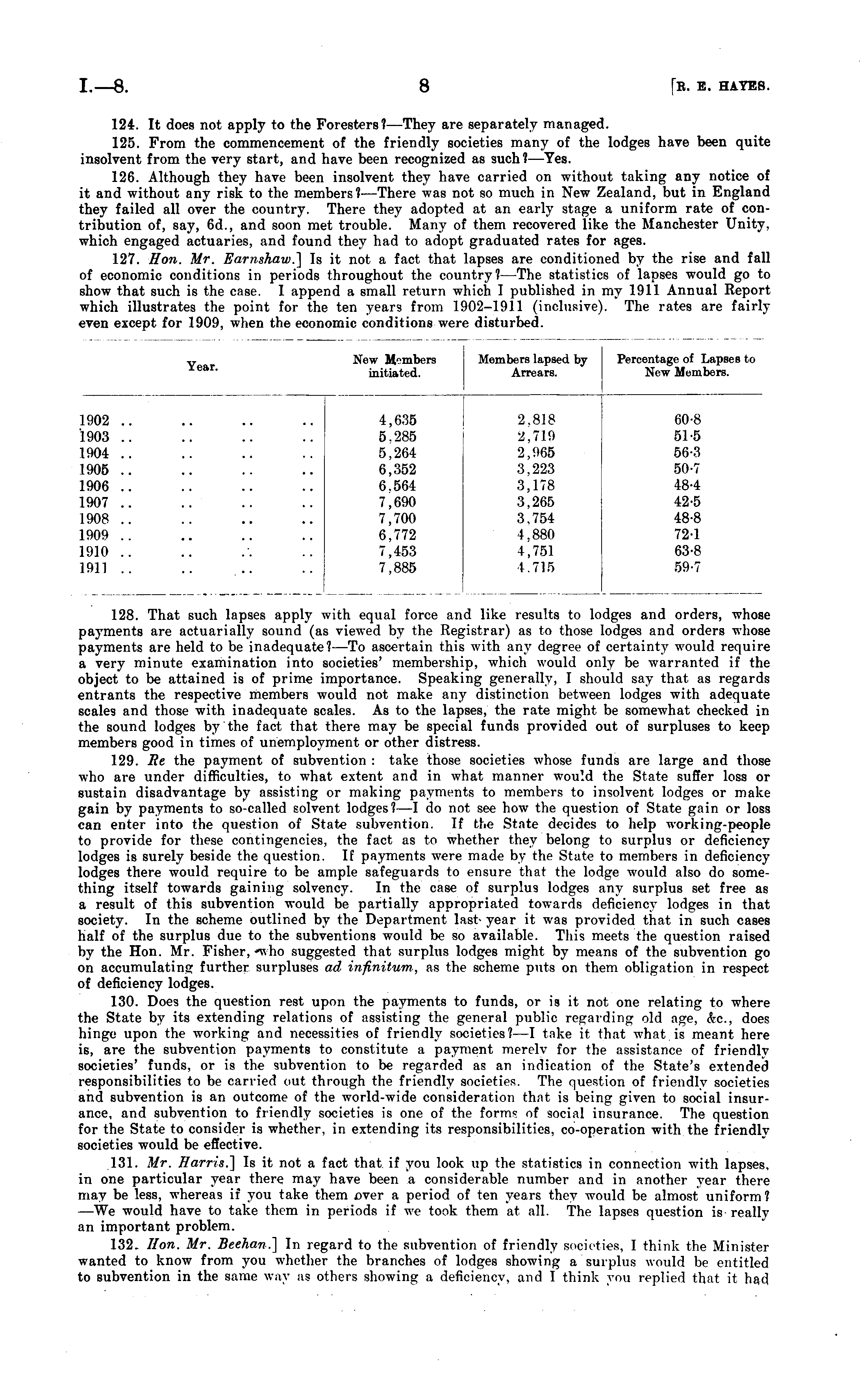 124. It does not apply to the Foresters? —They are separately managed. 125. From the commencement of the friendly societies many of the lodges have been quite insolvent from the very start, and have been recognized as such? —Yes. 126. Although they have been insolvent they have carried on without taking any notice of it and without any risk to the members?— There was not so much in New Zealand, but in England they failed all over the country. There they adopted at an early stage a uniform rate of contribution of, say, 6d., and soon met trouble. Many of them recovered like the Manchester Unity, which engaged actuaries, and found they had to adopt graduated rates for ages. 127. Hon. Mr. Earnshaw.] Is it not a fact that lapses are conditioned by the rise and fall of economic conditions in periods throughout the country?— The statistics of lapses would go to show that such is the case. I append a small return which I published in my 1911 Annual Report which illustrates the point for the ten years from 1902-1911 (inclusive). The rates are fairly even except for 1909, when the economic conditions were disturbed.