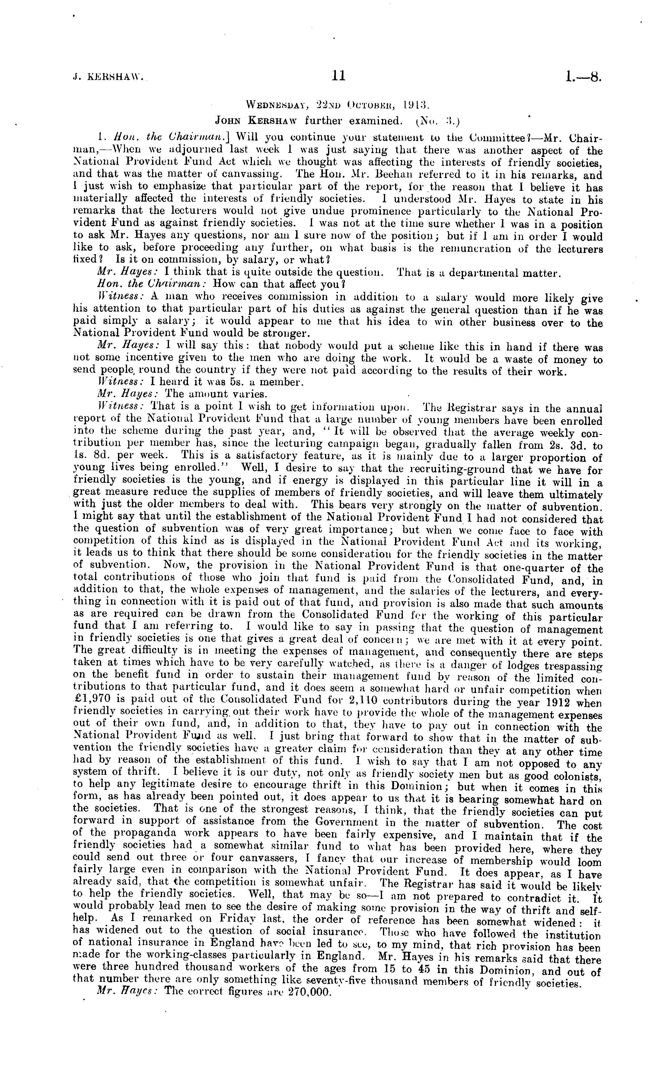 Wednesday, 22nd October, 1913. John Kershaw further examined. (No. 3.) 1. Hou. the Chairman.] Will you continue your statement to the Committee] —Mr. Chairman. When we adjourned lust week I was just saying that there was another aspect of the National Provident Fund Act which we thought was affecting the interests of friendly societies, and that was the matter of canvassing. The Hon. Mr. Beehan referred to it in his remarks, and 1 just wish to emphasize that puiticular part of the report, for the reason that 1 believe it has materially affected the interests of friendly societies. 1 understood Mr. Hayes to state in his remarks that the lecturers would not give undue prominence particularly to the National Provident Fund as against friendly societies. 1 was not at the time sure whether 1 was in a position to ask Mr. Hayes any questions, nor am 1 sure now of the position; but if 1 am in order I would like to ask, before proceeding any further, on what basis is the remuneration of the lecturers fixed? Is it on commission, by salary, or what? Mr. llaytx: I think that is quite outside the question. That is a departmental matter. Hon. the Chairman: How can that affect you? Witness: A man who receives commission in addition to a salary would more likely give his attention to that particular part of his duties as against the general question than if he was paid simply a salary; it would appear to me that his idea to win other business over to the National Provident Fund would be stronger. Mr. Hayes: 1 will say this: that nobody would put a scheme like this in hand if there was not some incentive given to the men who are doing the work. It would be a waste of money to send people round the country if they were not paid according to the results of their work. II itnesn: I heard it was ss. a member. Mr. Hayes: The amount varies. Witness: That is a point 1 wish to get information upon. The Registrar says in the annual report of the National Provident Fund that a large number of young members have been enrolled into the scheme dining the past year, and, " It will be observed that the average weekly contribution per member has, since the lecturing campaign began, gradually fallen from 2s. 3d. to Is. Bd. per week. This is a satisfactory feature, as it is mainly due to a larger proportion of young lives being enrolled." Well, I desire to say that the recruiting-ground that we have for friendly societies is the young, and if energy is displayed in this particular line it will in a great measure reduce the supplies of members of friendlj societies, and will leave them ultimately with just the older members to deal with. This bears very strongly on the matter of subvention. 1 might say that until the establishment of the National Provident Fund I had not considered that the question of subvention was of very great importance; but when we come face to face with competition of this kind as is displayed in the National Provideni Fund Ac! and its working, it leads us to think that there should be some consideration for the friendly societies in the matter of subvention. Now, the provision in the National Provident Fund is "that one-quarter of the total contributions of those who join that fund is paid from the Consolidated Fund, and, in addition to that, the whole expenses of management, and the salaries of the lecturers, and everything in connection with it is paid out of that fund, and provision is also made that such amounts as are required can be drawn from the Consolidated Fund for the working of this particular fund that I am referring to. 1 would like to say in passing ihal the question of management in friendly societies is one that gives a great deal of concern; we are met with it at every point. The great difficulty is in meeting the expenses of management, and consequently there are steps taken at times which have to be very carefully watched, as there is a danger of lodges trespassing on the benefit fund in order to sustain their management fund by reason of the limited con" tributions to that particular fund, and it does seem a somewhat hard or unfair competition when £1,970 is paid out of the Consolidated Fund for 2,110 contributors during the year 1912 when friendly societies in carrying out their work have to provide the whole of the management expenses out of their own fund, and, in addition to that, they have to pay out in connection with the National Provident Fiyid as well. I just bring that forward to show that in the matter of subvention the friendly societies have a greater claim for consideration than they at any other time had by reason of the establishment of this fund. I wish to say that lam not opposed to any system of thrift. I believe it is our duty, not only as friendly society men but as good colonists to help any legitimate desire to encourage thrift in this Dominion ;' but when it comes in this form, as has already been pointed out. it does appeal- to us that it is bearing somewhat hard on the societies. That is one of the strongest reasons. I think, that the friendly societies can put forward in support of assistance from the Government in the mailer of subvention The cost of the propaganda work appears to have been fairly expensive, and I maintain that if the friendly societies had a somewhat similar- fund to what lias been provided here, where they could send out three or four canvassers, I fancy that our increase of membership would loom fairly large even in comparison with the National Provident Fund. It does appear as I have already said, that the competition is somewhat unfair. The Registrar has said it would be likely to help the friendly societies. Well, that may be so—l am not prepared to contradict it It would probably lead men to see the desire of making some provision in the way of thrift and selfhelp. As I remarked on Friday last, the order of reference has been somewhat widened •i< has widened out to the question of social insurance. Those who have follow