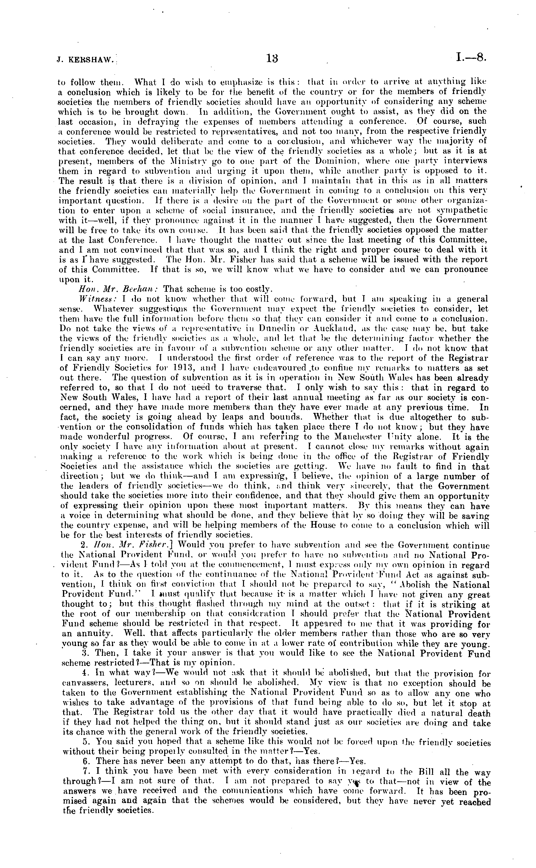 to follow them. Wliai Ido wish to emphasize is this: that in order to arrive ai anything Like a conclusion which is likely to be for the benefil i>l the country or for the members of friendly societies the members of friendly societies should bave an opportunity of considering any scheme which is tii Ik: brought down. In addition, the Government ought to assist, as they did on the last ocoaeion, in defraying the expenses of members attending a conference. Of course, such n conference would be restricted to representatives, and not too many, from the respective friendly societies. They would deliberate and come to a conclusion, and whichever way the majority i>l , that conference decided, let that be the view of the friendly societies as a whole; but as it is at present, members of the Ministry go to one part of the Dominion, where one party interviews them in regard ti> subvention and urging it upon them, while another party is opposed to it. The result is that there is c division of opinion, and I maintain that in this as in all matters the friendly societies can materially help the Government in coming to a conclusion on this very important question. If there is a desire on the part of the Government or some other organization d> enter upon a scheme of social insurance, ami the friendly societies are not sympathetic with it—well, if they pronounce against it in the manner 1 have suggested, then the Government will he Ui-<- to take its own course. It has been said thai the friendly societies opposed the matter at the last Conference. I have thought the matter out sinci the last meeting of this Committee, and 1 am not convinced that that was bo, ami I think the right ami proper course to ileal with it is a< I have suggested. The lion. Mr. Fisher has said that a scheme will be issueil with the report of this Committee. If that is so, we will know what we have to consider and we can pronounce upon it. Hon. Mr. Beehan: That scheme is too costly. Witness: I 'I" not know whether that will come forward, but I am speaking in a general sense. Whatever suggestions the Government may expect the friendly societies to consider, let them have the full information before them SO thai the\ consider ii and come to a conclusion. Do not take the views of a representative in Dunedin or Auckland, as the case may be. but take the views of the friendly societies as a whole, and let th.it be the determining factor whether the friendly societies are in favour of a subvention scheme or any other matter. I do not know that I can say any more. I understood ihe first order of reference was to the report of the Registrar of Friendly Societies for 1913, and I have endeavoured .to confine my remarks to matters as set out there. The question of subvention as it is in operation in New South Wales has been already referred to. so tha! I do not need to traverse that. I Only wish to say this: that in regard to New South Wales, I have had a report of their last annual meeting as far as our society is concerned, and they have made more members than Ihe'y have ever made at any previous time. In fact, the society is going ahead by leaps and bounds. Whether thai is due altogether to subvention or the consolidation of funds which has taken place there T do not know; but they have made wonderful progress. Of course, lam referring to the Manchester Unity alone. It is the only society 1 have any information about at present. I cannot close my remarks without again making a reference to the work which is being done in the office of the Registrar of Friendly Societies and the assistance which the societies are getting. We have no fault to find in that direction; but we do think and lam expressing, I believe, the opinion of a large number of the leaders of friendly societies — we do think, .-.nd think very sincerely, that the Government should take the societies more into their confidence, and that thej should give them an opportunity of expressing their opinion upon these most important matters. By this means they can have a voice in determining what should be done, and they believe that l>\ so doing they will be saving the country expense, and will l)i- helping members of the House to come I" a '(inclusion which will be for the best inteiests of friendly societies. 2. II mi. Mr. Fisher.] Would you prefer to have subvention and see the Government continue the National Provident Fund, or would you prefer to have no subvention and no National Provident Fundi— As I told you at the commencement, I must express only my own opinion in regard to it. As to the question of the continuance of the National Provident Fund Act as against subvention. ! think on first conviction that I should not be prepared to saw "Abolish the National Provident Fund." I must qualify th.at because it-is a matter which I have not given any great thought to; but this thought Hashed through m> mind at the outset: that if it is striking at the root of our membership mi thai consideration I should prefer 'hat the National Provident Fund scheme should be restricted in that respect. It appeared to me that it was providing for an annuity. Well, that affects part ieiibirl\ the older members rather than those who are so very young so far as the\ would be able to come in at a lower rate of contribution while they are young. 3. Then, I take it your answer is that you would like to see the National Provident Fund scheme restricted? That is my opinion. 4. In what way?—We would not ask that it should be abolished, hut that the provision for canvassers. Lecturers, and SO in should be abolished. My view is that no exception should he taken to the Government establishing the National Provident Fund so as to allow any one who wishes to take advantage of the provisions of that fund being able to do so, but let it stop at that. The Registrar told us the other day that it would have practically died a natural death if they had not helped the thing on. but it should stand just a