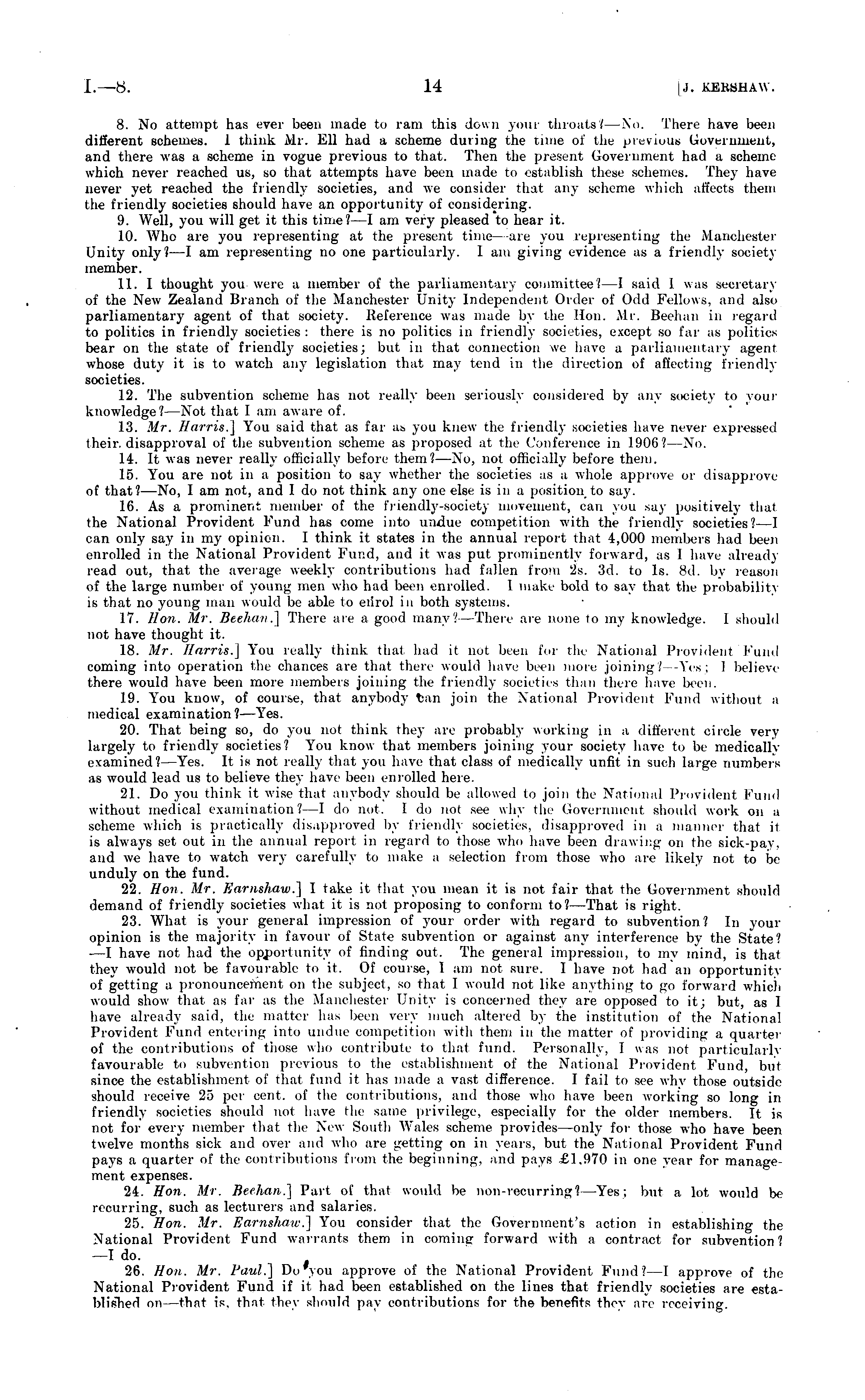 8. No attempt has ever been made to ram this down your throats)— No. There have been different schemes, i think Mr. Ell had a scheme during the tune of the previous Government, and there was a scheme in vogue previous to that. Then the present Government hud a scheme which never reached us, so that attempts have been made to establish these schemes. 'I , hoy have never yet reached the friendly societies, and we consider thai any scheme which affects them the friendly societies should have an opportunity of considering. 9. Well, you will get it this time? —I am very pleased to hear it. 10. Who are you representing at the present time are you representing the Manchester Unity only?—I am representing no one particularly. lam giving evidence as a friendly society member. 11. 1 thought you were a member of the parliamentary committee] — 1 said I was secretary of the New Zealand Branch of the Manchester Unity Independent Order of Odd Fellows, am] also parliamentary agent of that society. Keference was made by the lion. Mr. Beehan in regard to politics in friendly societies: there is no politics in friendly societies, except so far as polities bear on the state of friendly societies; but in that connection we have a parliamentary agent whose duty it is to watch any legislation that may tend in bhe direction of affecting friendly societies. 12. The subvention scheme has not really been seriously considered by any society in pour knowledge?— Not that 1 am aware of. 13. ."!//■. //arris.] You said that as far as you knew 111< ■ friendly societies have never expressed their, disapproval of the subvention scheme as proposed at the Conference in 1906?—N0. 14. It was never really officially before them?—No, not officially before them. 15. You are not in a position to say whether the societies as a whole approve or disapprove of that? —No, lam not, and Ido not think any one else is in a position,to say. 16. As a prominent member of the friendly society movement, can you say positively thai the National Provident Fund has come into Undue competition with the friendly societies?—l can only say in my opinion. I think it states in the annual repori that 4,000 members had lien enrolled in the National Provident Fund, and it was put prominently forward 5 as I have already read out, that the average weekly contributions had fallen from 2s. .'id. to Is. Bd. by reason of the large number of young men who had been enrolled. I make bold to say that the probability is that no young man would be able to erirol in both .systems. 17. Hon. Mr. Beehan .] There are a good many? —There are none to my knowledge. I should not have thought it. 18. Mr. Harris.] You really think that had it not been for the National Provident Fund coming into operation the chances are that there would have been more joining! sTes; I believe there would have been more members joining the friendly societies than there have be< 19. You know, of course, thai anybody ban join the National Provideni Fund without a medical examination? —Yes. 20. That being so. do you not think they are probably working in a different circle very largely to friendly societies? You know that members joining your society have to lie medically examined? —Yes. It is not really that you have that class of medically unfit in such large numbers as would lead us to believe they have been enrolled here. 21. Do you think it wise that anybody should be allowed to join the National Provident Fund without medical examination? — I do not. ido 00l see why the Government si Id work on a scheme which is practically disapproved by friendly societies, disapproved in a manner that it is always set out in the annual report in regard to those who have been drawing on the sick-pay, and we have to watch very carefully to make a selection from those who are likely not to be unduly on the fund. 22. I/dii. Mr. Earnshatv.] 1 take it that you mean it is not fair that the Government should demand of friendly societies what it is not proposing to conform to?— That is right. 23. What is your genera] impression of your order with regard to subvention? In your opinion is the majority in favour of State subvention or against any interference l>\ the State.' ■ —I have not had the opportunity of finding out. The general impression, to my mind, is that they would not be favourable to it. Of course, I am not sure. 1 have not had an opportunity of getting a pronouncement on the subject, so that I would not like anything to μ-o forward which would show thai as far as the Manchester Unity is concerned they are opposed to it; but, as I have already said, the matter has been very much altered by the institution of the National Provident Fund entering into undue competition with them in the matter of providing a quarter of the contributions of those who contribute to that fund. Personally. 1 was not particularly favourable to subvention previous to the establishment of the National Provident Fund, but since the establishment of that fund it has made a vast difference. I fail to see why those outside should receive 25 per cent, of the contributions, ami those who have been working so long in friendly societies should not have the same privilege, especially for the older members. Tt is not for every member that the New South Wales soheme provides —only for those who have been twelve months sick and over ami who are getting on in years, but the National Provident Fund pays a quarter of the contributions from the beginning, and pays £1.970 in one year for management expenses. 24. Hon. Mr. Beehan.] Part of that would lie non-recurring I—Yes;1 —Yes; but a lot would be recurring, such as lecturers and salaries. 25. Hon. Mr. Earnshaw.] You consider that the Government's action in establishing the National Provident Fund warrants them in coming forward with a contract for subvention? —I do. 26. Hon. Mr. /'mil.] Do you approve of the National Provident Fund? —I approve of th