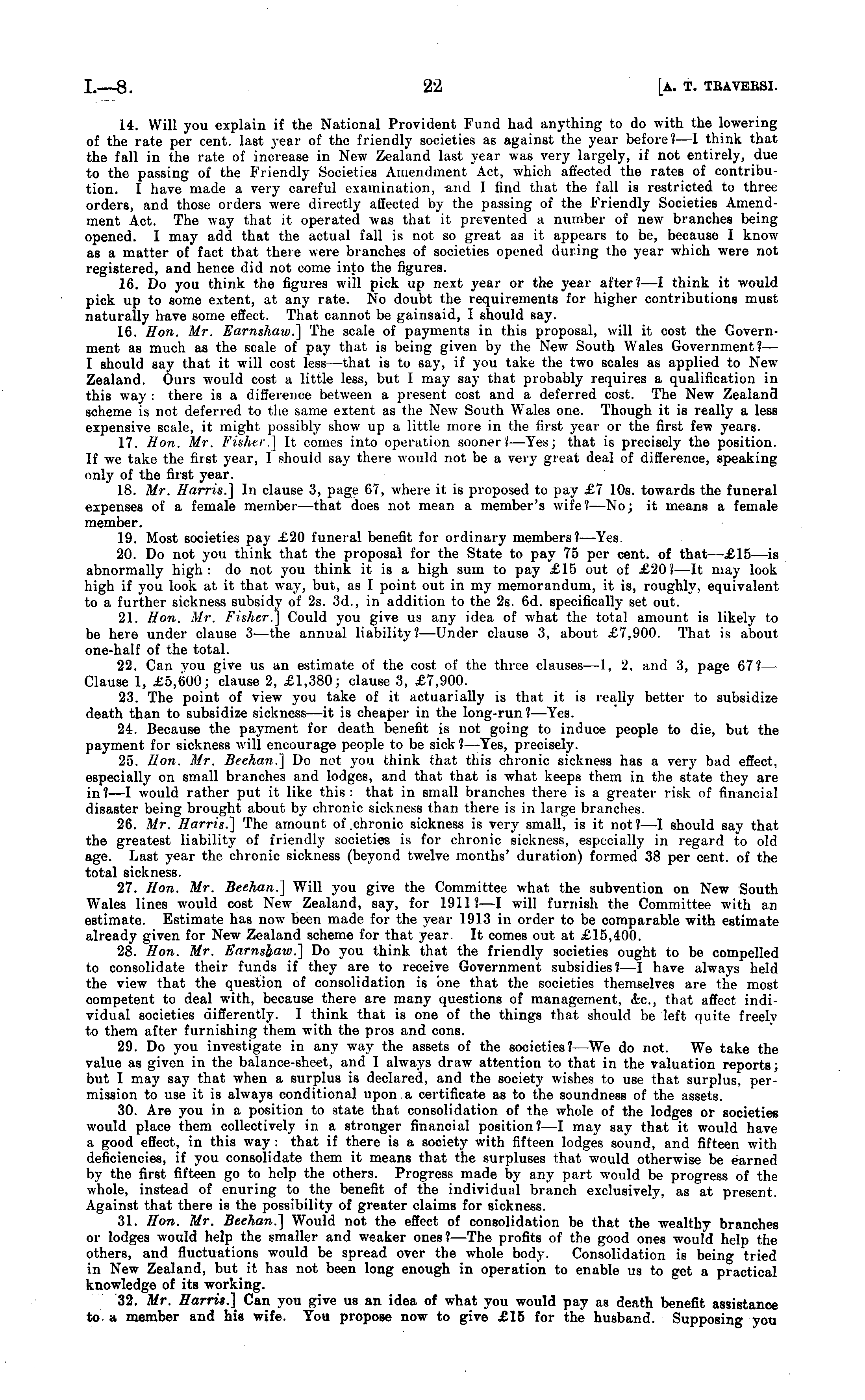 14. Will you explain if the National Provident Fund had anything to do with the lowering of the rate per cent, last year of the friendly societies as against the year before? —I think that the fall in the rate of increase in New Zealand last year was very largely, if not entirely, due to the passing of the Friendly Societies Amendment Act, which affected the rates of contribution. I have made a very careful examination, and I find that the fall is restricted to three orders, and those orders were directly affected by the passing of the Friendly Societies Amendment Act. The way that it operated was that it prevented a number of new branches being opened. I may add that the actual fall is not so great as it appears to be, because I know as a matter of fact that there were branches of societies opened during the year which were not registered, and hence did not come into the figures. 16. Do you think the figures will pick up next year or the year after? —I think it would pick up to some extent, at any rate. No doubt the requirements for higher contributions must naturally have some effect. That cannot be gainsaid, I should say. 16. Hon. Mr. Earnshaw.] The scale of payments in this proposal, will it cost the Government as much as the scale of pay that is being given by the New South Wales Government?— I should say that it will cost less —that is to say, if you take the two scales as applied to New Zealand. Ours would cost a little less, but I may say that probably requires a qualification in this way : there is a difference between a present cost and a deferred cost. The New Zealand scheme is not deferred to the same extent as the New South Wales one. Though it is really a less expensive scale, it might possibly show up a little more in the first year or the first few years. 17. Hon. Mr. Fisher.] It comes into operation sooner?— Yes; that is precisely the position. If we take the first year, I should say there would not be a very great deal of difference, speaking only of the first year. 18. Mr. Harris.] In clause 3, page 67, where it is proposed to pay £7 10s. towards the funeral expenses of a female member —that does not mean a member's wife? —No; it means a female member. 19. Most societies pay £20 funeral benefit for ordinary members? —Yes. 20. Do not you think that the proposal for the State to pay 75 per cent, of that—£ls—is abnormally high: do not you think it is a high sum to pay £15 out of £20?— It may look high if you look at it that way, but, as I point out in my memorandum, it is, roughly, equivalent to a further sickness subsidy of 2s. 3d., in addition to the 2s. 6d. specifically set out. 21. Hon. Mr. Fisher.) Could you give us any idea of what the total amount is likely to be here under clause 3—the annual liability? —Under clause 3, about £7,900. That is about one-half of the total. 22. Can you give us an estimate of the cost of the three clauses —1, 2, and 3, page 67? — Clause 1, £5,600; clause 2, £1,380; clause 3, £7,900. 23. The point of view you take of it actuarially is that it is really better to subsidize death than to subsidize sickness —it is cheaper in the long-run?— Yes. 24. Because the payment for death benefit is not going to induce people to die, but the payment for sickness will encourage people to be sick ?—Yes, precisely. 25. Hon. Mr. Beehan.] Do not you think that this chronic sickness has a very bad effect, especially on small branches and lodges, and that that is what keeps them in the state they are in?—l would rather put it like this: that in small branches there is a greater risk of financial disaster being brought about by chronic sickness than there is in large branches. 26. Mr. Harris.] The amount of.chronic sickness is very small, is it not?—l should say that the greatest liability of friendly societies is for chronic sickness, especially in regard to old age. Last year the chronic sickness (beyond twelve months' duration) formed 38 per cent, of the total sickness. 27. Hon. Mr. Beehan.] Will you give the Committee what the subvention on New South Wales lines would cost New Zealand, say, for 1911?— I will furnish the Committee with an estimate. Estimate has now been made for the year 1913 in order to be comparable with estimate already given for New Zealand scheme for that year. It comes out at £15,400. 28. Hon. Mr. Earnshaw.] Do you think that the friendly societies ought to be compelled to consolidate their funds if they are to receive Government subsidies?—l have always held the view that the question of consolidation is one that the societies themselves are the most competent to deal with, because there are many questions of management, &c, that affect individual societies differently. I think that is one of the things that should be left quite freely to them after furnishing them with the pros and cons. 29. Do you investigate in any way the assets of the societies?—We do not. We take the value as given in the balance-sheet, and I always draw attention to that in the valuation reports; but I may say that when a surplus is declared, and the society wishes to use that surplus, permission to use it is always conditional upon.a certificate as to the soundness of the assets. 30. Are you in a position to state that consolidation of the whole of the lodges or societies would place them collectively in a stronger financial position?—l may say that it would have a good effect, in this way : that if there is a society with fifteen lodges sound, and fifteen with deficiencies, if you consolidate them it means that the surpluses that would otherwise be earned by the first fifteen go to help the others. Progress made by any part would be progress of the whole, instead of enuring to the benefit of the individual branch exclusively, as at present. Against that there is the possibility of greater claims for sickness. 31. Hon. Mr. Beehan.] Would not the effect of consolidation be that the wealthy branches or