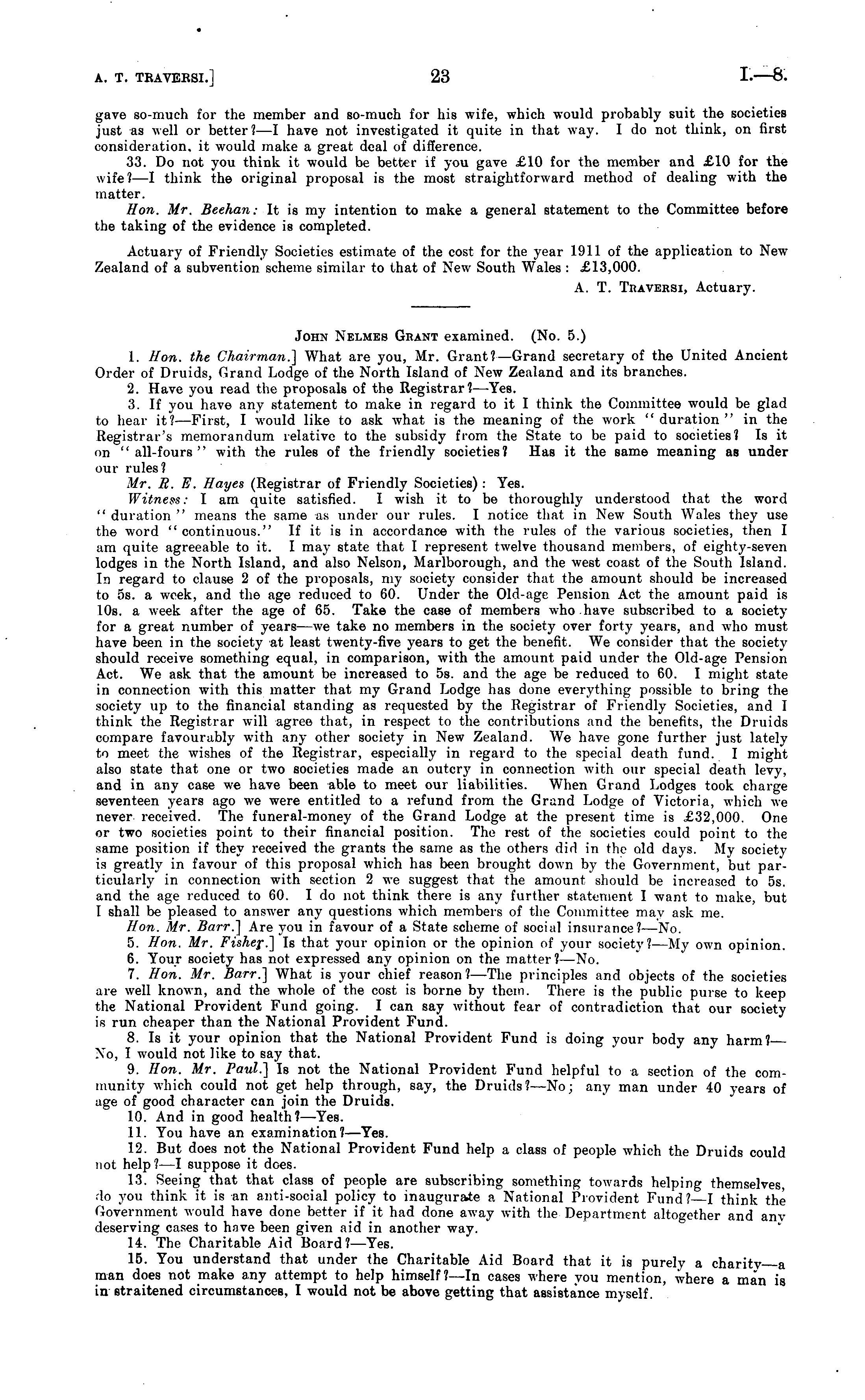 John Nelmes Grant examined. (No. 5.) 1. Hon. the Chairman.'] What are you, Mr. Grant?— Grand secretary of the United Ancient Order of Druids, Grand Lodge of the North Island of New Zealand and its branches. 2. Have you read the proposals of the Registrar? —Yes. 3. If you have any statement to make in regard to it I think the Committee would be glad to hear it? —First, I would like to ask what is the meaning of the work "duration" in the Registrar's memorandum relative to the subsidy from the State to be paid to societies? Is it on "all-fours" with the rules of the friendly societies? Has it the same meaning as under our rules? Mr. B. E. Hayes (Registrar of Friendly Societies) : Yes. Witness: I am quite satisfied. I wish it to be thoroughly understood that the word " duration " means the same as under our rules. I notice that in New South Wales they use the word "continuous." If it is in accordance with the rules of the various societies, then I am quite agreeable to it. I may state that I represent twelve thousand members, of eighty-seven lodges in the North Island, and also Nelson, Marlborough, and the west coast of the South Island. In regard to clause 2 of the proposals, my society consider that the amount should be increased to ss. a week, and the age reduced to 60. Under the Old-iige Pension Act the amount paid is 10s. a week after the age of 65. Take the case of members who.have subscribed to a society for a great number of years—we take no members in the society over forty years, and who must have been in the society at least twenty-five years to get the benefit. We consider that the society should receive something equal, in comparison, with the amount paid under the Old-age Pension Act. We ask that the amount be increased to ss. and the age be reduced to 60. I might state in connection with this matter that my Grand Lodge has done everything possible to bring the society up to the financial standing as requested by the Registrar of Friendly Societies, and I think the Registrar will agree that, in respect to the contributions and the benefits, the Druids compare favourably with any other society in New Zealand. We have gone further just lately to meet the wishes of the Registrar, especially in regard to the special death fund. I might also state that one or two societies made an outcry in connection with our special death levy, and in any case we have been able to meet our liabilities. When Grand Lodges took charge seventeen years ago we were entitled to a refund from the Grand Lodge of Victoria, which we never received. The funeral-money of the Grand Lodge at the present time is £32,000. One or two societies point to their financial position. The rest of the societies could point to the same position if they received the grants the same as the others did in the old days. My society is greatly in favour of this proposal which has been brought down by the Government, but particularly in connection with section 2 we suggest that the amount should be increased to ss. and the age reduced to 60. I do not think there is any further statement I want to make, but I shall be pleased to answer any questions which members of the Committee may ask me. Hon. Mr. Barr.] Are you in favour of a State scheme of social insurance?— No. 5. Hon. Mr. Fishej-.] Is that your opinion or the opinion of your society?—My own opinion. 6. Your society has not expressed any opinion on the matter? —No. 7. Hon. Mr. Barr.] What is your chief reason?— The principles and objects of the societies are well known, and the whole of the cost is borne by them. There is the public purse to keep the National Provident Fund going. I can say without fear of contradiction that our society is run cheaper than the National Provident Fund. 8. Is it your opinion that the National Provident Fund is doing your body any harm? Xo, I would not like to say that. 9. Hon. Mr. Paul.] Is not the National Provident Fund helpful to a section of the community which could not get help through, say, the Druids?—No; any man under 40 years of age of good character can join the Druids. 10. And in good health?— Yes. 11. You have an examination? —Yes. 12. But does not the National Provident Fund help a class of people which the Druids could not help ?—I suppose it does. 13. Seeing that that class of people are subscribing something towards helping themselves, do you think it is an anti-social policy to inaugurate a National Provident Fund?—l think the Government would have done better if it had done away with the Department altogether and any deserving cases to have been given aid in another way. 14. The Charitable Aid Board?— Yes. 15. You understand that under the Charitable Aid Board that it is purely a charity a man does not make any attempt to help himself?—ln cases where you mention, where a man is in straitened circumstances, I would not be above getting that assistance myself.