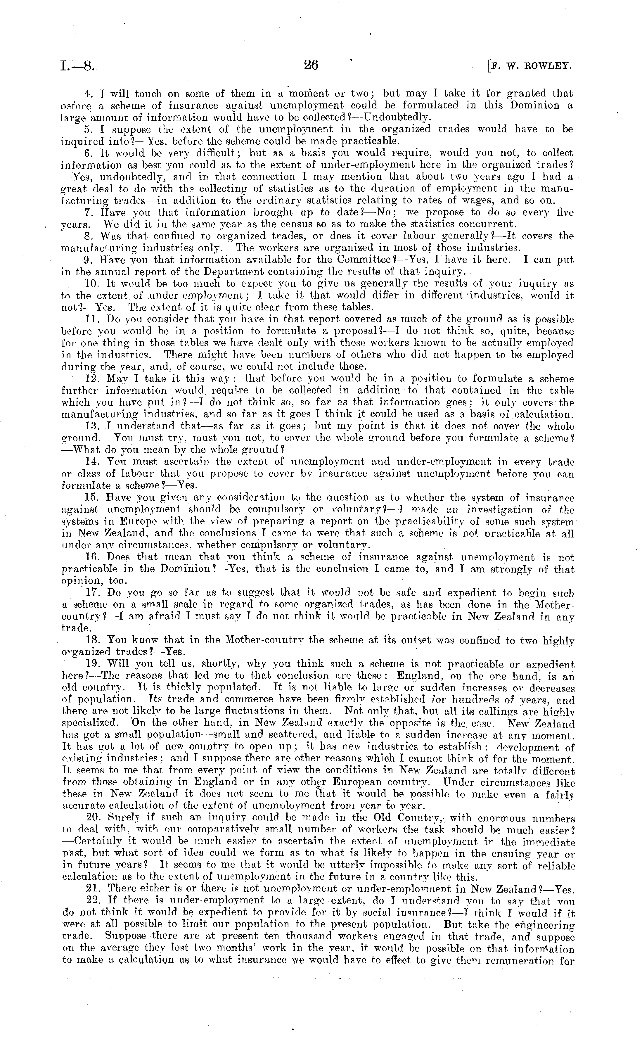 4. I will touch on some of them in a moment or two; but may I take it for granted that before a scheme of insurance against unemployment could be formulated in this Dominion a large amount of information would have to be collected? —Undoubtedly. 5. I suppose the extent of the unemployment in the organized trades would have to be inquired into? —Yes, before the scheme could be made practicable. 6. It would be very difficult; but as a basis you would require, would you not, to collect information as best you could as to the extent of under-employment here in the organized trades 1 —Yes, undoubtedly, and in that connection I may mention that about two years ago I had a great deal to do with the collecting of statistics as to the duration of employment in the manufacturing trades —in addition to the ordinary statistics relating to rates of wages, and so on. 7. Have you that information brought up to date?—No; we propose to do so every five years. We did it in the same year as the census so as to make the statistics concurrent. 8. Was that confined to organized trades, or does it cover labour generally? —It covers the manufacturing industries only. The workers are organized in most of those industries. 9. Have you that information available for the Committee? —Yes, I have it here. I can put in the annual report of the Department containing the results of that inquiry. 10. It would be too much to expect you to give us generally the results of your inquiry as to the extent of under-employment; I take it that would differ in different industries, would it not?— Yes. The extent of it is quite clear from these tables. 11. Do you consider that you have in that report covered as much of the ground as is possible before you would be in a position to formulate a proposal?—l do not think so, quite, because for one thing in those tables we have dealt only with those workers known to be actually employed in the industries. There might have been numbers of others who did not happen to be employed during the year, and, of course, we could not include those. 12. May I take it this way: that before you would be in a position to formulate a scheme further information would, require to be collected in addition to that contained in the table which you have put in?—l do not think so, so far as that information goes; it only covers the manufacturing industries, and so far as it goes I think it could be used as a basis of calculation. 13. I understand that —as far as it goes; but my point is that it does not cover the whole ground. You must try, must you not, to cover the whole ground before you formulate a scheme? —What do you mean by the whole ground? 14. You must ascertain the extent of unemployment and under-employment in every trade or class of labour that you propose to cover by insurance against unemployment before you can formulate a scheme? —Yes. 15. Have you given any consideration to the question as to whether the system of insurance against unemployment should be compulsory or voluntary?—l mnde an investigation of the systems in Europe with the view of preparing a report on the practicability of some such system in New Zealand, and the conclusions I came to were that such a scheme is not practicable at all under any circumstances, whether compulsory or voluntary. 16. Does that mean that you think a scheme of insurance against unemployment is not practicable in the Dominion? —Yes, that is the conclusion I came to, and I am strongly of that opinion, too. 17. Do you go so far as to suggest that it would not be safe and expedient to begin such a scheme on a small scale in regard to some organized trades, as has been done in the Mothercountry?—l am afraid I must say Ido not think it would be practicable in New Zealand in any trade. 18. You know that in the Mother-country the scheme at its outset was confined to two highly organized trades? —Yes. 19. Will you tell us, shortly, why you think such a scheme is not practicable or expedient here?— The reasons that led me to that conclusion are these : England, on the one hand, is an old country. It is thickly populated. It is not liable to lars;e or sudden increases or decreases of population. Its trade and commerce have been firmly established for hundreds of years, and there are not likely to be large fluctuations in them. Not only that, but all its callings are highly specialized. On the other hand, in New Zealand exactly the opposite is the case. New Zealand has got a small population—small and scattered, and liable to a sudden increase at any moment. It has got a lot of new country to open up; it has new industries to establish; development of existing industries; and I suppose there are other reasons which I cannot think of for the moment. It seems to me that from every point of view the conditions in New Zealand are totally different from those obtaining in England or in any other European country. Under circumstances like these in New Zealand it does not seem to me that it would be possible to make even a fairly accurate calculation of the extent of unemployment from year to year. 20. Surely if such an inquiry could be made in the Old Country, with enormous numbers to deal with, with our comparatively small number of workers the task should be much easier? —Certainly it would be much easier to ascertain the extent of unemployment in the immediate past, but what sort of idea could we form as to what is likely to happen in the ensuing year or in future years? It seems to me that it would be utterly impossible to make any sort of reliable calculation as to the extent of unemployment in the future in a country like this. 21. There either is or there is not unemployment or under-emplovment in New Zealand?— Yes. 22. If there is under-emplovment to a large extent, do I understand you to say that you do not think it would be expedient to provide for it by social insurance?—l think I would if it were at all possible to l