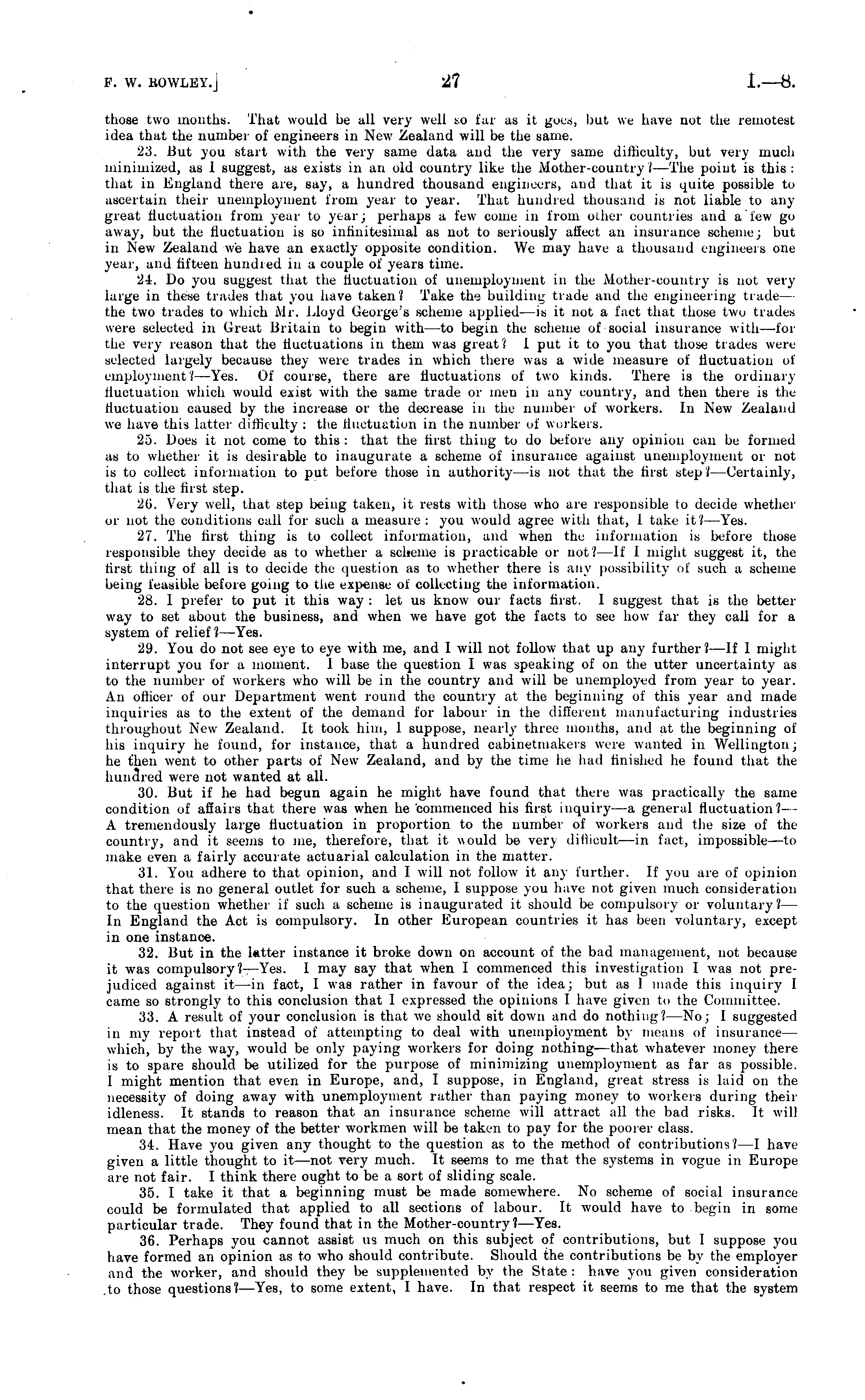 those two months. That would be all very well so far us it goes, but we have not the remotest idea that the number of engineers in New Zealand will be the same. 23. But you start with the very same data and the very same difficulty, but very much minimized, as 1 suggest, as exists in an old country like the Mother-country I—The1 —The point is this: that in England there are, say, a hundred thousand engineers, and that it is quite possible to ascertain their unemployment from year to year. That hundred thousand is not liable to any great fluctuation from year to year; perhaps a few come in from other countries and a lew go away, but the fluctuation is so infinitesimal as not to seriously affect an insurance scheme; but in New Zealand we have an exactly opposite condition. We may have a thousand engineers one year, and fifteen hundred in a couple of years time. 2-i. Do you suggest that the fluctuation of unemployment in the Mother-country is not very large in these trades that you have taken? Take thy building trade and the engineering trade the two trades to which Mr. Lloyd George's scheme applied—is it not a fact that those two trades were selected in Great Britain to begin with—to begin the scheme of social insurance with— for the very reason that the fluctuations in them was great.' 1 put it to you that those trades were selected largely because they were trades in which there was a wide measure of fluctuation of employment.' —Yes. Of course, there are fluctuations of two kinds. There is the ordinary iluctuation which would exist with the same trade or men in any country, and then there is the fluctuation caused by the increase or the decrease in the number of workers. In New Zealand we have this latter difficulty : the fluctuation in the number of workers. 25. Does it not come to this : that the first thing to do before any opinion can be formed as to whether it is desirable to inaugurate a scheme of insurance against unemployment or not is to collect information to put before those in authority —is not that the first step?— Certainly, that is the first step. 20. Very well, that step being taken, it rests with those who are responsible to decide whether or not the conditions call for such a measure: you would agree with that, f take it?— Yes. 27. The first thing is to collect information, and when the in formation is before those responsible they decide as to whether a scheme is practicable or not? —If 1 might suggest it, the first thing of all is to decide the question as to whether there is any possibility of such a scheme being feasible before going to the expense of collecting the information. 28. 1 prefer to put it this way : let us know our facts first. 1 suggest that is the better way to set about the business, and when we have got the facts to see how far they call for a system of relief? —Yes. 29. You do not see eye to eye with me, and 1 will not follow that up any further?—lf 1 might interrupt you for a moment. 1 base the question I was speaking of on the utter uncertainty as to the number of workers who will be in the country anil will be unemployed from year to year. An officer of our Department went round the country at the beginning of this year and made inquiries as to the extent of the demand for labour in the different manufacturing industries throughout New Zealand. It took him, 1 suppose, nearly three months, and at the beginning of his inquiry he found, for instance, that a hundred cabinetmakers were wanted in Wellington; he then went to other parts of New Zealand, and by the time lie hail finished he found that the hundred were not wanted at all. 30. But if he had begun again he might have found that there was practically the same condition of affairs that there was when he commenced his first inquiry—a general fluctuation?— A tremendously large fluctuation in proportion to the number of workers and the size of the country, and it seems to me, therefore, that it would be very difficult —in fact, impossible—to make even a fairly accurate actuarial calculation in the matter. 31. You adhere to that opinion, and I will not follow it any further. If you are of opinion that there is no general outlet for such a scheme, I suppose you have not given much consideration to the question whether if such a scheme is inaugurated it should be compulsory or voluntary?— In England the Act is compulsory. In other European countries it has been voluntary, except in one instance. 32. But in the tatter instance it broke down on account of the bad management, not because it was compulsory? —Yes. I may say that when I commenced this investigation I was not prejudiced against it —in fact, I was rather in favour of the idea ; but as I made this inquiry I came so strongly to this conclusion that I expressed the opinions I have given to the Committee. 33. A result of your conclusion is that we should sit down and do nothing? —No; I suggested in my report that instead of attempting to deal with unemployment by means of insurance — which, by the way, would be only paying workers for doing nothing —that whatever money there is to spare should be utilized for the purpose of minimizing unemployment as far as possible. I might mention that even in Europe, and, I suppose, in England, great stress is laid on the necessity of doing away with unemployment rather than paying money to workers during their idleness. It stands to reason that an insurance scheme will attract all the bad risks. It will mean that the money of the better workmen will be taken to pay for the poorer class. 34. Have you given any thought to the question as to the method of contributions? —I have given a little thought to it—not very much. It seems to me that the systems in vogue in Europe are not fair. I think there ought to be a sort of sliding scale. 35. I take it that a beginning must be made somewhere. No scheme of social insurance could be formulated that applied to all secti